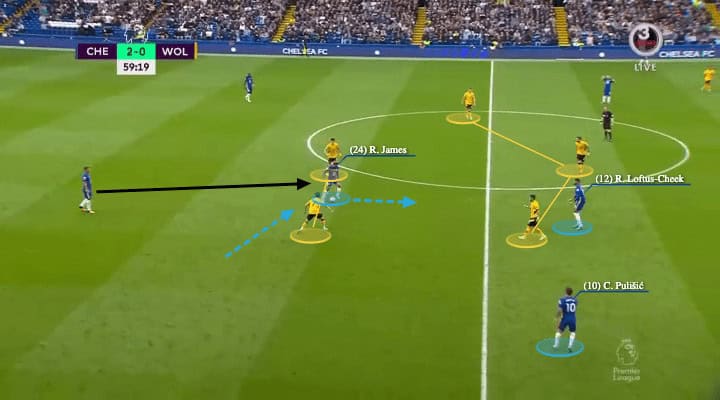 As we saw James, just one second later, with a few touches on the ball, he successfully attracted as many as FOUR Wolves players, and the block lost its shape and occupation of space, as a result of James’ action. Then, the Englishman defender was also calm enough to connect Pulisic, whose spaces was created by the actions of James and now Chelsea went all the way to face the last line.