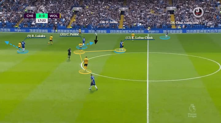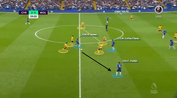 Then, Chelsea also had other two players to support as Loftus-Cheek moved higher, alongside Pulisic who came to the outside of the shape. Again, is this the moment to pass? Maybe it was, but James was able to give even more to the team.