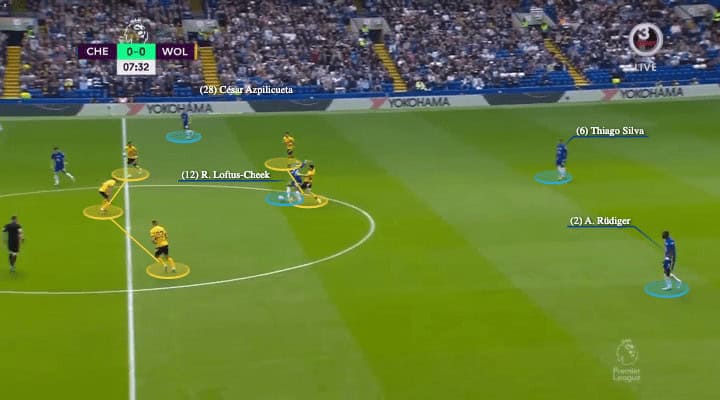 At the first glance, Silva and Rüdiger might be viable options but is this the right moment to pass? If you took a step back and think it again, it was not, because Dendoncker and Jiménez were lurking. To Rüdiger on the far side, the passing distance was too big and it was possible for Dendoncker to catch. And to Silva, Jiménez was very close and the Mexican forward was very capable of pressing in these situations.