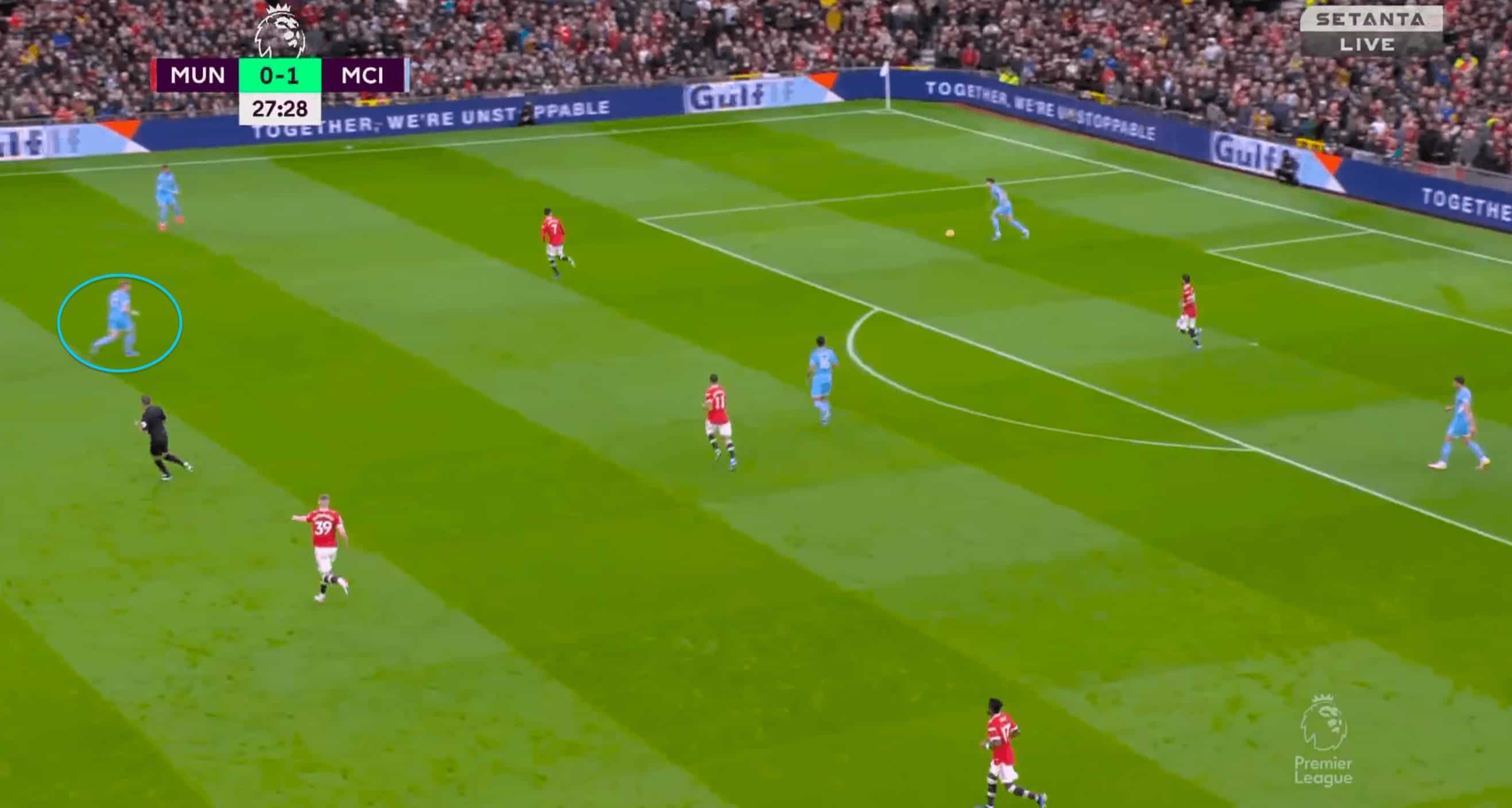 We can see Foden making a run like that on the blindside of AWB when he goes out to press Cancelo and Bailly being very narrower means that Gundogan can slide the ball to him.