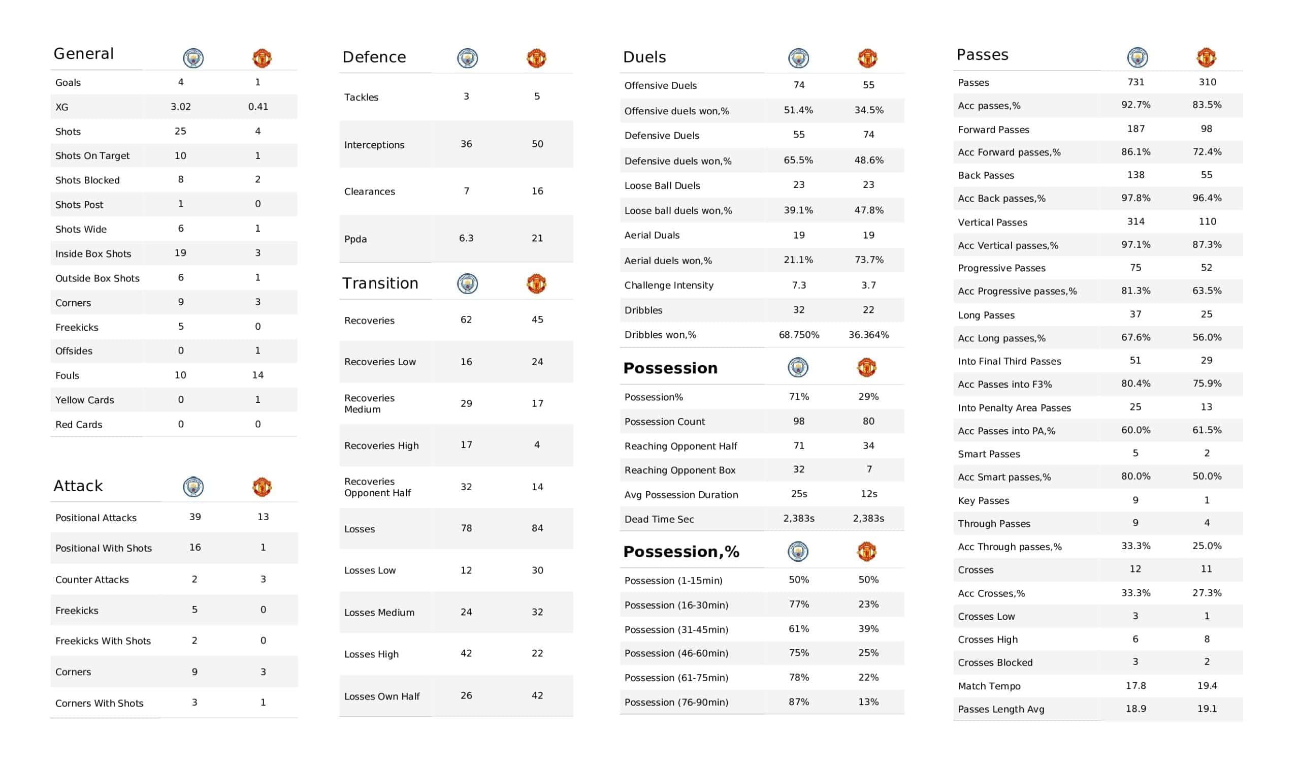 Sunday evening saw <a href="https://totalfootballanalysis.com/match-analysis/premier-league-2021-22-man-city-vs-spurs-post-match-data-viz-and-stats">Man City</a> blow <a href="https://totalfootballanalysis.com/match-analysis/premier-league-2021-22-man-united-vs-watford-data-viz-stats-and-insights">Man United</a> away 4-1 in the <a href="https://totalfootballanalysis.com/match-analysis/free-download-premier-league-gw8-analytics-reports-data-viz-and-stats">Premier League</a>. We've broken down all the key <a href="https://totalfootballanalysis.com/match-analysis/free-download-premier-league-gw8-analytics-reports-data-viz-and-stats">stats</a> for you to digest in this tactical analysis and provide <a href="https://totalfootballanalysis.com/player-analysis/but-what-does-that-visual-actually-tell-us">insights</a> around; * shot maps and set-pieces * xT (expected threat) * pass networks * xG timelines * defensive duels * average positions and much more! We also try to answer some questions for you with the visuals; Who was City's biggest threat? Who made the most recoveries in the opposition half? Who had the highest xG in the match? To navigate the stats gallery simply click on the numbers to move through the pages. <em><strong>Don't forget, if you take out a free <a href="https://totalfootballanalysis.com/subscribe">membership</a> to Total Football Analysis, you can receive our weekly Premier League Analytics Pack free of charge which includes all the analytics from every match, team benchmarking tables and player benchmarking tables - well over 150 pages of information after every matchweek is complete!</strong></em> <h2><em>Lineups and average positions</em></h2> <a href="https://totalfootballanalysis.com/wp-content/uploads/2022/03/Man-City-vs-Man-United_page-0002-scaled.jpg"><img class="aligncenter size-large wp-image-300620" src="https://totalfootballanalysis.com/wp-content/uploads/2022/03/Man-City-vs-Man-United_page-0002-1024x602.jpg" alt="Premier League 2021/22: Man City vs Man United - data viz, stats and insights" width="640" height="376" /></a> <a href="https://totalfootballanalysis.com/wp-content/uploads/2022/03/Man-City-vs-Man-United_page-0003-scaled.jpg"><img class="aligncenter size-large wp-image-300621" src="https://totalfootballanalysis.com/wp-content/uploads/2022/03/Man-City-vs-Man-United_page-0003-1024x602.jpg" alt="Premier League 2021/22: Man City vs Man United - data viz, stats and insights" width="640" height="376" /></a> <a href="https://totalfootballanalysis.com/wp-content/uploads/2022/03/Man-City-vs-Man-United_page-0004-scaled.jpg"><img class="aligncenter size-large wp-image-300622" src="https://totalfootballanalysis.com/wp-content/uploads/2022/03/Man-City-vs-Man-United_page-0004-1024x602.jpg" alt="Premier League 2021/22: Man City vs Man United - data viz, stats and insights" width="640" height="376" /></a> <a href="https://totalfootballanalysis.com/wp-content/uploads/2022/03/Man-City-vs-Man-United_page-0005-scaled.jpg"><img class="aligncenter size-large wp-image-300623" src="https://totalfootballanalysis.com/wp-content/uploads/2022/03/Man-City-vs-Man-United_page-0005-1024x602.jpg" alt="Premier League 2021/22: Man City vs Man United - data viz, stats and insights" width="640" height="376" /></a><!--nextpage--> <h2><em>Stats and shot maps </em></h2> <a href="https://totalfootballanalysis.com/wp-content/uploads/2022/03/Man-City-vs-Man-United_page-0006-scaled.jpg"><img class="aligncenter size-large wp-image-300624" src="https://totalfootballanalysis.com/wp-content/uploads/2022/03/Man-City-vs-Man-United_page-0006-1024x602.jpg" alt="Premier League 2021/22: Man City vs Man United - data viz, stats and insights" width="640" height="376" /></a> <a href="https://totalfootballanalysis.com/wp-content/uploads/2022/03/Man-City-vs-Man-United_page-0007-scaled.jpg"><img class="aligncenter size-large wp-image-300625" src="https://totalfootballanalysis.com/wp-content/uploads/2022/03/Man-City-vs-Man-United_page-0007-1024x602.jpg" alt="Premier League 2021/22: Man City vs Man United - data viz, stats and insights" width="640" height="376" /></a> <a href="https://totalfootballanalysis.com/wp-content/uploads/2022/03/Man-City-vs-Man-United_page-0008-scaled.jpg"><img class="aligncenter size-large wp-image-300626" src="https://totalfootballanalysis.com/wp-content/uploads/2022/03/Man-City-vs-Man-United_page-0008-1024x602.jpg" alt="Premier League 2021/22: Man City vs Man United - data viz, stats and insights" width="640" height="376" /></a> <a href="https://totalfootballanalysis.com/wp-content/uploads/2022/03/Man-City-vs-Man-United_page-0009-scaled.jpg"><img class="aligncenter size-large wp-image-300627" src="https://totalfootballanalysis.com/wp-content/uploads/2022/03/Man-City-vs-Man-United_page-0009-1024x602.jpg" alt="Premier League 2021/22: Man City vs Man United - data viz, stats and insights" width="640" height="376" /></a><!--nextpage--> <h2><em>xT and xG timelines plus pass matrixes</em></h2> <a href="https://totalfootballanalysis.com/wp-content/uploads/2022/03/Man-City-vs-Man-United_page-0010-scaled.jpg"><img class="aligncenter size-large wp-image-300628" src="https://totalfootballanalysis.com/wp-content/uploads/2022/03/Man-City-vs-Man-United_page-0010-1024x602.jpg" alt="Premier League 2021/22: Man City vs Man United - data viz, stats and insights" width="640" height="376" /></a> <a href="https://totalfootballanalysis.com/wp-content/uploads/2022/03/Man-City-vs-Man-United_page-0011-scaled.jpg"><img class="aligncenter size-large wp-image-300629" src="https://totalfootballanalysis.com/wp-content/uploads/2022/03/Man-City-vs-Man-United_page-0011-1024x602.jpg" alt="Premier League 2021/22: Man City vs Man United - data viz, stats and insights" width="640" height="376" /></a> <a href="https://totalfootballanalysis.com/wp-content/uploads/2022/03/Man-City-vs-Man-United_page-0012-scaled.jpg"><img class="aligncenter size-large wp-image-300630" src="https://totalfootballanalysis.com/wp-content/uploads