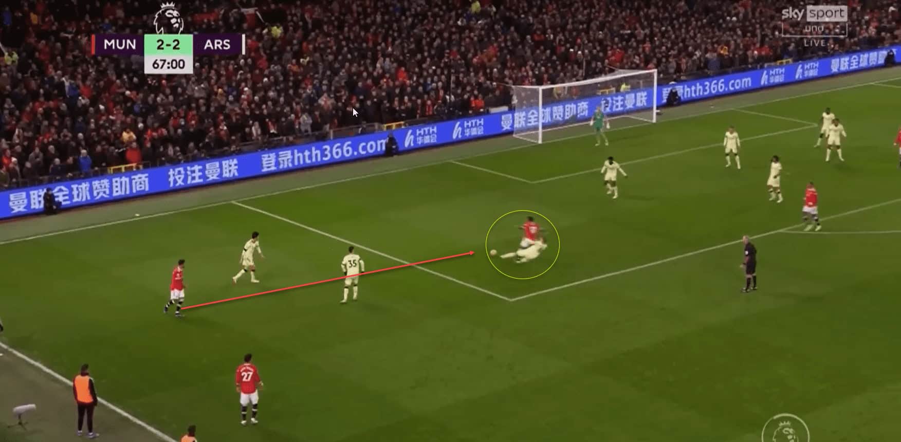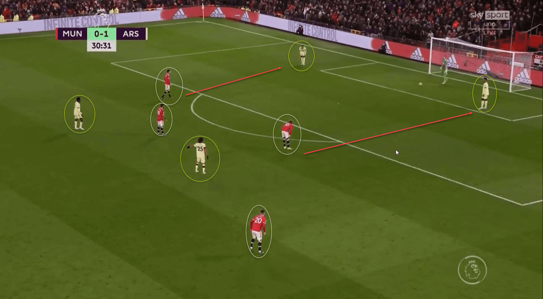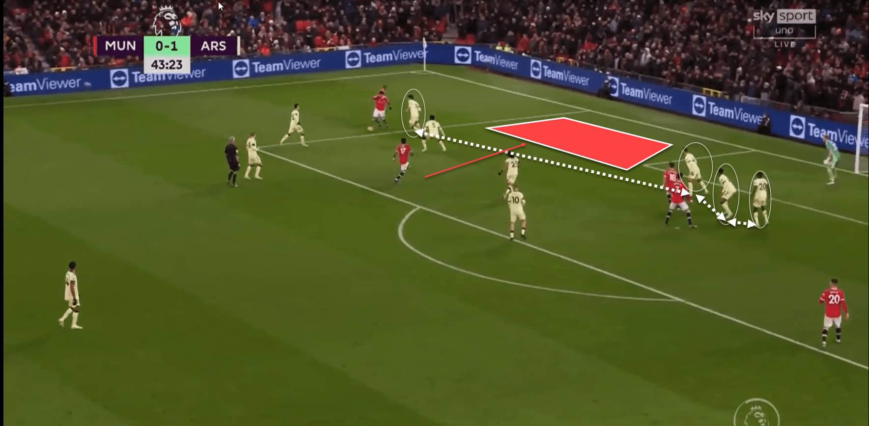 The Arsenal backline is too deep here, this is highlighted by the fact both Tavares and Gabriel are practically marking each other when Sancho is in the 1 v 1 situation. Something which Arsenal were doing effectively early in the game became a significant disadvantage and an area for Manchester United to expose.