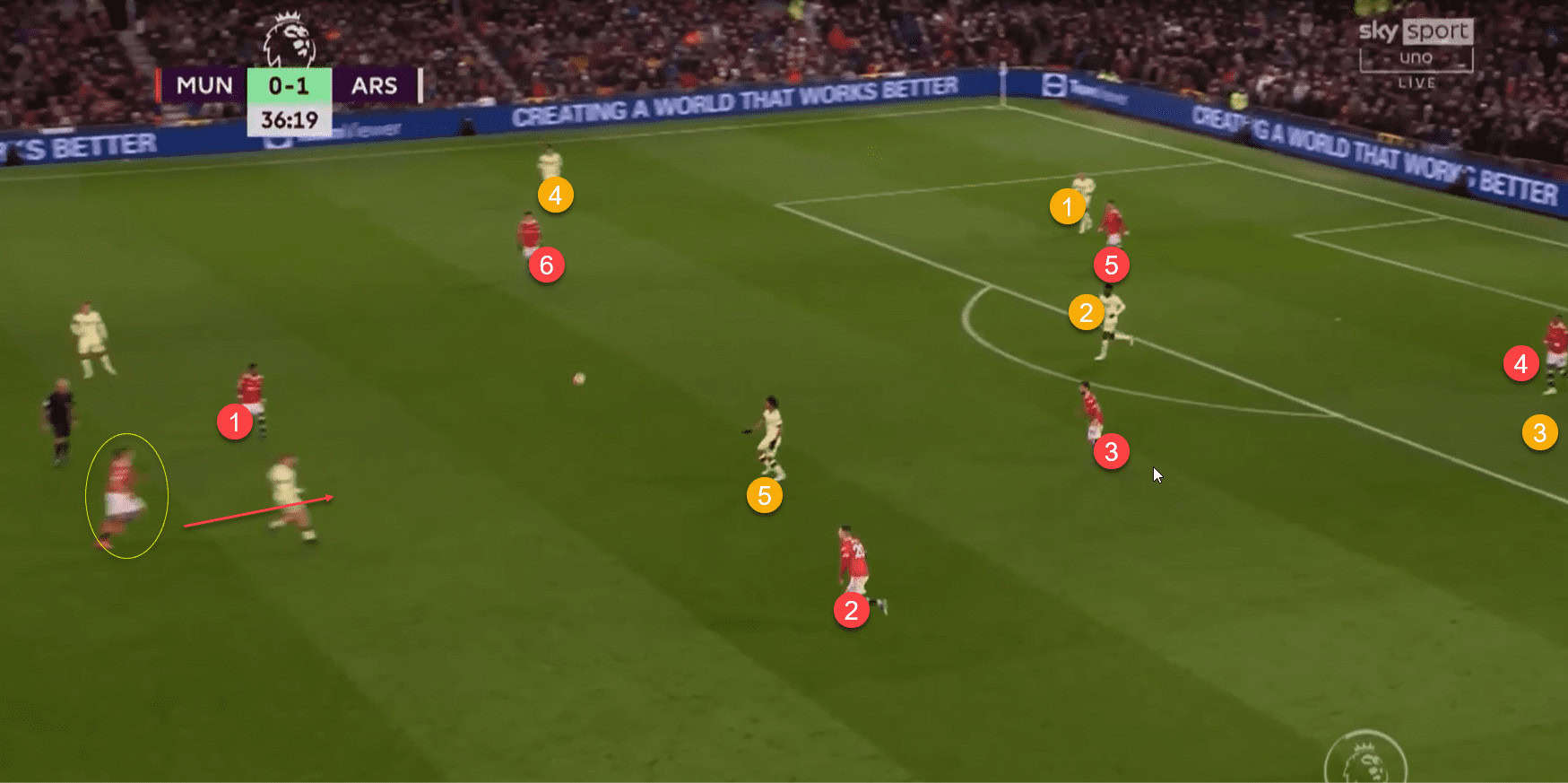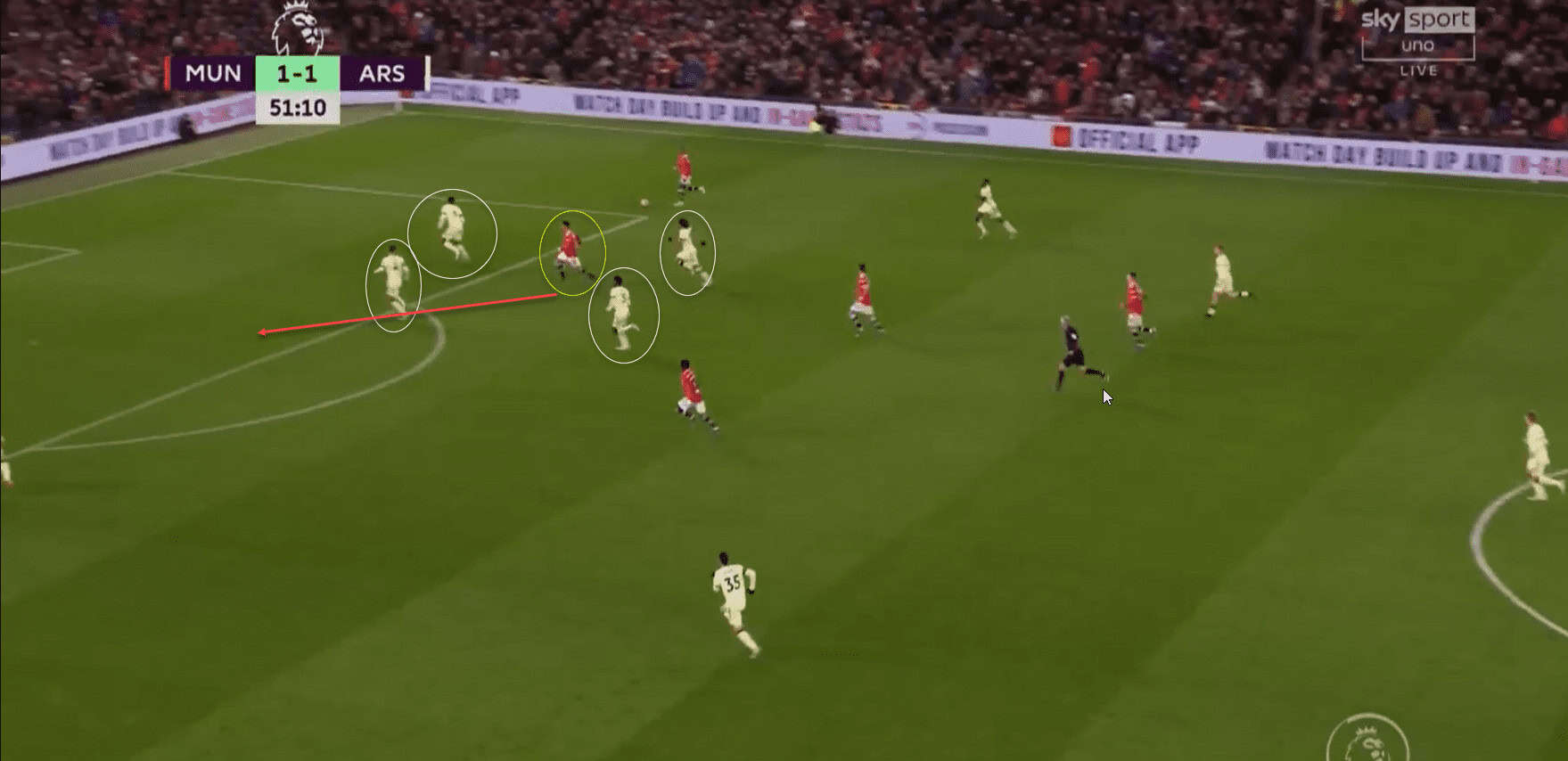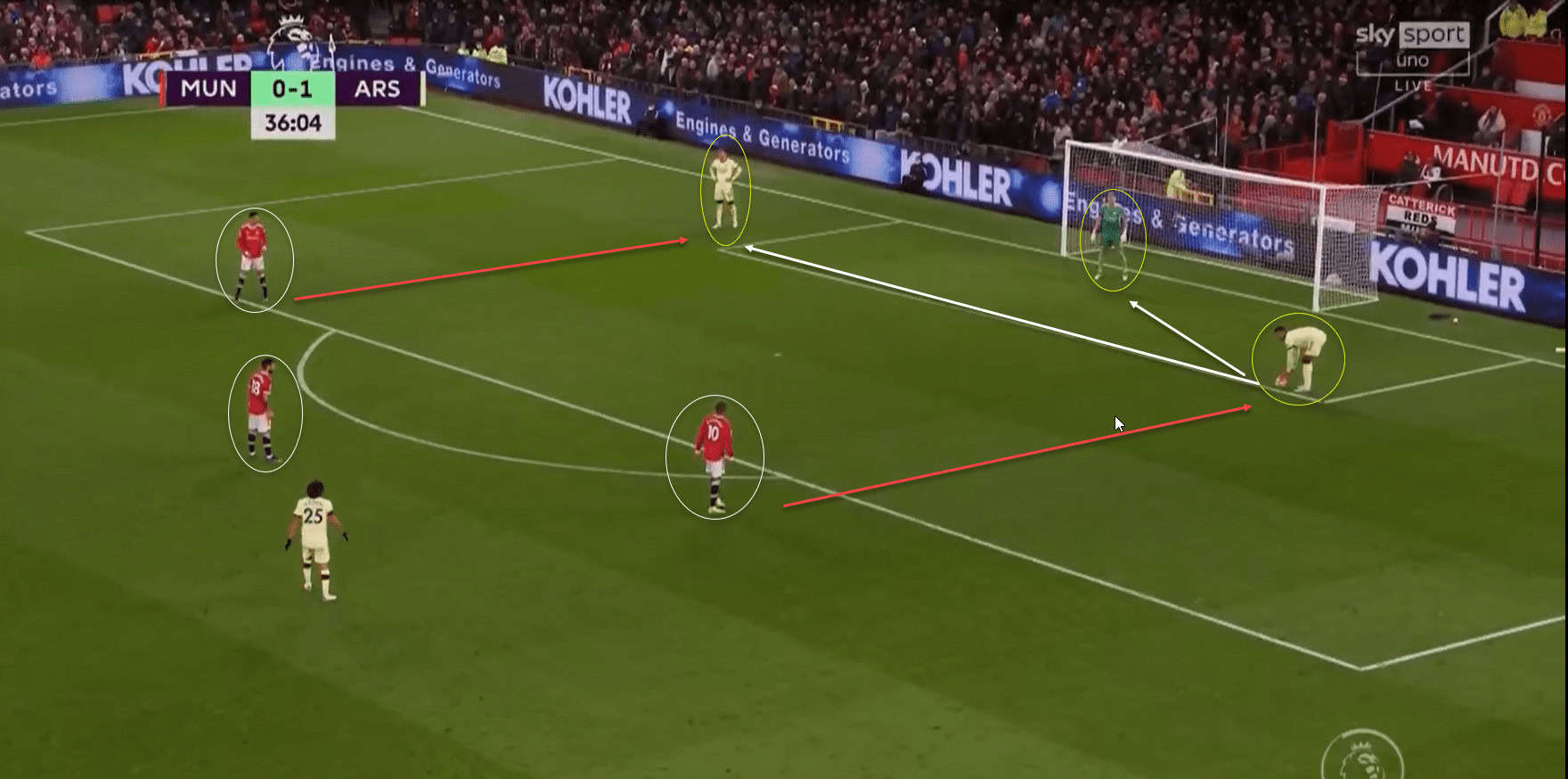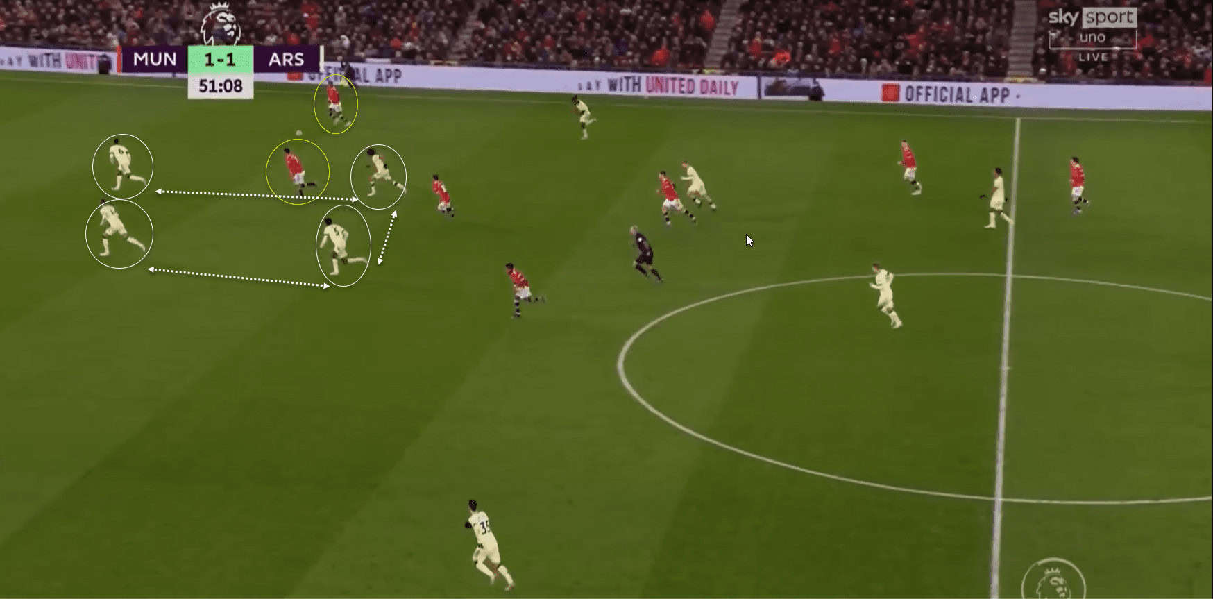 The Arsenal backline is too deep here, this is highlighted by the fact both Tavares and Gabriel are practically marking each other when Sancho is in the 1 v 1 situation. Something which Arsenal were doing effectively early in the game became a significant disadvantage and an area for Manchester United to expose.