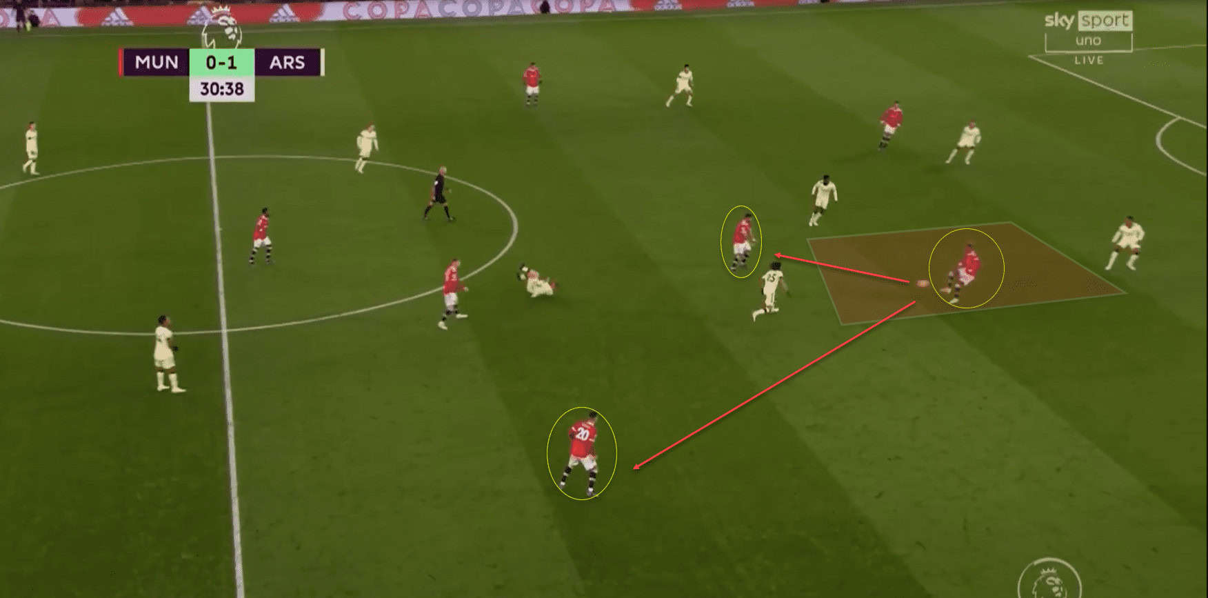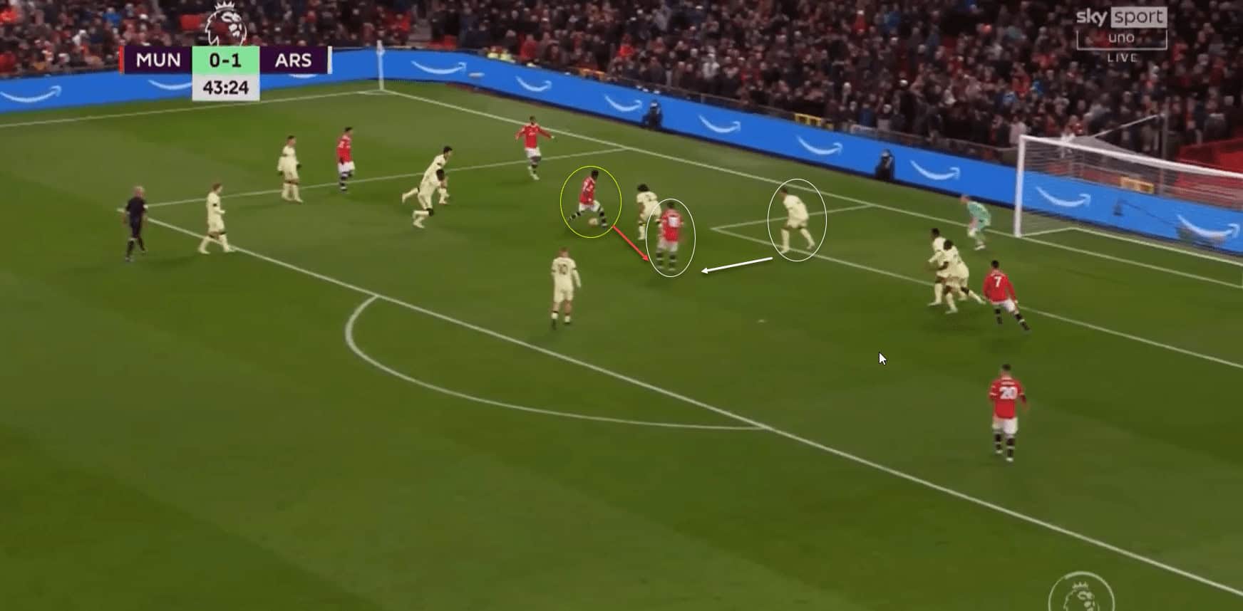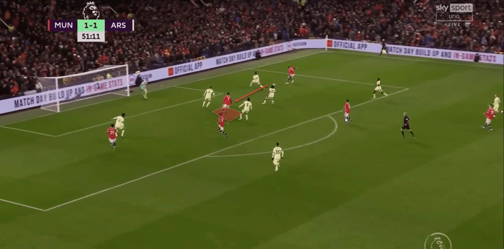 Maguire plays the ball to Sancho who stays wide and draws Tomiyasu out to deal with him. The presence of Fernandes and Ronaldo in the box means White and Gabriel are drawn deep into the box which leaves a significant space in the Arsenal back four. This creates the opportunity for Fred to make a run into the space. This is also made possible by the fact the poor clearance from White meant Martinelli wasn’t in position and therefore meant Partey was drawn out to deal with Telles.