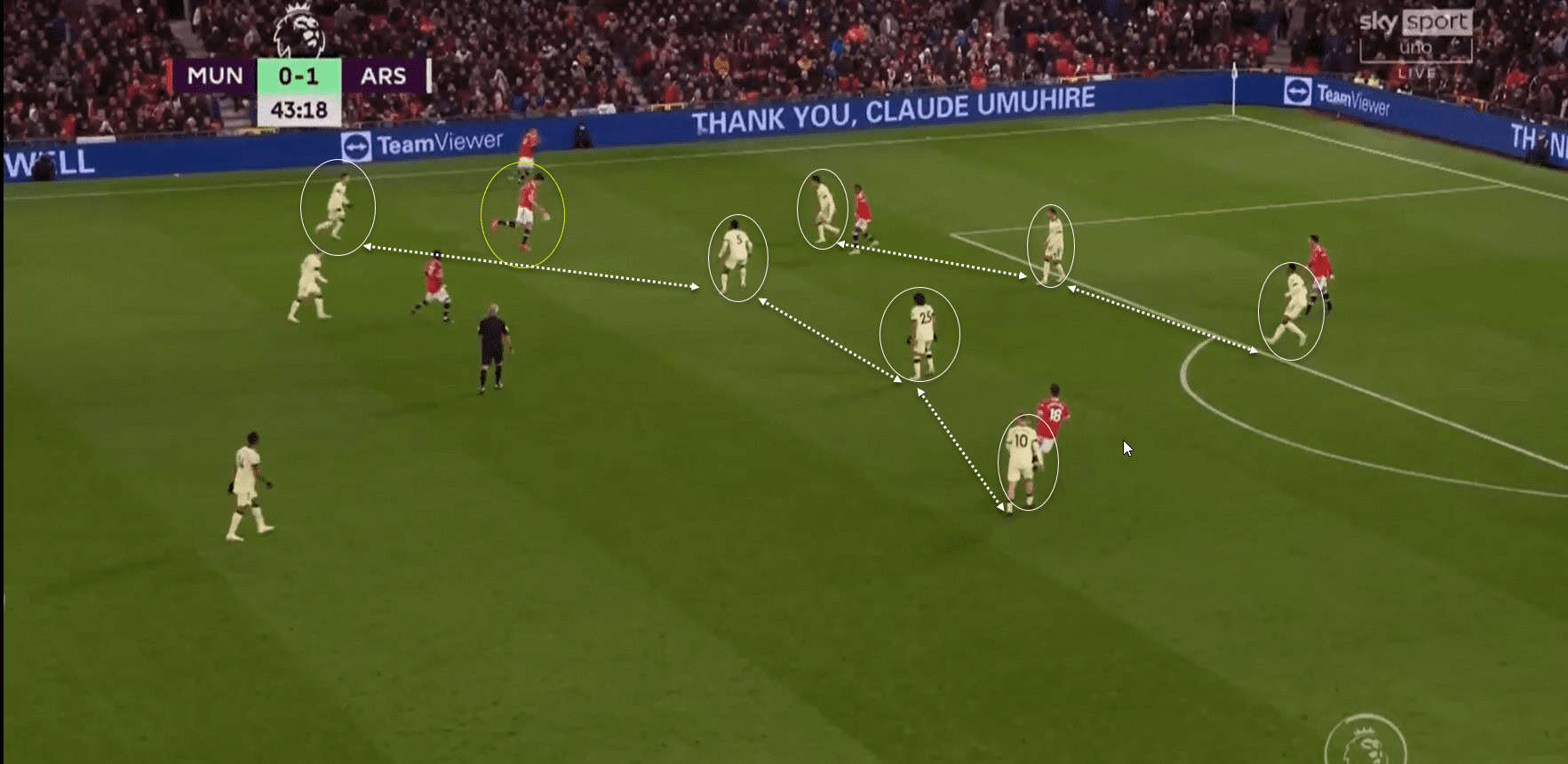 They were aiming to draw out the United attackers and create a pocket of space to drop the ball into. However, this failed as Maguire had pushed up to challenge Smith-Rowe. This again leads to a Manchester United United turnover high up the field in the opposition half, in a poor defensive structure.