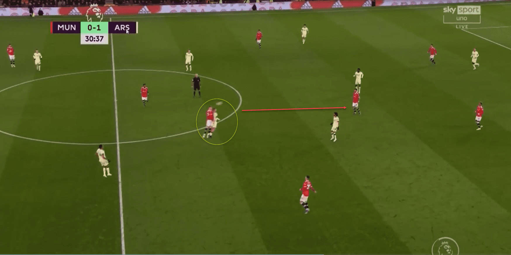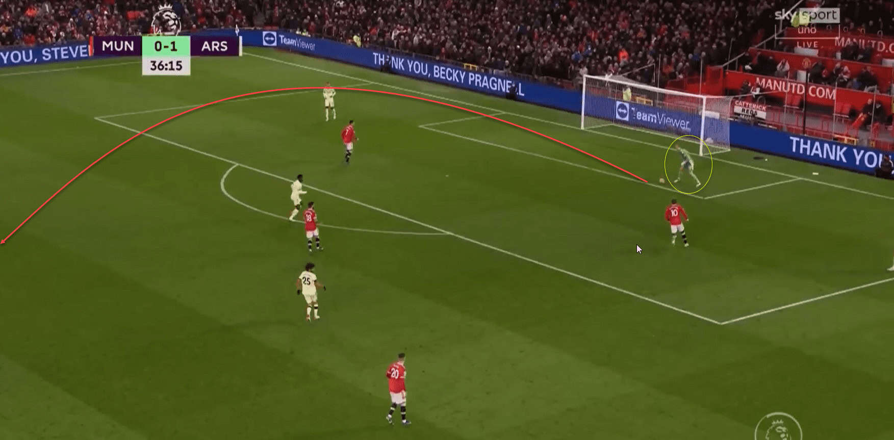 Below is the resulting long ball from Ramsdale which doesn’t leave the Arsenal half and creates an aerial duel between McTominay and Smith-Rowe which McTominay dominates and means Manchester United now have the ball in the opposition half.