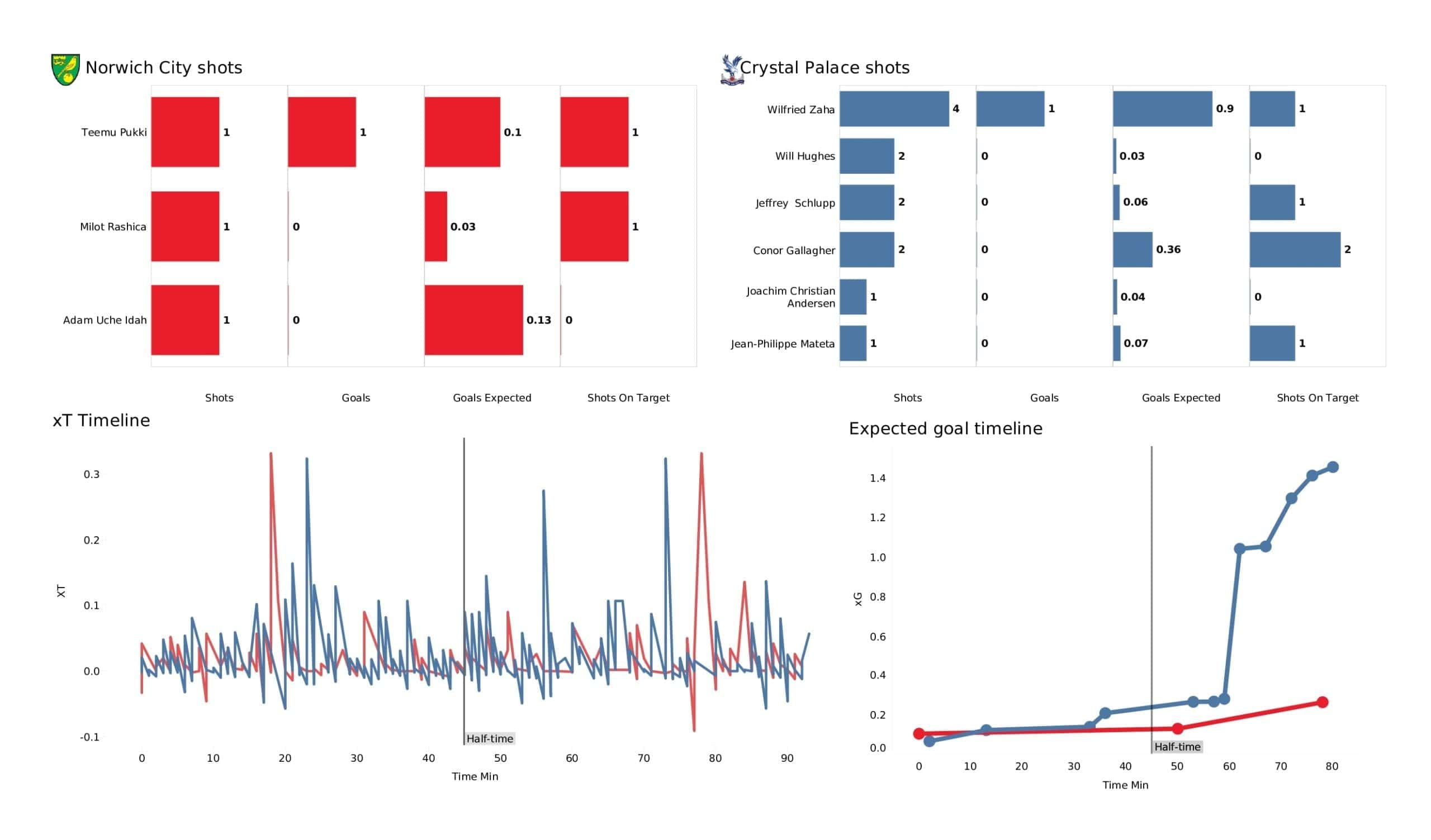 Wednesday evening saw <a href="https://totalfootballanalysis.com/match-analysis/premier-league-2021-22-watford-vs-norwich-post-match-data-viz-and-stats">Norwich</a> and <a href="https://totalfootballanalysis.com/match-analysis/premier-league-2021-22-brighton-vs-crystal-palace-tactical-analysis-tactics">Crystal Palace</a> draw 1-1 in the <a href="https://totalfootballanalysis.com/match-analysis/free-download-premier-league-gw8-analytics-reports-data-viz-and-stats">Premier League</a>. We've broken down all the key <a href="https://totalfootballanalysis.com/match-analysis/free-download-premier-league-gw8-analytics-reports-data-viz-and-stats">stats</a> for you to digest in this tactical analysis, including; * shot maps * xT (expected threat) * pass networks * xG timelines * defensive duels * average positions and much more! We also try to answer some questions for you with the visuals; Who was Norwich's biggest threat? Who made the most recoveries in the opposition half? Who had the highest xG in the match? To navigate the stats gallery simply click on the numbers to move through the pages. <em><strong>Don't forget, if you take out a free <a href="https://totalfootballanalysis.com/subscribe">membership</a> to Total Football Analysis, you can receive our weekly Premier League Analytics Pack free of charge which includes all the analytics from every match, team benchmarking tables and player benchmarking tables - well over 150 pages of information after every matchweek is complete!</strong></em> <a href="https://totalfootballanalysis.com/wp-content/uploads/2022/02/Norwich-vs-Crystal-Palace_page-0001-scaled.jpg"><img class="aligncenter size-large wp-image-294403" src="https://totalfootballanalysis.com/wp-content/uploads/2022/02/Norwich-vs-Crystal-Palace_page-0001-1024x602.jpg" alt="Premier League 2021/22: Norwich vs Crystal Palace - post-match data viz and stats" width="640" height="376" /></a><!--nextpage--> <a href="https://totalfootballanalysis.com/wp-content/uploads/2022/02/Norwich-vs-Crystal-Palace_page-0002-scaled.jpg"><img class="aligncenter size-large wp-image-294404" src="https://totalfootballanalysis.com/wp-content/uploads/2022/02/Norwich-vs-Crystal-Palace_page-0002-1024x602.jpg" alt="Premier League 2021/22: Norwich vs Crystal Palace - post-match data viz and stats" width="640" height="376" /></a> <a href="https://totalfootballanalysis.com/wp-content/uploads/2022/02/Norwich-vs-Crystal-Palace_page-0003-scaled.jpg"><img class="aligncenter size-large wp-image-294405" src="https://totalfootballanalysis.com/wp-content/uploads/2022/02/Norwich-vs-Crystal-Palace_page-0003-1024x602.jpg" alt="Premier League 2021/22: Norwich vs Crystal Palace - post-match data viz and stats" width="640" height="376" /></a> <a href="https://totalfootballanalysis.com/wp-content/uploads/2022/02/Norwich-vs-Crystal-Palace_page-0004-scaled.jpg"><img class="aligncenter size-large wp-image-294406" src="https://totalfootballanalysis.com/wp-content/uploads/2022/02/Norwich-vs-Crystal-Palace_page-0004-1024x602.jpg" alt="Premier League 2021/22: Norwich vs Crystal Palace - post-match data viz and stats" width="640" height="376" /></a> <a href="https://totalfootballanalysis.com/wp-content/uploads/2022/02/Norwich-vs-Crystal-Palace_page-0005-scaled.jpg"><img class="aligncenter size-large wp-image-294407" src="https://totalfootballanalysis.com/wp-content/uploads/2022/02/Norwich-vs-Crystal-Palace_page-0005-1024x602.jpg" alt="Premier League 2021/22: Norwich vs Crystal Palace - post-match data viz and stats" width="640" height="376" /></a><!--nextpage--> <a href="https://totalfootballanalysis.com/wp-content/uploads/2022/02/Norwich-vs-Crystal-Palace_page-0006-scaled.jpg"><img class="aligncenter size-large wp-image-294408" src="https://totalfootballanalysis.com/wp-content/uploads/2022/02/Norwich-vs-Crystal-Palace_page-0006-1024x602.jpg" alt="Premier League 2021/22: Norwich vs Crystal Palace - post-match data viz and stats" width="640" height="376" /></a> <a href="https://totalfootballanalysis.com/wp-content/uploads/2022/02/Norwich-vs-Crystal-Palace_page-0007-scaled.jpg"><img class="aligncenter size-large wp-image-294409" src="https://totalfootballanalysis.com/wp-content/uploads/2022/02/Norwich-vs-Crystal-Palace_page-0007-1024x602.jpg" alt="Premier League 2021/22: Norwich vs Crystal Palace - post-match data viz and stats" width="640" height="376" /></a> <a href="https://totalfootballanalysis.com/wp-content/uploads/2022/02/Norwich-vs-Crystal-Palace_page-0008-scaled.jpg"><img class="aligncenter size-large wp-image-294410" src="https://totalfootballanalysis.com/wp-content/uploads/2022/02/Norwich-vs-Crystal-Palace_page-0008-1024x602.jpg" alt="Premier League 2021/22: Norwich vs Crystal Palace - post-match data viz and stats" width="640" height="376" /></a> <a href="https://totalfootballanalysis.com/wp-content/uploads/2022/02/Norwich-vs-Crystal-Palace_page-0009-scaled.jpg"><img class="aligncenter size-large wp-image-294411" src="https://totalfootballanalysis.com/wp-content/uploads/2022/02/Norwich-vs-Crystal-Palace_page-0009-1024x602.jpg" alt="Premier League 2021/22: Norwich vs Crystal Palace - post-match data viz and stats" width="640" height="376" /></a><!--nextpage--> <a href="https://totalfootballanalysis.com/wp-content/uploads/2022/02/Norwich-vs-Crystal-Palace_page-0010-scaled.jpg"><img class="aligncenter size-large wp-image-294412" src="https://totalfootballanalysis.com/wp-content/uploads/2022/02/Norwich-vs-Crystal-Palace_page-0010-1024x602.jpg" alt="Premier League 2021/22: Norwich vs Crystal Palace - post-match data viz and stats" width="640" height="376" /></a> <a href="https://totalfootballanalysis.com/wp-content/uploads/2022/02/Norwich-vs-Crystal-Palace_page-0011-scaled.jpg"><img class="aligncenter size-large wp-image-294413" src="https://totalfootballanalysis.com/wp-content/uploads/2022/02/Norwich-vs-Crystal-Palace_page-0011-1024x602.jpg" alt="Premier League 2021/22: Norwich vs Crystal Palace - post-match data viz and stats" width=