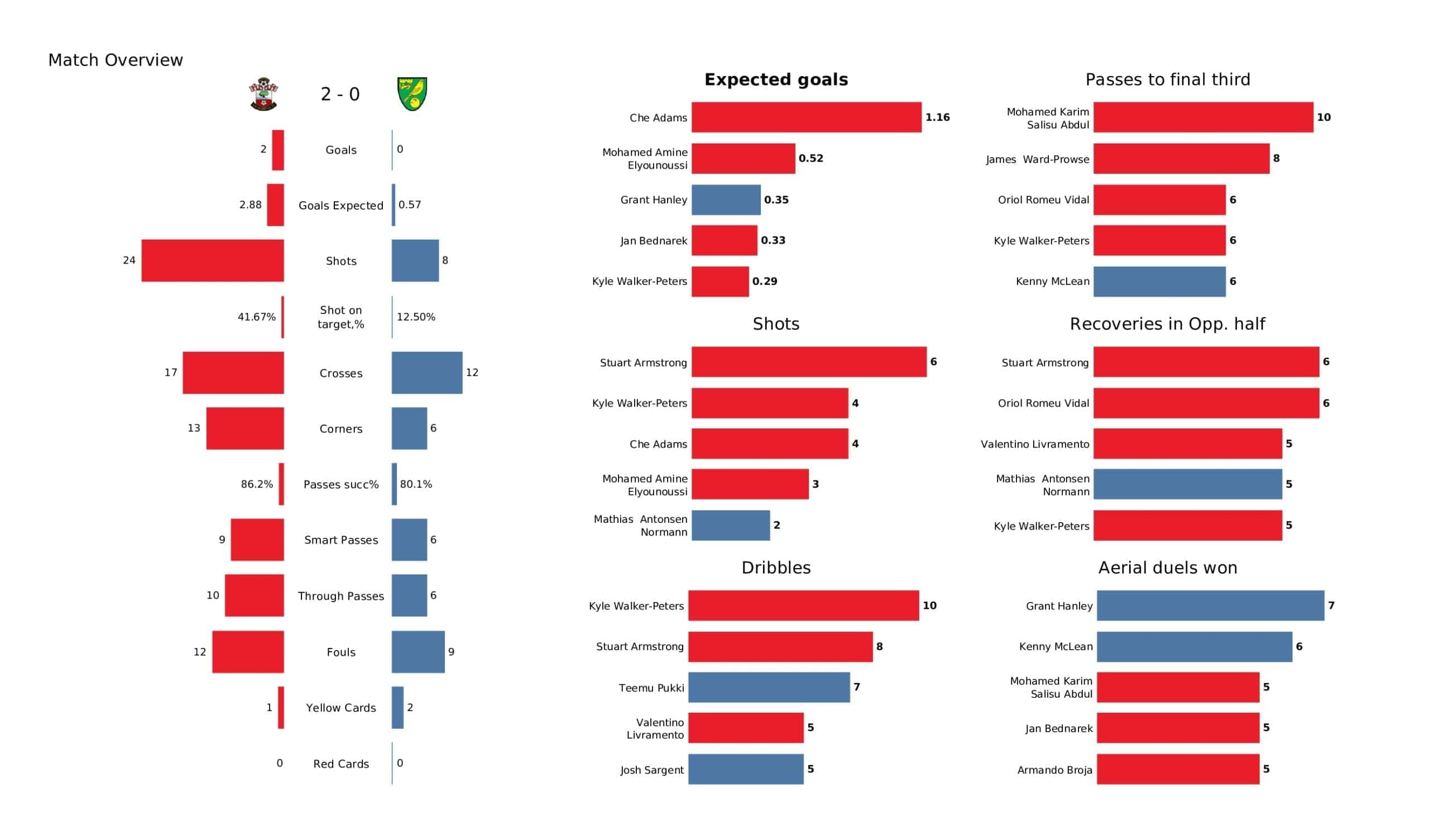 Friday night saw <a href="https://totalfootballanalysis.com/match-analysis/premier-league-2021-22-southampton-vs-everton-post-match-data-viz-and-stats">Southampton</a> continue their good form beating <a href="https://totalfootballanalysis.com/match-analysis/premier-league-2021-22-liverpool-vs-norwich-post-match-data-viz-and-stats">Norwich</a> 2-0 in the <a href="https://totalfootballanalysis.com/match-analysis/free-download-premier-league-gw8-analytics-reports-data-viz-and-stats">Premier League</a>. We've broken down all the key <a href="https://totalfootballanalysis.com/match-analysis/free-download-premier-league-gw8-analytics-reports-data-viz-and-stats">stats</a> for you to digest in this tactical analysis, including; <strong>New in February - set pieces!</strong> Plus... * shot maps * xT (expected threat) * pass networks * xG timelines * defensive duels * average positions and much more! We also try to answer some questions for you with the visuals; Who was Southampton's biggest threat? Who made the most recoveries in the opposition half? Who had the highest xG in the match? To navigate the stats gallery simply click on the numbers to move through the pages. <em><strong>Don't forget, if you take out a free <a href="https://totalfootballanalysis.com/subscribe">membership</a> to Total Football Analysis, you can receive our weekly Premier League Analytics Pack free of charge which includes all the analytics from every match, team benchmarking tables and player benchmarking tables - well over 150 pages of information after every matchweek is complete!</strong></em> <a href="https://totalfootballanalysis.com/wp-content/uploads/2022/02/Southampton-vs-Norwich_page-0002-scaled.jpg"><img class="aligncenter size-large wp-image-298112" src="https://totalfootballanalysis.com/wp-content/uploads/2022/02/Southampton-vs-Norwich_page-0002-1024x602.jpg" alt="Premier League 2021/22: Southampton vs Norwich - post-match data viz and stats" width="640" height="376" /></a> <a href="https://totalfootballanalysis.com/wp-content/uploads/2022/02/Southampton-vs-Norwich_page-0003-scaled.jpg"><img class="aligncenter size-large wp-image-298113" src="https://totalfootballanalysis.com/wp-content/uploads/2022/02/Southampton-vs-Norwich_page-0003-1024x602.jpg" alt="Premier League 2021/22: Southampton vs Norwich - post-match data viz and stats" width="640" height="376" /></a> <a href="https://totalfootballanalysis.com/wp-content/uploads/2022/02/Southampton-vs-Norwich_page-0004-scaled.jpg"><img class="aligncenter size-large wp-image-298114" src="https://totalfootballanalysis.com/wp-content/uploads/2022/02/Southampton-vs-Norwich_page-0004-1024x602.jpg" alt="Premier League 2021/22: Southampton vs Norwich - post-match data viz and stats" width="640" height="376" /></a> <a href="https://totalfootballanalysis.com/wp-content/uploads/2022/02/Southampton-vs-Norwich_page-0005-scaled.jpg"><img class="aligncenter size-large wp-image-298115" src="https://totalfootballanalysis.com/wp-content/uploads/2022/02/Southampton-vs-Norwich_page-0005-1024x602.jpg" alt="Premier League 2021/22: Southampton vs Norwich - post-match data viz and stats" width="640" height="376" /></a><!--nextpage--> <a href="https://totalfootballanalysis.com/wp-content/uploads/2022/02/Southampton-vs-Norwich_page-0006-scaled.jpg"><img class="aligncenter size-large wp-image-298116" src="https://totalfootballanalysis.com/wp-content/uploads/2022/02/Southampton-vs-Norwich_page-0006-1024x602.jpg" alt="Premier League 2021/22: Southampton vs Norwich - post-match data viz and stats" width="640" height="376" /></a> <a href="https://totalfootballanalysis.com/wp-content/uploads/2022/02/Southampton-vs-Norwich_page-0007-scaled.jpg"><img class="aligncenter size-large wp-image-298117" src="https://totalfootballanalysis.com/wp-content/uploads/2022/02/Southampton-vs-Norwich_page-0007-1024x602.jpg" alt="Premier League 2021/22: Southampton vs Norwich - post-match data viz and stats" width="640" height="376" /></a> <a href="https://totalfootballanalysis.com/wp-content/uploads/2022/02/Southampton-vs-Norwich_page-0008-scaled.jpg"><img class="aligncenter size-large wp-image-298118" src="https://totalfootballanalysis.com/wp-content/uploads/2022/02/Southampton-vs-Norwich_page-0008-1024x602.jpg" alt="Premier League 2021/22: Southampton vs Norwich - post-match data viz and stats" width="640" height="376" /></a> <a href="https://totalfootballanalysis.com/wp-content/uploads/2022/02/Southampton-vs-Norwich_page-0009-scaled.jpg"><img class="aligncenter size-large wp-image-298119" src="https://totalfootballanalysis.com/wp-content/uploads/2022/02/Southampton-vs-Norwich_page-0009-1024x602.jpg" alt="Premier League 2021/22: Southampton vs Norwich - post-match data viz and stats" width="640" height="376" /></a><!--nextpage--> <a href="https://totalfootballanalysis.com/wp-content/uploads/2022/02/Southampton-vs-Norwich_page-0010-scaled.jpg"><img class="aligncenter size-large wp-image-298120" src="https://totalfootballanalysis.com/wp-content/uploads/2022/02/Southampton-vs-Norwich_page-0010-1024x602.jpg" alt="Premier League 2021/22: Southampton vs Norwich - post-match data viz and stats" width="640" height="376" /></a> <a href="https://totalfootballanalysis.com/wp-content/uploads/2022/02/Southampton-vs-Norwich_page-0011-scaled.jpg"><img class="aligncenter size-large wp-image-298121" src="https://totalfootballanalysis.com/wp-content/uploads/2022/02/Southampton-vs-Norwich_page-0011-1024x602.jpg" alt="Premier League 2021/22: Southampton vs Norwich - post-match data viz and stats" width="640" height="376" /></a> <a href="https://totalfootballanalysis.com/wp-content/uploads/2022/02/Southampton-vs-Norwich_page-0012-scaled.jpg"><img class="aligncenter size-large wp-image-298122" src="https://totalfootballanalysis.com/wp-content/uploads/2022/02/Southampton-vs-Norwich_page-0012-1024x602.jpg" alt="Premier League 2021/22: Southampton vs Norwich - post-match data viz and stats" width="640" height="376" /></a><!--nextpage