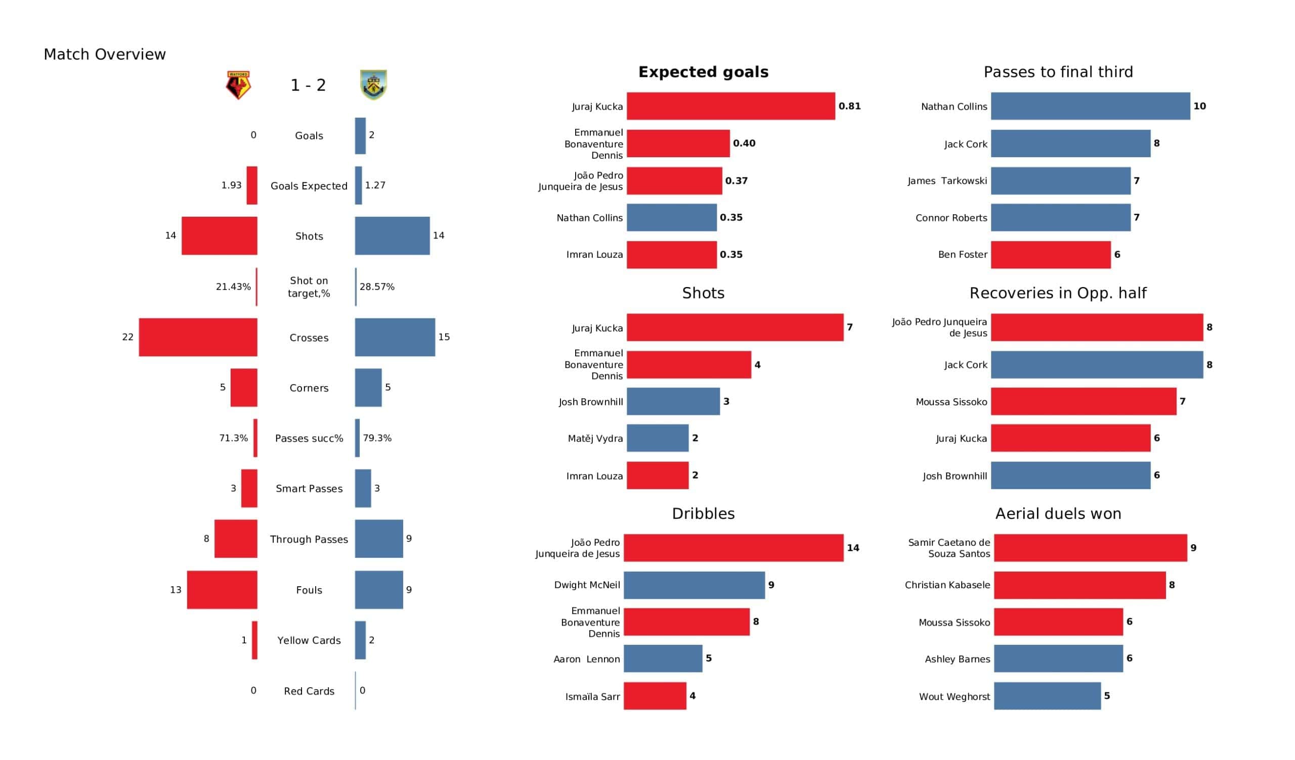 Saturday afternoon saw <a href="https://totalfootballanalysis.com/match-analysis/premier-league-2021-22-manchester-city-vs-watford-data-viz-stats-and-insights">Watford</a> welcome <a href="https://totalfootballanalysis.com/match-analysis/premier-league-2021-22-burnley-vs-wolverhampton-wanderers-data-viz-stats-and-insights">Burnley</a> in the <a href="https://totalfootballanalysis.com/match-analysis/free-download-premier-league-gw8-analytics-reports-data-viz-and-stats">Premier League</a>. We've broken down all the key <a href="https://totalfootballanalysis.com/match-analysis/free-download-premier-league-gw8-analytics-reports-data-viz-and-stats">stats</a> for you to digest in this tactical analysis and provide <a href="https://totalfootballanalysis.com/player-analysis/but-what-does-that-visual-actually-tell-us">insights</a> around; * shot maps and set-pieces * xT (expected threat) * pass networks * xG timelines * defensive duels * average positions and much more! We also try to answer some questions for you with the visuals; Who was Burnley's biggest threat? Who made the most recoveries in the opposition half? Who had the highest xG in the match? To navigate the stats gallery simply click on the numbers to move through the pages. <em><strong>Don't forget, if you take out a free <a href="https://totalfootballanalysis.com/subscribe">membership</a> to Total Football Analysis, you can receive our weekly Premier League Analytics Pack free of charge which includes all the analytics from every match, team benchmarking tables and player benchmarking tables - well over 150 pages of information after every matchweek is complete!</strong></em> <h2><em>Lineups and average positions</em></h2> <a href="https://totalfootballanalysis.com/wp-content/uploads/2022/05/Watford-vs-Burnley_page-0002-scaled.jpg"><img class="alignnone size-full wp-image-313415" src="https://totalfootballanalysis.com/wp-content/uploads/2022/05/Watford-vs-Burnley_page-0002-scaled.jpg" alt="Premier League 2021/22: Watford vs Burnley - data viz, stats and insights" width="2560" height="1504" /></a> <a href="https://totalfootballanalysis.com/wp-content/uploads/2022/05/Watford-vs-Burnley_page-0003-scaled.jpg"><img class="alignnone size-full wp-image-313416" src="https://totalfootballanalysis.com/wp-content/uploads/2022/05/Watford-vs-Burnley_page-0003-scaled.jpg" alt="Premier League 2021/22: Watford vs Burnley - data viz, stats and insights" width="2560" height="1504" /></a> <a href="https://totalfootballanalysis.com/wp-content/uploads/2022/05/Watford-vs-Burnley_page-0004-scaled.jpg"><img class="alignnone size-full wp-image-313417" src="https://totalfootballanalysis.com/wp-content/uploads/2022/05/Watford-vs-Burnley_page-0004-scaled.jpg" alt="Premier League 2021/22: Watford vs Burnley - data viz, stats and insights" width="2560" height="1504" /></a> <a href="https://totalfootballanalysis.com/wp-content/uploads/2022/05/Watford-vs-Burnley_page-0005-scaled.jpg"><img class="alignnone size-full wp-image-313418" src="https://totalfootballanalysis.com/wp-content/uploads/2022/05/Watford-vs-Burnley_page-0005-scaled.jpg" alt="Premier League 2021/22: Watford vs Burnley - data viz, stats and insights" width="2560" height="1504" /></a><!--nextpage--> <h2><em>Stats and shot maps </em></h2> <a href="https://totalfootballanalysis.com/wp-content/uploads/2022/05/Watford-vs-Burnley_page-0006-scaled.jpg"><img class="alignnone size-full wp-image-313419" src="https://totalfootballanalysis.com/wp-content/uploads/2022/05/Watford-vs-Burnley_page-0006-scaled.jpg" alt="Premier League 2021/22: Watford vs Burnley - data viz, stats and insights" width="2560" height="1504" /></a> <a href="https://totalfootballanalysis.com/wp-content/uploads/2022/05/Watford-vs-Burnley_page-0007-scaled.jpg"><img class="alignnone size-full wp-image-313420" src="https://totalfootballanalysis.com/wp-content/uploads/2022/05/Watford-vs-Burnley_page-0007-scaled.jpg" alt="Premier League 2021/22: Watford vs Burnley - data viz, stats and insights" width="2560" height="1504" /></a> <a href="https://totalfootballanalysis.com/wp-content/uploads/2022/05/Watford-vs-Burnley_page-0008-scaled.jpg"><img class="alignnone size-full wp-image-313421" src="https://totalfootballanalysis.com/wp-content/uploads/2022/05/Watford-vs-Burnley_page-0008-scaled.jpg" alt="Premier League 2021/22: Watford vs Burnley - data viz, stats and insights" width="2560" height="1504" /></a> <a href="https://totalfootballanalysis.com/wp-content/uploads/2022/05/Watford-vs-Burnley_page-0009-scaled.jpg"><img class="alignnone size-full wp-image-313422" src="https://totalfootballanalysis.com/wp-content/uploads/2022/05/Watford-vs-Burnley_page-0009-scaled.jpg" alt="Premier League 2021/22: Watford vs Burnley - data viz, stats and insights" width="2560" height="1504" /></a><!--nextpage--> <h2><em>xT and xG timelines plus pass matrixes</em></h2> <a href="https://totalfootballanalysis.com/wp-content/uploads/2022/05/Watford-vs-Burnley_page-0010-scaled.jpg"><img class="alignnone size-full wp-image-313423" src="https://totalfootballanalysis.com/wp-content/uploads/2022/05/Watford-vs-Burnley_page-0010-scaled.jpg" alt="Premier League 2021/22: Watford vs Burnley - data viz, stats and insights" width="2560" height="1504" /></a> <a href="https://totalfootballanalysis.com/wp-content/uploads/2022/05/Watford-vs-Burnley_page-0011-scaled.jpg"><img class="alignnone size-full wp-image-313424" src="https://totalfootballanalysis.com/wp-content/uploads/2022/05/Watford-vs-Burnley_page-0011-scaled.jpg" alt="Premier League 2021/22: Watford vs Burnley - data viz, stats and insights" width="2560" height="1504" /></a> <a href="https://totalfootballanalysis.com/wp-content/uploads/2022/05/Watford-vs-Burnley_page-0012-scaled.jpg"><img class="alignnone size-full wp-image-313425" src="https://totalfootballanalysis.com/wp-content/uploads/2022/05/Watford-vs-Burnley_page-0012-scaled.jpg" alt="Premier League 2021/22: Watford vs Burnley - data viz, stats and insights" width="256