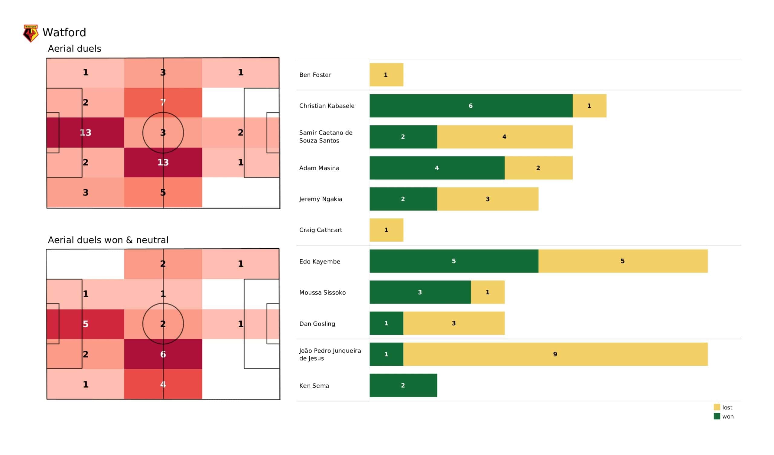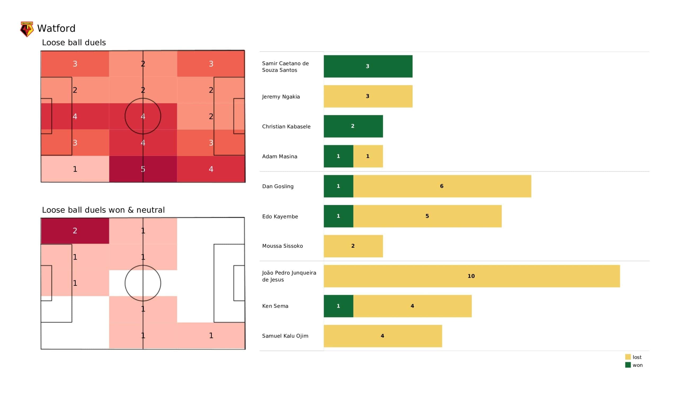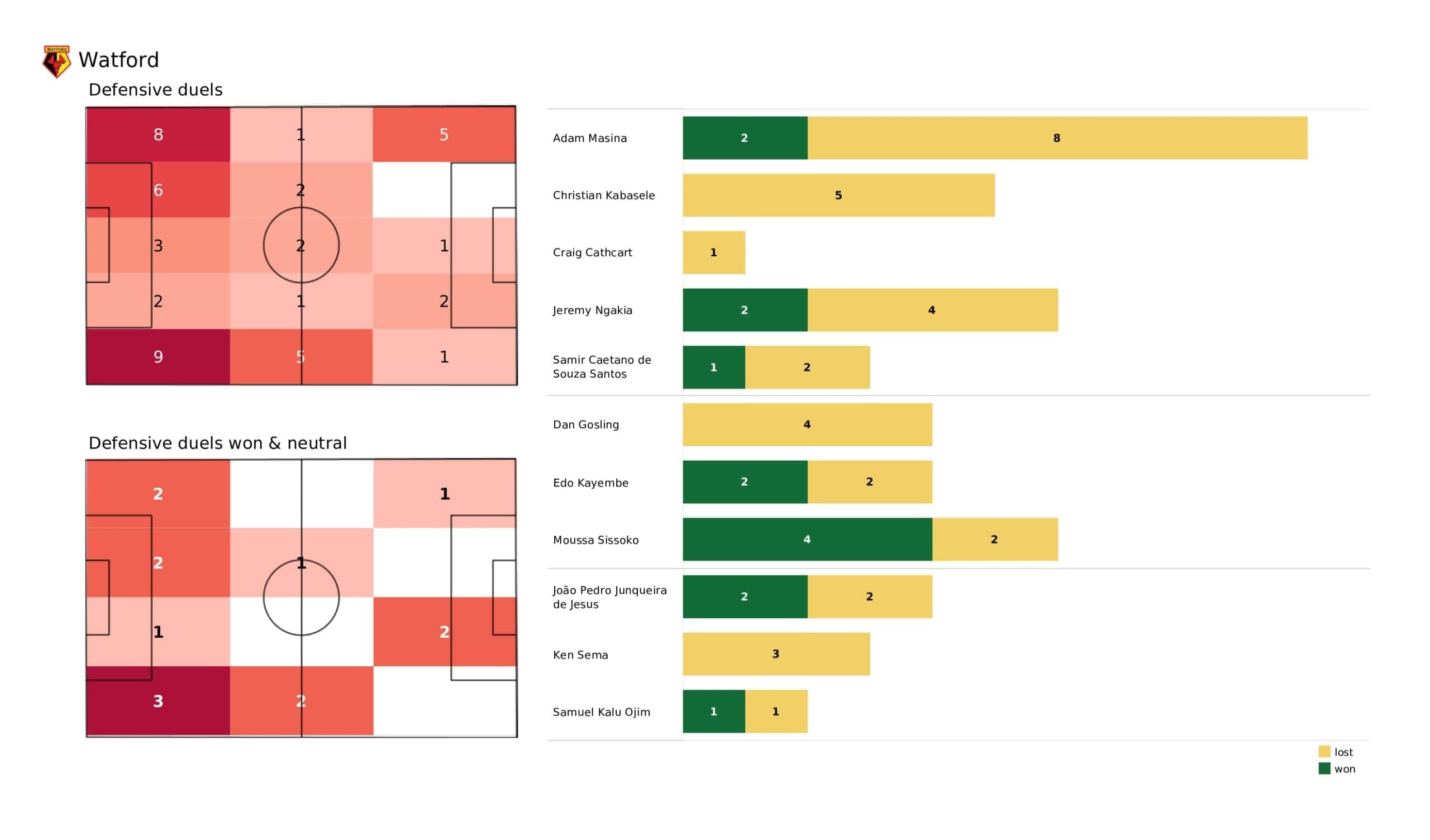 Wednesday evening saw <a href="https://totalfootballanalysis.com/match-analysis/premier-league-2021-22-leicester-city-vs-everton-data-viz-stats-and-insights">Everton</a> move two points above the relegation zone in a draw against <a href="https://totalfootballanalysis.com/match-analysis/premier-league-2021-22-crystal-palace-vs-watford-data-viz-stats-and-insights">Watford </a>in the <a href="https://totalfootballanalysis.com/match-analysis/free-download-premier-league-gw8-analytics-reports-data-viz-and-stats">Premier League</a>. We've broken down all the key <a href="https://totalfootballanalysis.com/match-analysis/free-download-premier-league-gw8-analytics-reports-data-viz-and-stats">stats</a> for you to digest in this tactical analysis and provide <a href="https://totalfootballanalysis.com/player-analysis/but-what-does-that-visual-actually-tell-us">insights</a> around; * shot maps and set-pieces * xT (expected threat) * pass networks * xG timelines * defensive duels * average positions and much more! We also try to answer some questions for you with the visuals; Who was Everton's biggest threat? Who made the most recoveries in the opposition half? Who had the highest xG in the match? To navigate the stats gallery simply click on the numbers to move through the pages. <em><strong>Don't forget, if you take out a free <a href="https://totalfootballanalysis.com/subscribe">membership</a> to Total Football Analysis, you can receive our weekly Premier League Analytics Pack free of charge which includes all the analytics from every match, team benchmarking tables and player benchmarking tables - well over 150 pages of information after every matchweek is complete!</strong></em> <h2><em>Lineups and average positions</em></h2> <a href="https://totalfootballanalysis.com/wp-content/uploads/2022/05/Watford-vs-Everton_page-0002-scaled.jpg"><img class="alignnone size-full wp-image-315842" src="https://totalfootballanalysis.com/wp-content/uploads/2022/05/Watford-vs-Everton_page-0002-scaled.jpg" alt="Premier League 2021/22: Watford vs Everton - data viz, stats and insights" width="2560" height="1504" /></a> <a href="https://totalfootballanalysis.com/wp-content/uploads/2022/05/Watford-vs-Everton_page-0003-scaled.jpg"><img class="alignnone size-full wp-image-315843" src="https://totalfootballanalysis.com/wp-content/uploads/2022/05/Watford-vs-Everton_page-0003-scaled.jpg" alt="Premier League 2021/22: Watford vs Everton - data viz, stats and insights" width="2560" height="1504" /></a> <a href="https://totalfootballanalysis.com/wp-content/uploads/2022/05/Watford-vs-Everton_page-0001-scaled.jpg"><img class="alignnone size-full wp-image-315887" src="https://totalfootballanalysis.com/wp-content/uploads/2022/05/Watford-vs-Everton_page-0001-scaled.jpg" alt="" width="2560" height="1504" /></a> <a href="https://totalfootballanalysis.com/wp-content/uploads/2022/05/Watford-vs-Everton_page-0005-scaled.jpg"><img class="alignnone size-full wp-image-315844" src="https://totalfootballanalysis.com/wp-content/uploads/2022/05/Watford-vs-Everton_page-0005-scaled.jpg" alt="Premier League 2021/22: Watford vs Everton - data viz, stats and insights" width="2560" height="1504" /></a><!--nextpage--> <h2><em>Stats and shot maps </em></h2> <a href="https://totalfootballanalysis.com/wp-content/uploads/2022/05/Watford-vs-Everton_page-0006-scaled.jpg"><img class="alignnone size-full wp-image-315845" src="https://totalfootballanalysis.com/wp-content/uploads/2022/05/Watford-vs-Everton_page-0006-scaled.jpg" alt="Premier League 2021/22: Watford vs Everton - data viz, stats and insights" width="2560" height="1504" /></a> <a href="https://totalfootballanalysis.com/wp-content/uploads/2022/05/Watford-vs-Everton_page-0007-scaled.jpg"><img class="alignnone size-full wp-image-315846" src="https://totalfootballanalysis.com/wp-content/uploads/2022/05/Watford-vs-Everton_page-0007-scaled.jpg" alt="Premier League 2021/22: Watford vs Everton - data viz, stats and insights" width="2560" height="1504" /></a> <a href="https://totalfootballanalysis.com/wp-content/uploads/2022/05/Watford-vs-Everton_page-0008-scaled.jpg"><img class="alignnone size-full wp-image-315847" src="https://totalfootballanalysis.com/wp-content/uploads/2022/05/Watford-vs-Everton_page-0008-scaled.jpg" alt="Premier League 2021/22: Watford vs Everton - data viz, stats and insights" width="2560" height="1504" /></a> <a href="https://totalfootballanalysis.com/wp-content/uploads/2022/05/Watford-vs-Everton_page-0009-scaled.jpg"><img class="alignnone size-full wp-image-315848" src="https://totalfootballanalysis.com/wp-content/uploads/2022/05/Watford-vs-Everton_page-0009-scaled.jpg" alt="Premier League 2021/22: Watford vs Everton - data viz, stats and insights" width="2560" height="1504" /></a><!--nextpage--> <h2><em>xT and xG timelines plus pass matrixes</em></h2> <a href="https://totalfootballanalysis.com/wp-content/uploads/2022/05/Watford-vs-Everton_page-0010-scaled.jpg"><img class="alignnone size-full wp-image-315849" src="https://totalfootballanalysis.com/wp-content/uploads/2022/05/Watford-vs-Everton_page-0010-scaled.jpg" alt="Premier League 2021/22: Watford vs Everton - data viz, stats and insights" width="2560" height="1504" /></a> <a href="https://totalfootballanalysis.com/wp-content/uploads/2022/05/Watford-vs-Everton_page-0011-scaled.jpg"><img class="alignnone size-full wp-image-315850" src="https://totalfootballanalysis.com/wp-content/uploads/2022/05/Watford-vs-Everton_page-0011-scaled.jpg" alt="Premier League 2021/22: Watford vs Everton - data viz, stats and insights" width="2560" height="1504" /></a> <a href="https://totalfootballanalysis.com/wp-content/uploads/2022/05/Watford-vs-Everton_page-0012-scaled.jpg"><img class="alignnone size-full wp-image-315851" src="https://totalfootballanalysis.com/wp-content/uploads/2022/05/Watford-vs-Everton_page-0012-scaled.jpg" alt="Premier League 2021/22: Watford vs Everton - data viz, stats and insights" width="2560" height="1504" /></a><!--nextp