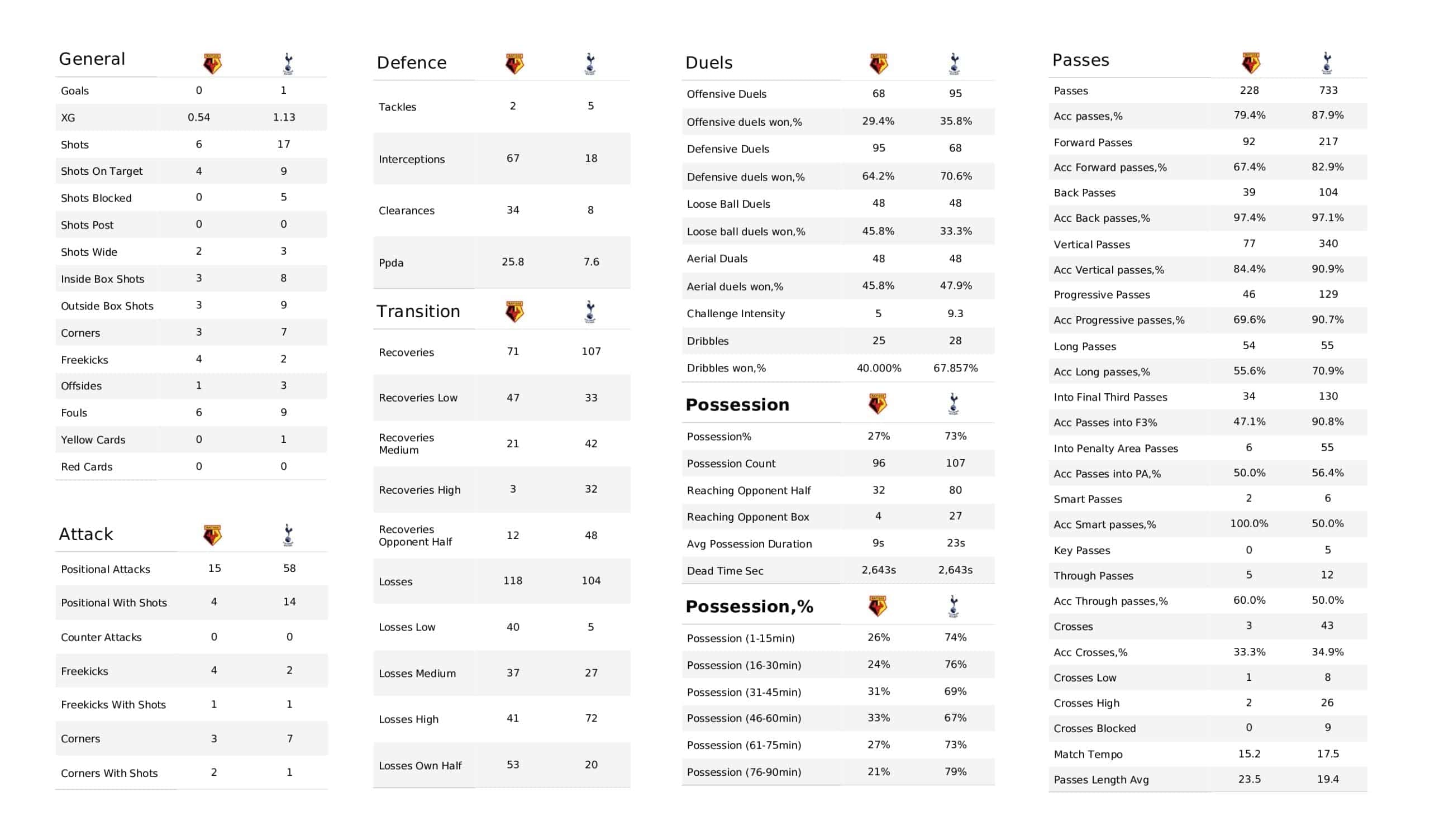 New Year's Day saw <a href="https://totalfootballanalysis.com/match-analysis/premier-league-2021-22-southampton-vs-spurs-post-match-data-viz-and-stats">Spurs</a> get a very late winner against <a href="https://totalfootballanalysis.com/match-analysis/premier-league-2021-22-watford-vs-west-ham-post-match-data-viz-and-stats">Watford</a> in the <a href="https://totalfootballanalysis.com/match-analysis/free-download-premier-league-gw8-analytics-reports-data-viz-and-stats">Premier League</a>. We've broken down all the key <a href="https://totalfootballanalysis.com/match-analysis/free-download-premier-league-gw8-analytics-reports-data-viz-and-stats">stats</a> for you to digest in this tactical analysis, including; * shot maps * xT (expected threat) * pass networks * xG timelines * defensive duels * average positions and much more! We also try to answer some questions for you with the visuals; Who was Tottenham's biggest threat? Who made the most recoveries in the opposition half? Who had the highest xG in the match? To navigate the stats gallery simply click on the numbers to move through the pages. <em><strong>Don't forget, if you take out a free <a href="https://totalfootballanalysis.com/subscribe">membership</a> to Total Football Analysis, you can receive our weekly Premier League Analytics Pack free of charge which includes all the analytics from every match, team benchmarking tables and player benchmarking tables - well over 150 pages of information after every matchweek is complete!</strong></em> <a href="https://totalfootballanalysis.com/wp-content/uploads/2022/01/Watford-vs-Spurs_page-0001-scaled.jpg"><img class="aligncenter size-large wp-image-199588" src="https://totalfootballanalysis.com/wp-content/uploads/2022/01/Watford-vs-Spurs_page-0001-1024x602.jpg" alt="Premier League 2021/22: Watford vs Spurs - post-match data viz and stats" width="640" height="376" /></a><!--nextpage--> <a href="https://totalfootballanalysis.com/wp-content/uploads/2022/01/Watford-vs-Spurs_page-0002-scaled.jpg"><img class="aligncenter size-large wp-image-199589" src="https://totalfootballanalysis.com/wp-content/uploads/2022/01/Watford-vs-Spurs_page-0002-1024x602.jpg" alt="Premier League 2021/22: Watford vs Spurs - post-match data viz and stats" width="640" height="376" /></a> <a href="https://totalfootballanalysis.com/wp-content/uploads/2022/01/Watford-vs-Spurs_page-0003-scaled.jpg"><img class="aligncenter size-large wp-image-199590" src="https://totalfootballanalysis.com/wp-content/uploads/2022/01/Watford-vs-Spurs_page-0003-1024x602.jpg" alt="Premier League 2021/22: Watford vs Spurs - post-match data viz and stats" width="640" height="376" /></a> <a href="https://totalfootballanalysis.com/wp-content/uploads/2022/01/Watford-vs-Spurs_page-0004-scaled.jpg"><img class="aligncenter size-large wp-image-199591" src="https://totalfootballanalysis.com/wp-content/uploads/2022/01/Watford-vs-Spurs_page-0004-1024x602.jpg" alt="Premier League 2021/22: Watford vs Spurs - post-match data viz and stats" width="640" height="376" /></a> <a href="https://totalfootballanalysis.com/wp-content/uploads/2022/01/Watford-vs-Spurs_page-0005-scaled.jpg"><img class="aligncenter size-large wp-image-199592" src="https://totalfootballanalysis.com/wp-content/uploads/2022/01/Watford-vs-Spurs_page-0005-1024x602.jpg" alt="Premier League 2021/22: Watford vs Spurs - post-match data viz and stats" width="640" height="376" /></a><!--nextpage--> <a href="https://totalfootballanalysis.com/wp-content/uploads/2022/01/Watford-vs-Spurs_page-0006-scaled.jpg"><img class="aligncenter size-large wp-image-199593" src="https://totalfootballanalysis.com/wp-content/uploads/2022/01/Watford-vs-Spurs_page-0006-1024x602.jpg" alt="Premier League 2021/22: Watford vs Spurs - post-match data viz and stats" width="640" height="376" /></a> <a href="https://totalfootballanalysis.com/wp-content/uploads/2022/01/Watford-vs-Spurs_page-0007-scaled.jpg"><img class="aligncenter size-large wp-image-199594" src="https://totalfootballanalysis.com/wp-content/uploads/2022/01/Watford-vs-Spurs_page-0007-1024x602.jpg" alt="Premier League 2021/22: Watford vs Spurs - post-match data viz and stats" width="640" height="376" /></a> <a href="https://totalfootballanalysis.com/wp-content/uploads/2022/01/Watford-vs-Spurs_page-0008-scaled.jpg"><img class="aligncenter size-large wp-image-199595" src="https://totalfootballanalysis.com/wp-content/uploads/2022/01/Watford-vs-Spurs_page-0008-1024x602.jpg" alt="Premier League 2021/22: Watford vs Spurs - post-match data viz and stats" width="640" height="376" /></a> <a href="https://totalfootballanalysis.com/wp-content/uploads/2022/01/Watford-vs-Spurs_page-0009-scaled.jpg"><img class="aligncenter size-large wp-image-199596" src="https://totalfootballanalysis.com/wp-content/uploads/2022/01/Watford-vs-Spurs_page-0009-1024x602.jpg" alt="Premier League 2021/22: Watford vs Spurs - post-match data viz and stats" width="640" height="376" /></a><!--nextpage--> <a href="https://totalfootballanalysis.com/wp-content/uploads/2022/01/Watford-vs-Spurs_page-0010-scaled.jpg"><img class="aligncenter size-large wp-image-199597" src="https://totalfootballanalysis.com/wp-content/uploads/2022/01/Watford-vs-Spurs_page-0010-1024x602.jpg" alt="Premier League 2021/22: Watford vs Spurs - post-match data viz and stats" width="640" height="376" /></a> <a href="https://totalfootballanalysis.com/wp-content/uploads/2022/01/Watford-vs-Spurs_page-0011-scaled.jpg"><img class="aligncenter size-large wp-image-199598" src="https://totalfootballanalysis.com/wp-content/uploads/2022/01/Watford-vs-Spurs_page-0011-1024x602.jpg" alt="Premier League 2021/22: Watford vs Spurs - post-match data viz and stats" width="640" height="376" /></a> <a href="https://totalfootballanalysis.com/wp-content/uploads/2022/01/Watford-vs-Spurs_page-0012-scaled.jpg"><img class="aligncenter size-large wp-image-199599" src="https://totalfootballanalysis.com/wp-content/uploads/2022/01/Watford-vs-Spurs_page-0012-1024x602.j