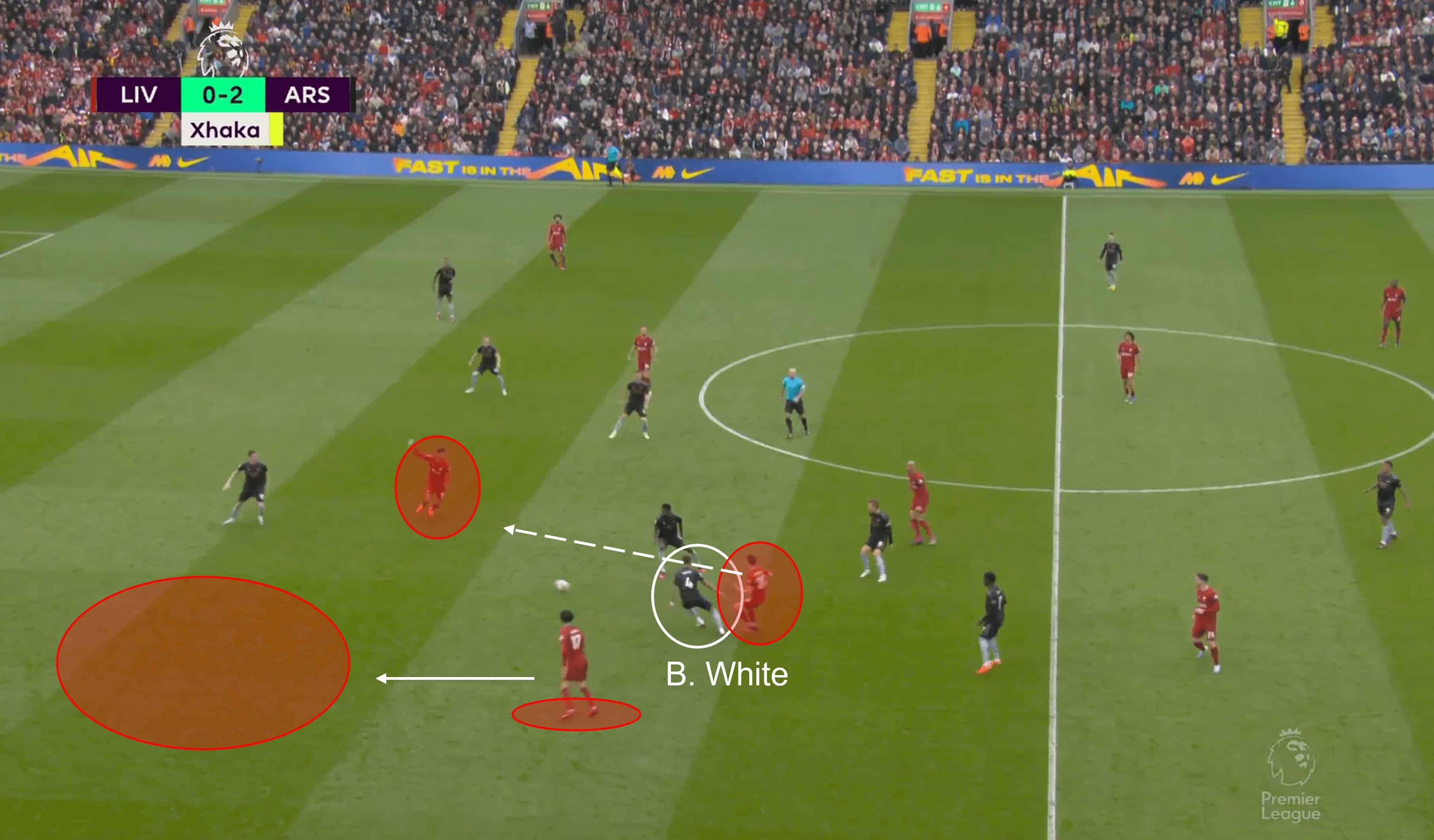 Liverpool’s first of two goals was a result of some excellent attacking play, both as a unit and certain individuals, Curtis Jones for example, but there are also defensive elements that helped them immensely. There have been questions about Trent Alexander-Arnold’s defensive ability for some time now, but it was his RB counterpart Ben White who provided the Reds with a golden opportunity as he left his post in a crucial moment.