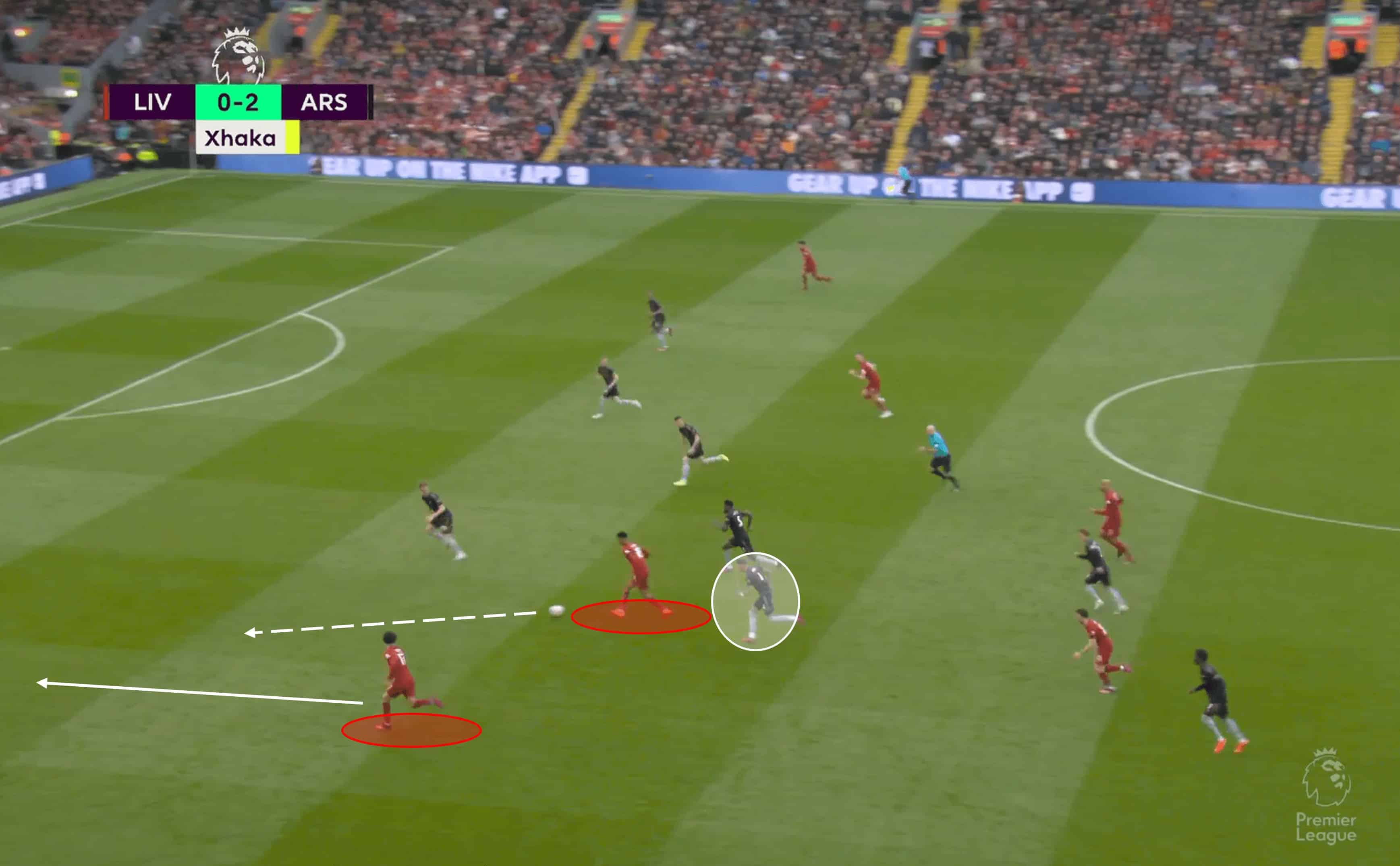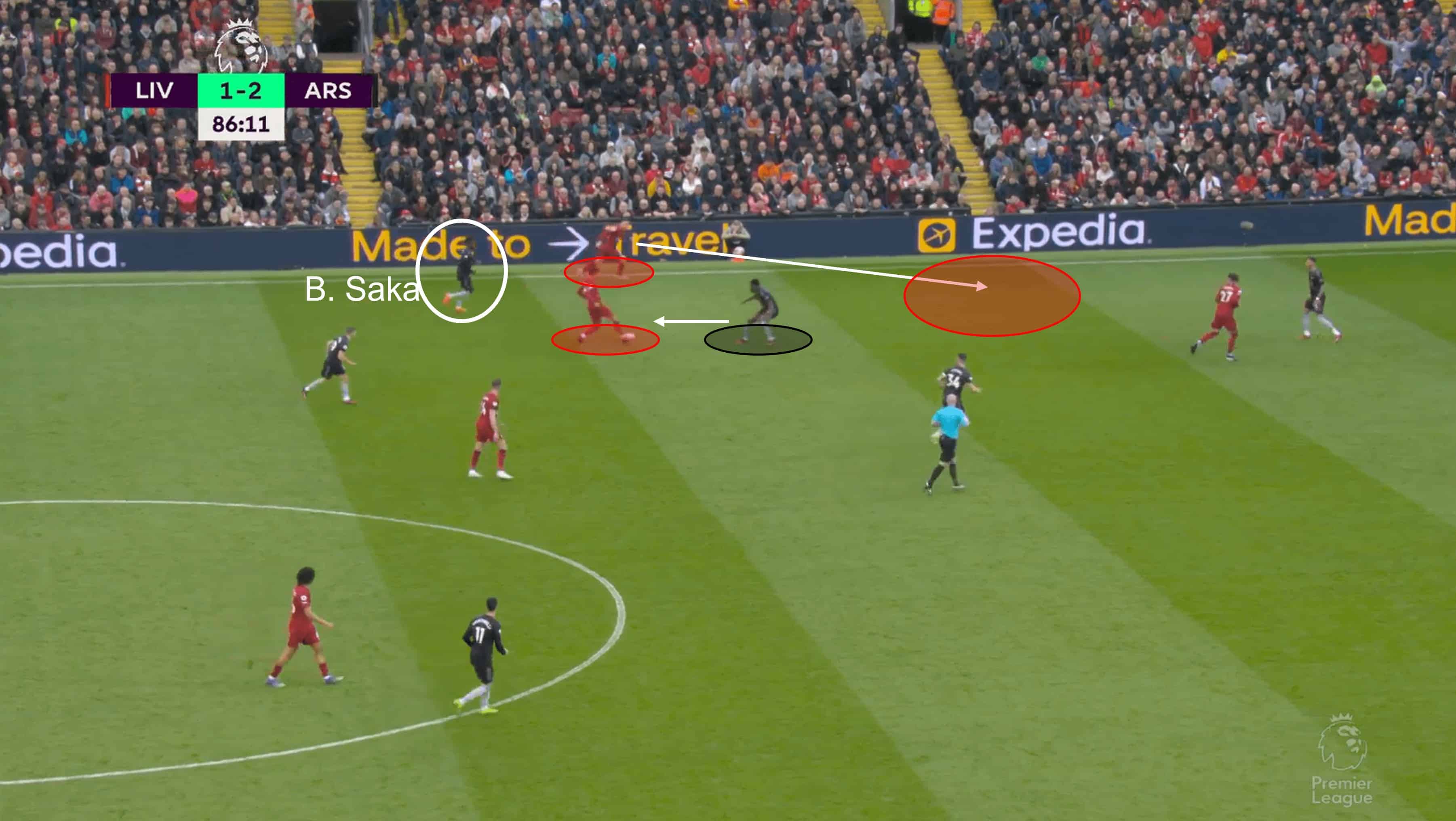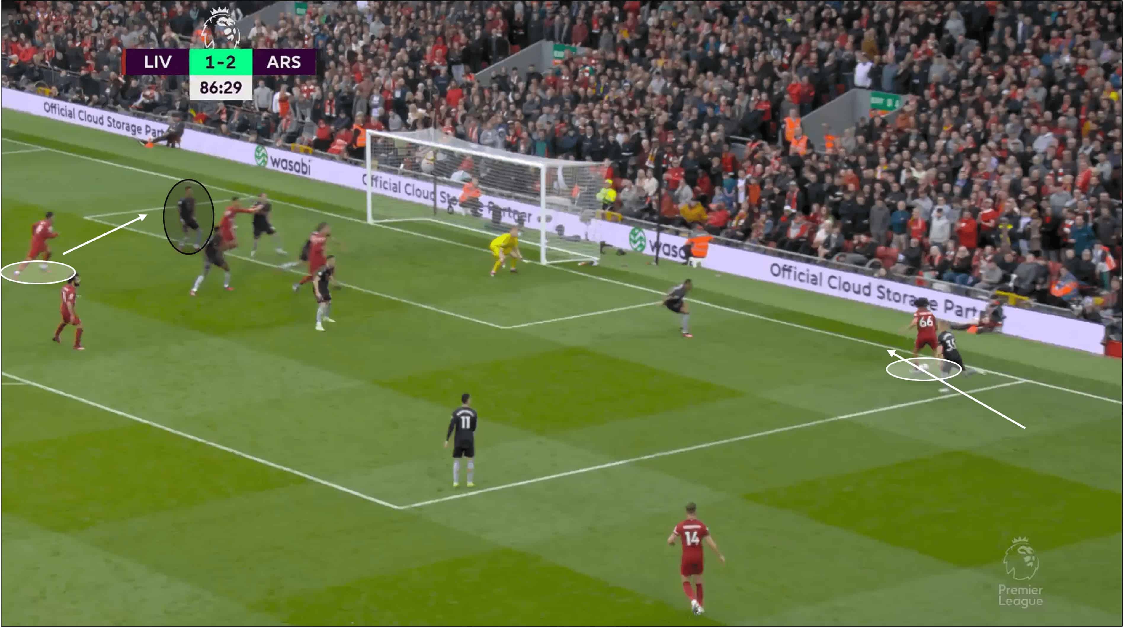 While there is a lot of football played between this moment above and Firmino’s back post header later in the move, Saka could have stopped or at least limited Liverpool’s move by simply putting the work in and helping Partey.