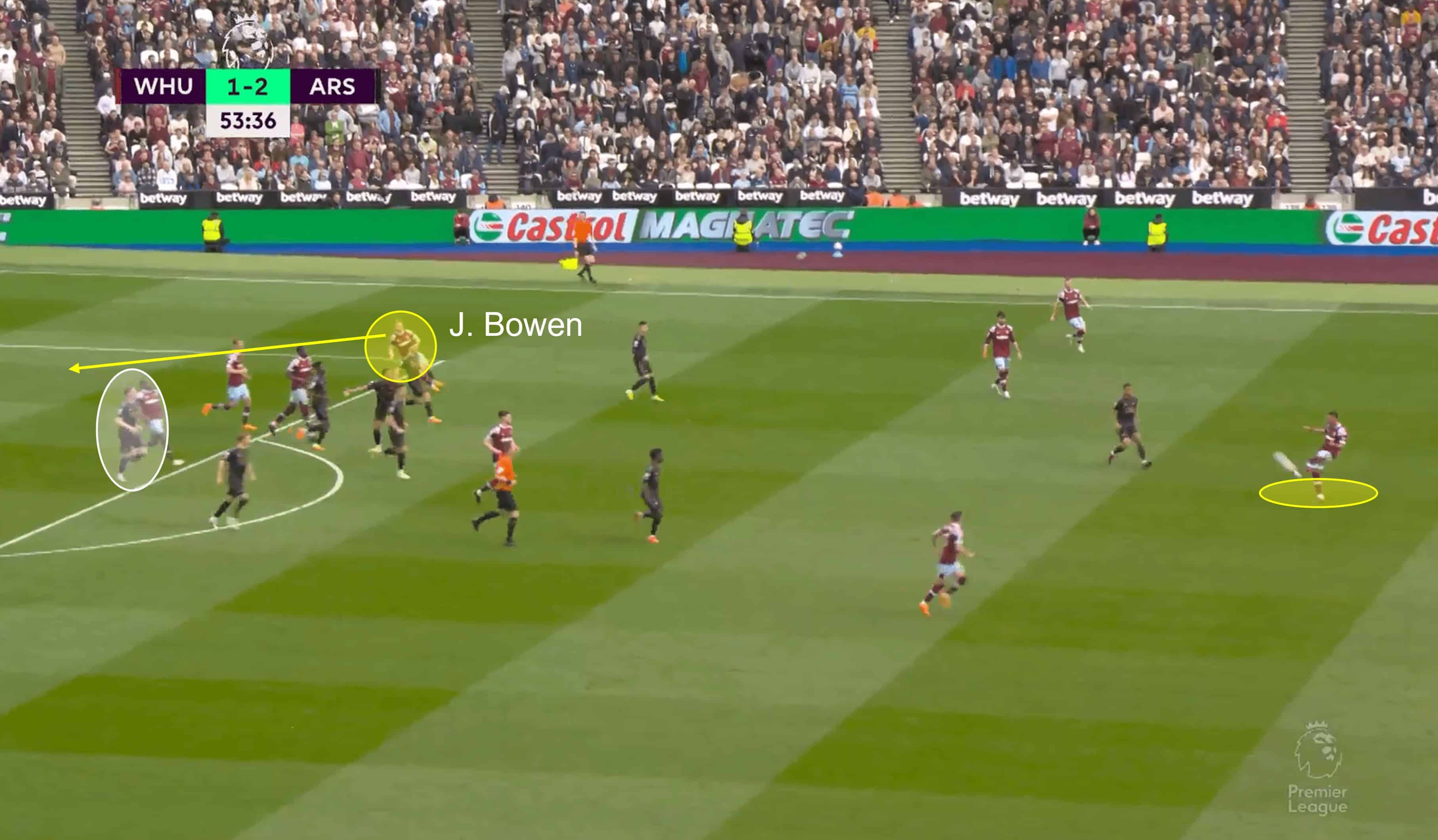 A lack of overall defensive organisation was cited in the previous analysis image, and the same curse struck Arsenal against West Ham when they failed to push out of their box effectively after clearing a long throw-in. For clarity, the highlighted Arsenal shirt is being worn by Rob Holding, and he is the one playing Jarrod Bowen onside as the ball is launched back into the danger zone. But he isn’t the only one to blame – Arsenal’s shape in general lacks direction and structure. They may well have struggled to defend this one even if Holding was higher up.
