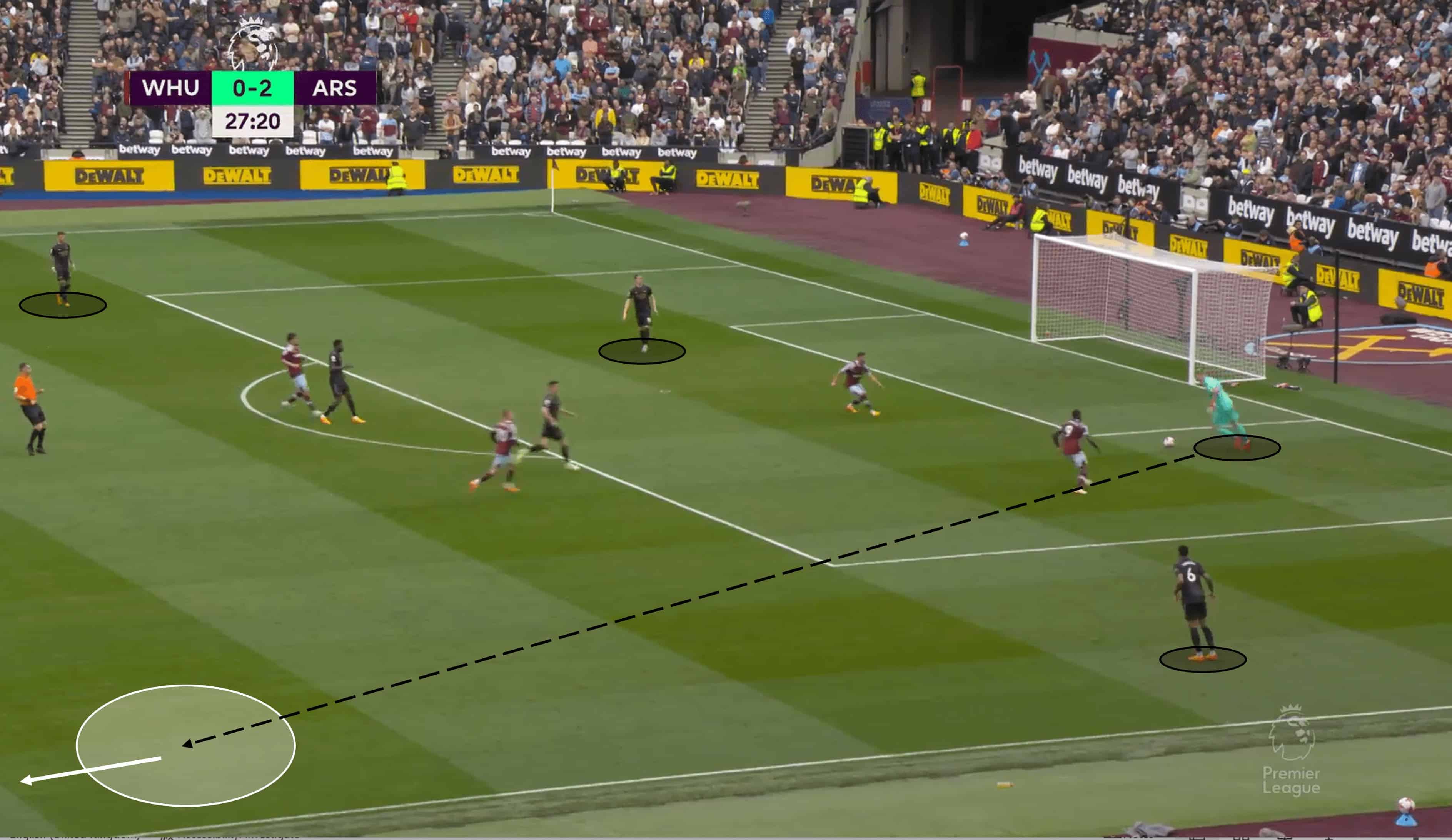 The analysis image above captures that nicely – the Hammers have a high presence in Arsenal’s half as they look to force a turnover, but this was a bold move from Moyes. Perhaps it was done to gain a quick response to Arsenal’s early goal, but hindsight is a wonderful thing, and it shows us that Arsenal just had too much quality and confidence at this moment. A snapping pass from Rob Holding carves through the West Ham set up, into his midfield teammate. Arsenal went on to build effective possession higher up the pitch and ultimately grabbed their second goal at the end of it.