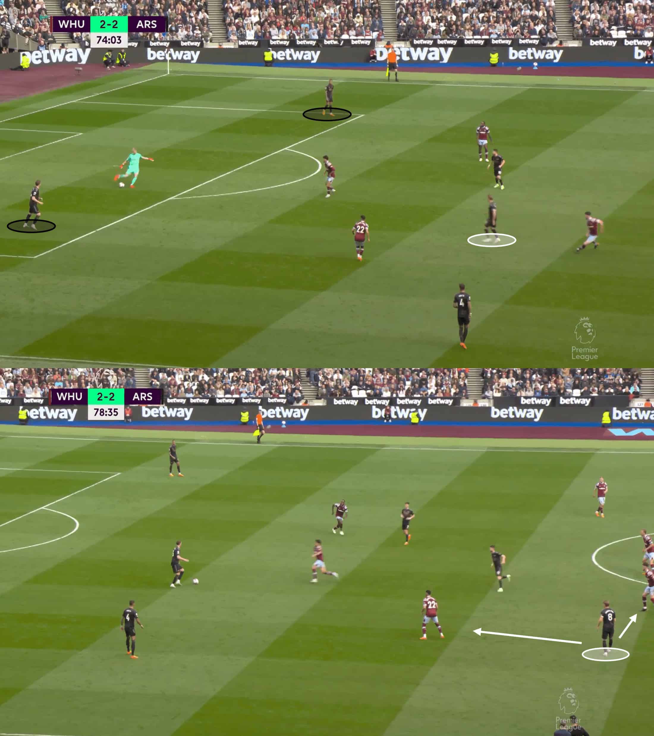 Pressing in the way West Ham did deserves credit, sure, but it’s important to remember where they are in the league and in turn, where their opponents are as well – at some point, Arsenal’s quality was going to prevail, and we saw a few moments of that, allowing them to beat the press.