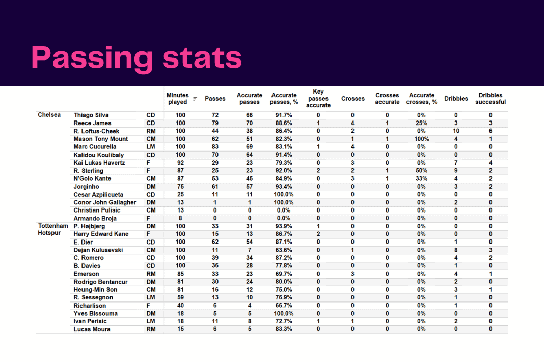 Sunday saw <a href="https://totalfootballanalysis.com/category/teams/chelsea">Chelsea vs Tottenham</a> in the <a href="https://totalfootballanalysis.com/category/competitions/premier-league">Premier League</a>. We've broken down all the key <a href="https://totalfootballanalysis.com/match-analysis/free-download-premier-league-gw8-analytics-reports-data-viz-and-stats">stats</a> for you to digest in this tactical analysis and provide <a href="https://totalfootballanalysis.com/player-analysis/but-what-does-that-visual-actually-tell-us">insights</a> around; * shot maps * pass flow * heatmaps * defensive actions * average positions and much more! We also try to answer some questions for you with the visuals; Who was <a href="https://totalfootballanalysis.com/category/teams/tottenham-hotspur">Tottenham</a>'s biggest threat? Who made the most recoveries in the opposition half? Who had the highest xG in the match? To navigate the stats gallery simply click on the numbers to move through the pages. <a href="https://totalfootballanalysis.com/wp-content/uploads/2022/08/2-46.jpg"><img class="aligncenter size-large wp-image-334076" src="https://totalfootballanalysis.com/wp-content/uploads/2022/08/2-46-1024x683.jpg" alt="Premier League 2022/23: Chelsea vs Tottenham - data viz, stats and insights" width="640" height="427" /></a> <a href="https://totalfootballanalysis.com/wp-content/uploads/2022/08/3-46.jpg"><img class="aligncenter size-large wp-image-334075" src="https://totalfootballanalysis.com/wp-content/uploads/2022/08/3-46-1024x683.jpg" alt="Premier League 2022/23: Chelsea vs Tottenham - data viz, stats and insights" width="640" height="427" /></a> <a href="https://totalfootballanalysis.com/wp-content/uploads/2022/08/4-46.png"><img class="aligncenter size-large wp-image-334074" src="https://totalfootballanalysis.com/wp-content/uploads/2022/08/4-46-1024x683.png" alt="Premier League 2022/23: Chelsea vs Tottenham - data viz, stats and insights" width="640" height="427" /></a> <a href="https://totalfootballanalysis.com/wp-content/uploads/2022/08/5-46.png"><img class="aligncenter size-large wp-image-334073" src="https://totalfootballanalysis.com/wp-content/uploads/2022/08/5-46-1024x683.png" alt="Premier League 2022/23: Chelsea vs Tottenham - data viz, stats and insights" width="640" height="427" /></a><!--nextpage--> <a href="https://totalfootballanalysis.com/wp-content/uploads/2022/08/6-46.png"><img class="aligncenter size-large wp-image-334072" src="https://totalfootballanalysis.com/wp-content/uploads/2022/08/6-46-1024x683.png" alt="Premier League 2022/23: Chelsea vs Tottenham - data viz, stats and insights" width="640" height="427" /></a> <a href="https://totalfootballanalysis.com/wp-content/uploads/2022/08/7-46.png"><img class="aligncenter size-large wp-image-334071" src="https://totalfootballanalysis.com/wp-content/uploads/2022/08/7-46-1024x683.png" alt="Premier League 2022/23: Chelsea vs Tottenham - data viz, stats and insights" width="640" height="427" /></a><!--nextpage--> <a href="https://totalfootballanalysis.com/wp-content/uploads/2022/08/8-46.png"><img class="aligncenter size-large wp-image-334070" src="https://totalfootballanalysis.com/wp-content/uploads/2022/08/8-46-1024x683.png" alt="Premier League 2022/23: Chelsea vs Tottenham - data viz, stats and insights" width="640" height="427" /></a> <a href="https://totalfootballanalysis.com/wp-content/uploads/2022/08/9-46.png"><img class="aligncenter size-large wp-image-334069" src="https://totalfootballanalysis.com/wp-content/uploads/2022/08/9-46-1024x683.png" alt="Premier League 2022/23: Chelsea vs Tottenham - data viz, stats and insights" width="640" height="427" /></a> <a href="https://totalfootballanalysis.com/wp-content/uploads/2022/08/10-46.png"><img class="aligncenter size-large wp-image-334068" src="https://totalfootballanalysis.com/wp-content/uploads/2022/08/10-46-1024x683.png" alt="Premier League 2022/23: Chelsea vs Tottenham - data viz, stats and insights" width="640" height="427" /></a><!--nextpage--> <a href="https://totalfootballanalysis.com/wp-content/uploads/2022/08/11-46.png"><img class="aligncenter size-large wp-image-334067" src="https://totalfootballanalysis.com/wp-content/uploads/2022/08/11-46-1024x683.png" alt="Premier League 2022/23: Chelsea vs Tottenham - data viz, stats and insights" width="640" height="427" /></a> <a href="https://totalfootballanalysis.com/wp-content/uploads/2022/08/12-46.png"><img class="aligncenter size-large wp-image-334066" src="https://totalfootballanalysis.com/wp-content/uploads/2022/08/12-46-1024x683.png" alt="Premier League 2022/23: Chelsea vs Tottenham - data viz, stats and insights" width="640" height="427" /></a><!--nextpage--> <h2><a href="https://totalfootballanalysis.com/wp-content/uploads/2022/08/13-46.png"><img class="aligncenter size-large wp-image-334065" src="https://totalfootballanalysis.com/wp-content/uploads/2022/08/13-46-1024x683.png" alt="Premier League 2022/23: Chelsea vs Tottenham - data viz, stats and insights" width="640" height="427" /></a></h2>
