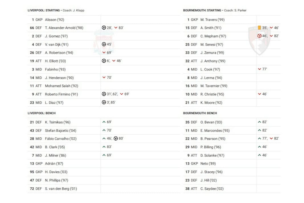Saturday saw Liverpool vs Bournemouth in the Premier League.