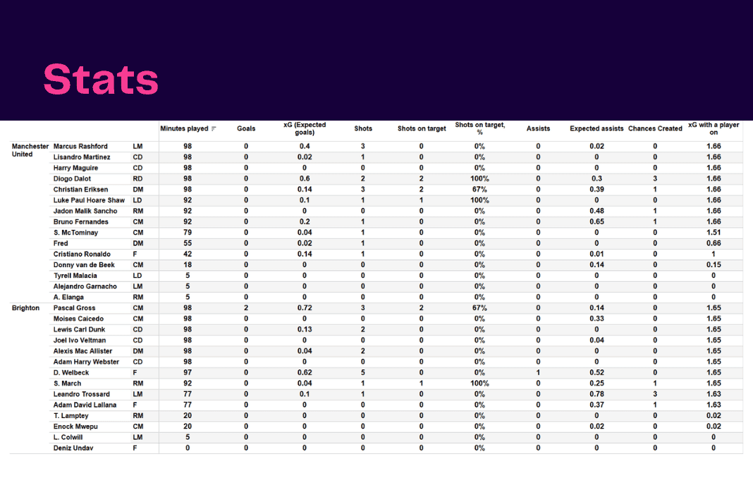 Sunday saw a shock at Old Trafford where <a href="https://totalfootballanalysis.com/category/coaches/graham-potter">Brighton</a> beat <a href="https://totalfootballanalysis.com/category/teams/manchester-united">Man United</a> in the <a href="https://totalfootballanalysis.com/category/competitions/premier-league">Premier League</a>. We've broken down all the key <a href="https://totalfootballanalysis.com/match-analysis/free-download-premier-league-gw8-analytics-reports-data-viz-and-stats">stats</a> for you to digest in this tactical analysis and provide <a href="https://totalfootballanalysis.com/player-analysis/but-what-does-that-visual-actually-tell-us">insights</a> around; * shot maps * pass flow * heatmaps * defensive actions * average positions and much more! We also try to answer some questions for you with the visuals; Who was Brighton's biggest threat? Who made the most recoveries in the opposition half? Who had the highest xG in the match? To navigate the stats gallery simply click on the numbers to move through the pages. <a href="https://totalfootballanalysis.com/wp-content/uploads/2022/08/2-24.jpg"><img class="aligncenter size-large wp-image-332792" src="https://totalfootballanalysis.com/wp-content/uploads/2022/08/2-24-1024x683.jpg" alt="Premier League 2022/23: Man United vs Brighton - data viz, stats and insights" width="640" height="427" /></a> <a href="https://totalfootballanalysis.com/wp-content/uploads/2022/08/3-24.jpg"><img class="aligncenter size-large wp-image-332791" src="https://totalfootballanalysis.com/wp-content/uploads/2022/08/3-24-1024x683.jpg" alt="Premier League 2022/23: Man United vs Brighton - data viz, stats and insights" width="640" height="427" /></a> <a href="https://totalfootballanalysis.com/wp-content/uploads/2022/08/4-24.png"><img class="aligncenter size-large wp-image-332790" src="https://totalfootballanalysis.com/wp-content/uploads/2022/08/4-24-1024x683.png" alt="Premier League 2022/23: Man United vs Brighton - data viz, stats and insights" width="640" height="427" /></a> <a href="https://totalfootballanalysis.com/wp-content/uploads/2022/08/5-24.png"><img class="aligncenter size-large wp-image-332789" src="https://totalfootballanalysis.com/wp-content/uploads/2022/08/5-24-1024x683.png" alt="Premier League 2022/23: Man United vs Brighton - data viz, stats and insights" width="640" height="427" /></a><!--nextpage--> <a href="https://totalfootballanalysis.com/wp-content/uploads/2022/08/6-24.png"><img class="aligncenter size-large wp-image-332788" src="https://totalfootballanalysis.com/wp-content/uploads/2022/08/6-24-1024x683.png" alt="Premier League 2022/23: Man United vs Brighton - data viz, stats and insights" width="640" height="427" /></a> <a href="https://totalfootballanalysis.com/wp-content/uploads/2022/08/7-24.png"><img class="aligncenter size-large wp-image-332787" src="https://totalfootballanalysis.com/wp-content/uploads/2022/08/7-24-1024x683.png" alt="Premier League 2022/23: Man United vs Brighton - data viz, stats and insights" width="640" height="427" /></a><!--nextpage--> <a href="https://totalfootballanalysis.com/wp-content/uploads/2022/08/8-24.png"><img class="aligncenter size-large wp-image-332786" src="https://totalfootballanalysis.com/wp-content/uploads/2022/08/8-24-1024x683.png" alt="Premier League 2022/23: Man United vs Brighton - data viz, stats and insights" width="640" height="427" /></a> <a href="https://totalfootballanalysis.com/wp-content/uploads/2022/08/9-24.png"><img class="aligncenter size-large wp-image-332785" src="https://totalfootballanalysis.com/wp-content/uploads/2022/08/9-24-1024x683.png" alt="Premier League 2022/23: Man United vs Brighton - data viz, stats and insights" width="640" height="427" /></a> <a href="https://totalfootballanalysis.com/wp-content/uploads/2022/08/10-24.png"><img class="aligncenter size-large wp-image-332784" src="https://totalfootballanalysis.com/wp-content/uploads/2022/08/10-24-1024x683.png" alt="Premier League 2022/23: Man United vs Brighton - data viz, stats and insights" width="640" height="427" /></a><!--nextpage--> <a href="https://totalfootballanalysis.com/wp-content/uploads/2022/08/11-24.png"><img class="aligncenter size-large wp-image-332783" src="https://totalfootballanalysis.com/wp-content/uploads/2022/08/11-24-1024x683.png" alt="Premier League 2022/23: Man United vs Brighton - data viz, stats and insights" width="640" height="427" /></a> <a href="https://totalfootballanalysis.com/wp-content/uploads/2022/08/12-24.png"><img class="aligncenter size-large wp-image-332782" src="https://totalfootballanalysis.com/wp-content/uploads/2022/08/12-24-1024x683.png" alt="Premier League 2022/23: Man United vs Brighton - data viz, stats and insights" width="640" height="427" /></a><!--nextpage--> <h2><a href="https://totalfootballanalysis.com/wp-content/uploads/2022/08/13-24.png"><img class="aligncenter size-large wp-image-332781" src="https://totalfootballanalysis.com/wp-content/uploads/2022/08/13-24-1024x683.png" alt="Premier League 2022/23: Man United vs Brighton - data viz, stats and insights" width="640" height="427" /></a></h2>