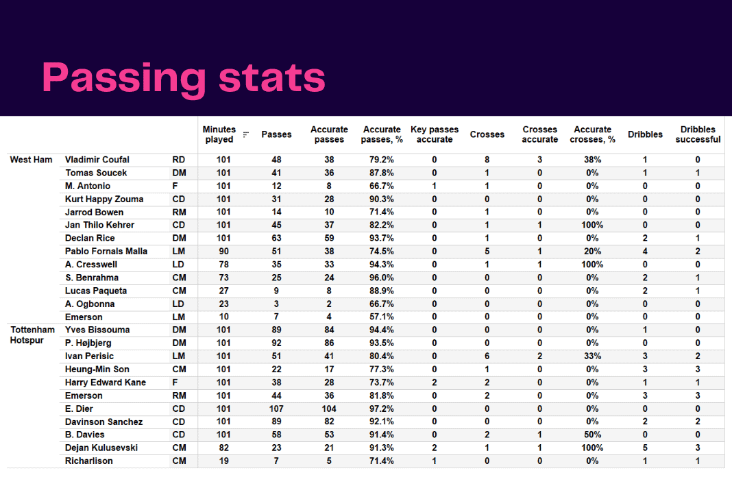 Wednesday saw <a href="https://totalfootballanalysis.com/category/teams/west-ham-united">West Ham vs Tottenham</a> in the <a href="https://totalfootballanalysis.com/category/competitions/premier-league">Premier League</a>. We've broken down all the key <a href="https://totalfootballanalysis.com/match-analysis/free-download-premier-league-gw8-analytics-reports-data-viz-and-stats">stats</a> for you to digest in this tactical analysis and provide <a href="https://totalfootballanalysis.com/player-analysis/but-what-does-that-visual-actually-tell-us">insights</a> around; * shot maps * pass flow * heatmaps * defensive actions * average positions and much more! We also try to answer some questions for you with the visuals; Who was <a href="https://totalfootballanalysis.com/category/teams/tottenham-hotspur">Tottenham</a>'s biggest threat? Who made the most recoveries in the opposition half? Who had the highest xG in the match? To navigate the stats gallery simply click on the numbers to move through the pages. <a href="https://totalfootballanalysis.com/wp-content/uploads/2022/09/2-8.jpg"><img class="aligncenter size-large wp-image-337136" src="https://totalfootballanalysis.com/wp-content/uploads/2022/09/2-8-1024x683.jpg" alt="Premier League 2022/23: West Ham vs Tottenham - data viz, stats and insights" width="640" height="427" /></a> <a href="https://totalfootballanalysis.com/wp-content/uploads/2022/09/3-8.jpg"><img class="aligncenter size-large wp-image-337135" src="https://totalfootballanalysis.com/wp-content/uploads/2022/09/3-8-1024x683.jpg" alt="Premier League 2022/23: West Ham vs Tottenham - data viz, stats and insights" width="640" height="427" /></a> <a href="https://totalfootballanalysis.com/wp-content/uploads/2022/09/4-8.png"><img class="aligncenter size-large wp-image-337134" src="https://totalfootballanalysis.com/wp-content/uploads/2022/09/4-8-1024x683.png" alt="Premier League 2022/23: West Ham vs Tottenham - data viz, stats and insights" width="640" height="427" /></a> <a href="https://totalfootballanalysis.com/wp-content/uploads/2022/09/5-8.png"><img class="aligncenter size-large wp-image-337133" src="https://totalfootballanalysis.com/wp-content/uploads/2022/09/5-8-1024x683.png" alt="Premier League 2022/23: West Ham vs Tottenham - data viz, stats and insights" width="640" height="427" /></a><!--nextpage--> <a href="https://totalfootballanalysis.com/wp-content/uploads/2022/09/6-8.png"><img class="aligncenter size-large wp-image-337132" src="https://totalfootballanalysis.com/wp-content/uploads/2022/09/6-8-1024x683.png" alt="Premier League 2022/23: West Ham vs Tottenham - data viz, stats and insights" width="640" height="427" /></a> <a href="https://totalfootballanalysis.com/wp-content/uploads/2022/09/7-8.png"><img class="aligncenter size-large wp-image-337131" src="https://totalfootballanalysis.com/wp-content/uploads/2022/09/7-8-1024x683.png" alt="Premier League 2022/23: West Ham vs Tottenham - data viz, stats and insights" width="640" height="427" /></a><!--nextpage--> <a href="https://totalfootballanalysis.com/wp-content/uploads/2022/09/8-8.png"><img class="aligncenter size-large wp-image-337130" src="https://totalfootballanalysis.com/wp-content/uploads/2022/09/8-8-1024x683.png" alt="Premier League 2022/23: West Ham vs Tottenham - data viz, stats and insights" width="640" height="427" /></a> <a href="https://totalfootballanalysis.com/wp-content/uploads/2022/09/9-8.png"><img class="aligncenter size-large wp-image-337129" src="https://totalfootballanalysis.com/wp-content/uploads/2022/09/9-8-1024x683.png" alt="Premier League 2022/23: West Ham vs Tottenham - data viz, stats and insights" width="640" height="427" /></a> <a href="https://totalfootballanalysis.com/wp-content/uploads/2022/09/10-6.png"><img class="aligncenter size-large wp-image-337128" src="https://totalfootballanalysis.com/wp-content/uploads/2022/09/10-6-1024x683.png" alt="Premier League 2022/23: West Ham vs Tottenham - data viz, stats and insights" width="640" height="427" /></a><!--nextpage--> <a href="https://totalfootballanalysis.com/wp-content/uploads/2022/09/11-6.png"><img class="aligncenter size-large wp-image-337127" src="https://totalfootballanalysis.com/wp-content/uploads/2022/09/11-6-1024x683.png" alt="Premier League 2022/23: West Ham vs Tottenham - data viz, stats and insights" width="640" height="427" /></a> <a href="https://totalfootballanalysis.com/wp-content/uploads/2022/09/12-6.png"><img class="aligncenter size-large wp-image-337126" src="https://totalfootballanalysis.com/wp-content/uploads/2022/09/12-6-1024x683.png" alt="Premier League 2022/23: West Ham vs Tottenham - data viz, stats and insights" width="640" height="427" /></a><!--nextpage--> <h2><a href="https://totalfootballanalysis.com/wp-content/uploads/2022/09/13-6.png"><img class="aligncenter size-large wp-image-337124" src="https://totalfootballanalysis.com/wp-content/uploads/2022/09/13-6-1024x683.png" alt="Premier League 2022/23: West Ham vs Tottenham - data viz, stats and insights" width="640" height="427" /></a></h2>