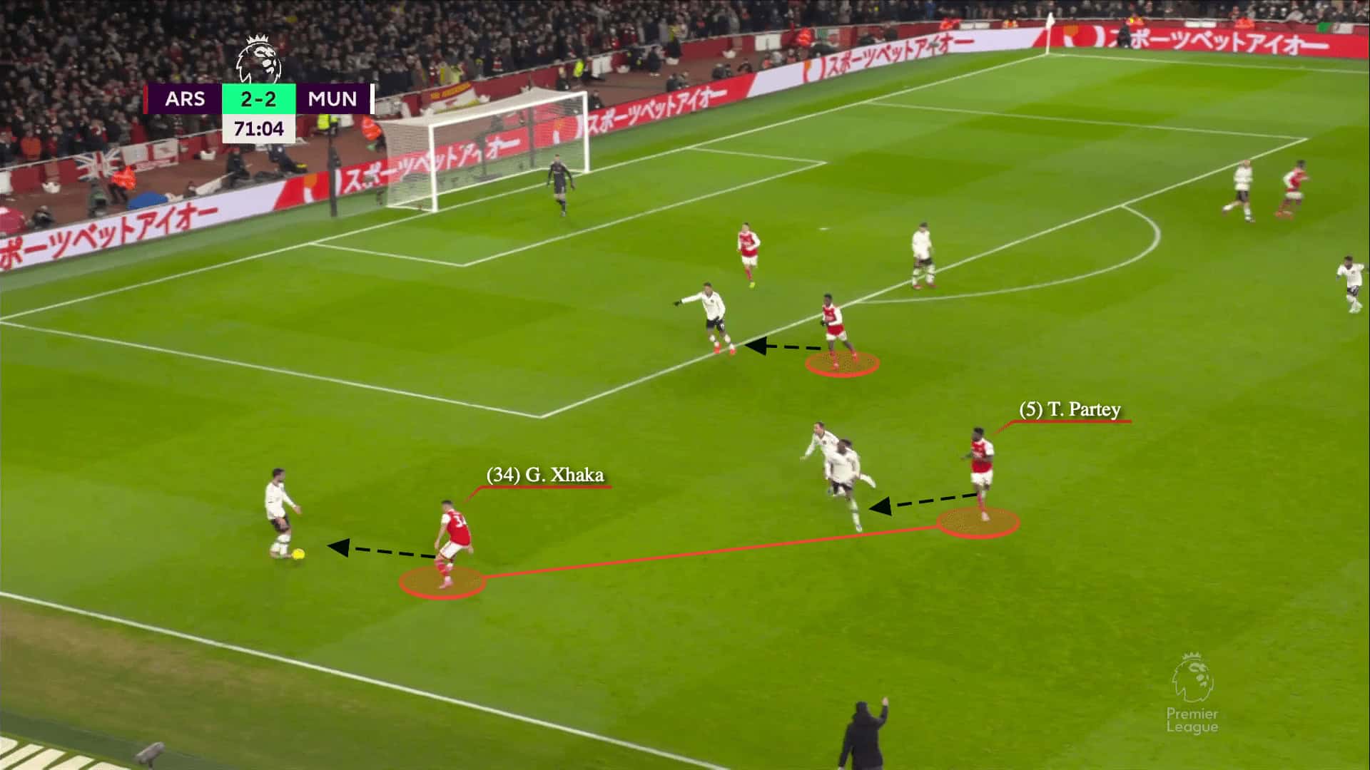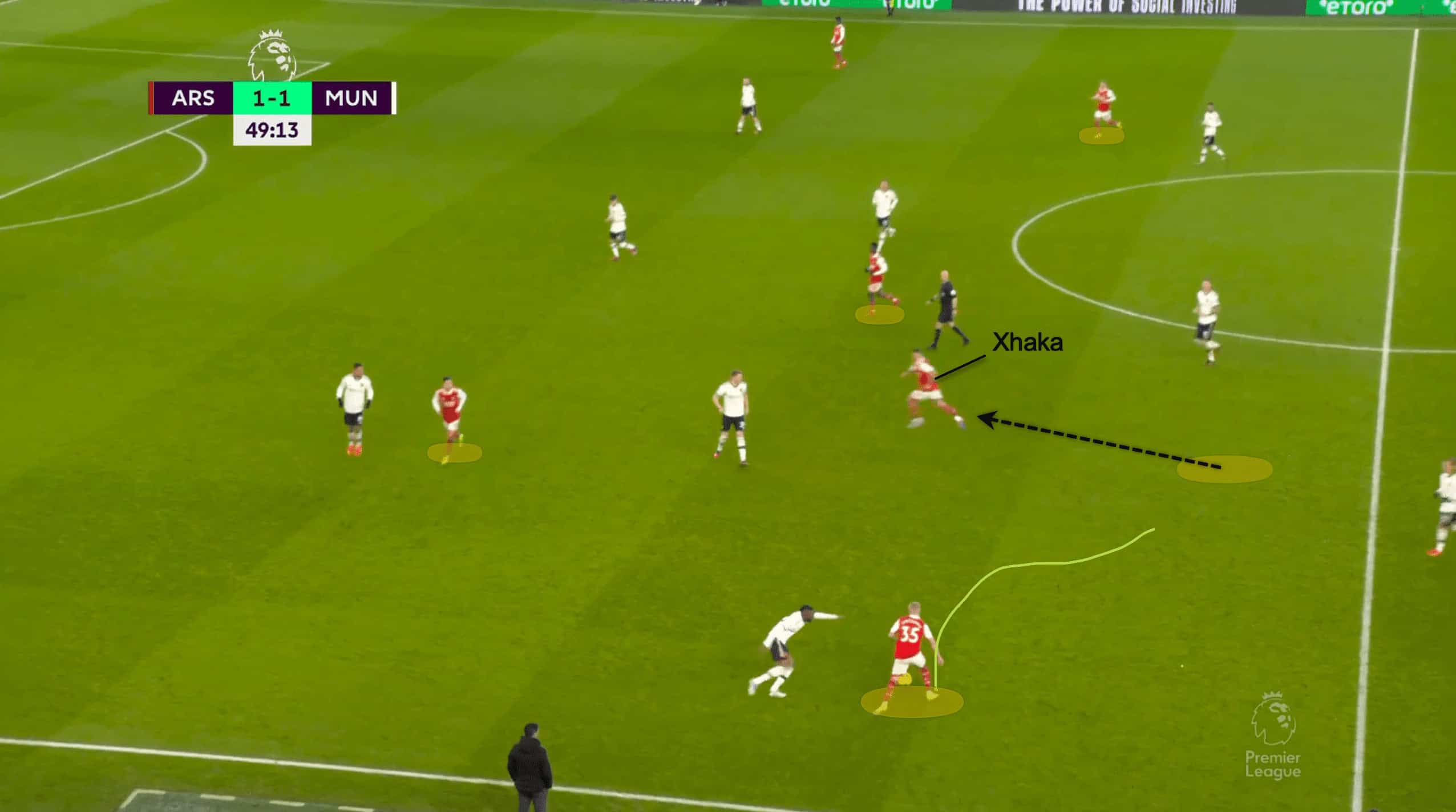 To help set up their attacks, Arsenal often put McTominay against Zinchenko and Xhaka in two-on-one scenarios. As a result of their strategy of taking turns going up, Xhaka and Partey were able to generate a wide range of opportunities.