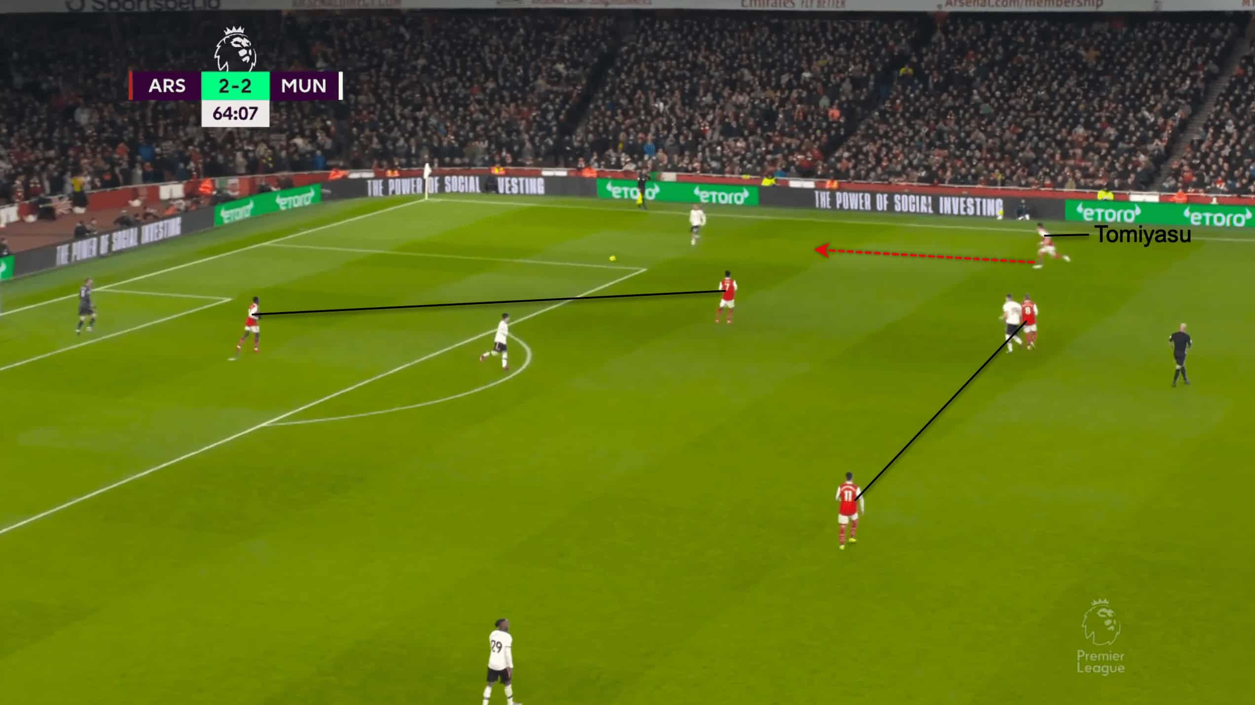 Partey and Xhaka adopted a different pressing route in the second half since they knew they had Zinchenko’s backing from the back. It was clear that ball retention was a major priority for their press. Once after Tomiyasu’s introduction after the break, he provided a different flavour to the team’s defence as well as in the attack.