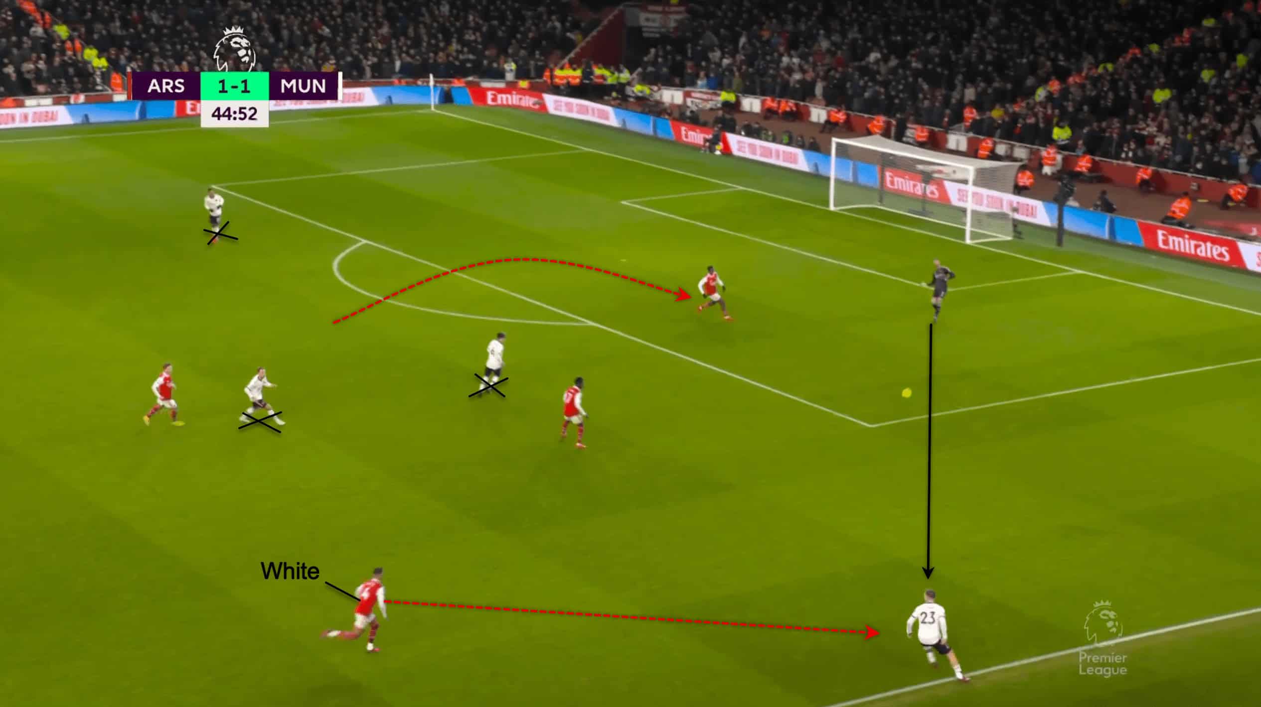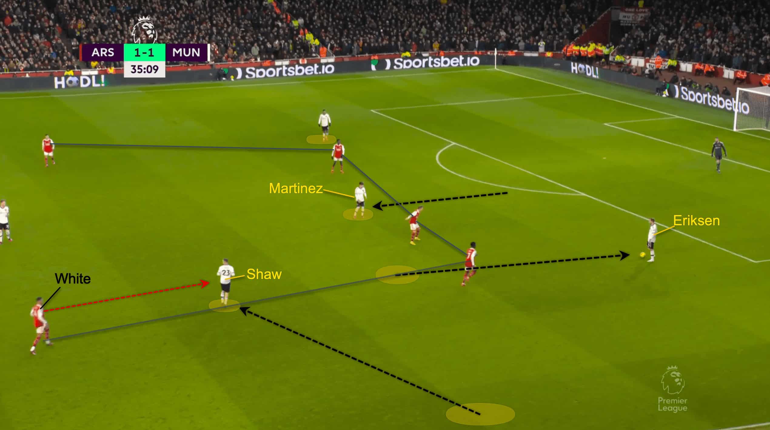 As the game progressed, the full-backs’ aggression to press was immense. Saka from the wing would go inside to mark one of United’s midfielders when White takes his chance to go high up the pitch.