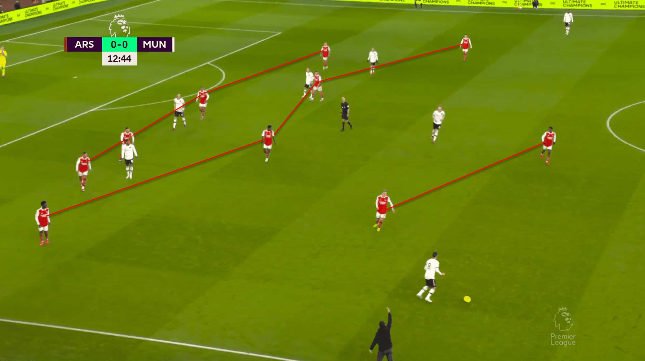 In great part due to their pressure, United had 27 clearances. In the above image, Ødegaard sprints at Martinez in the nick of time to push him into clearing the ball. The quick presses were almost never-ending for Arteta’s men as they pushed ten Hag’s men to make clearances.