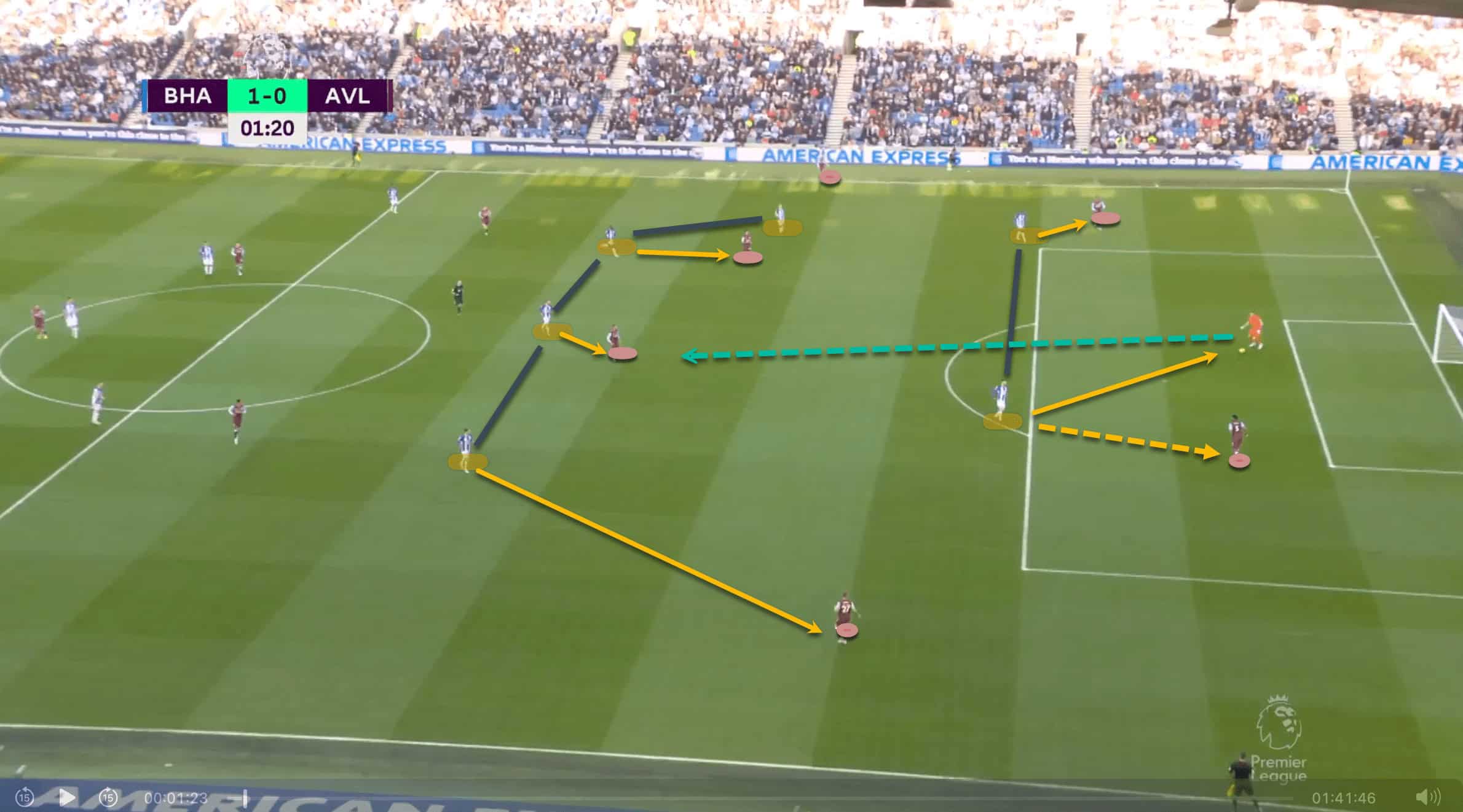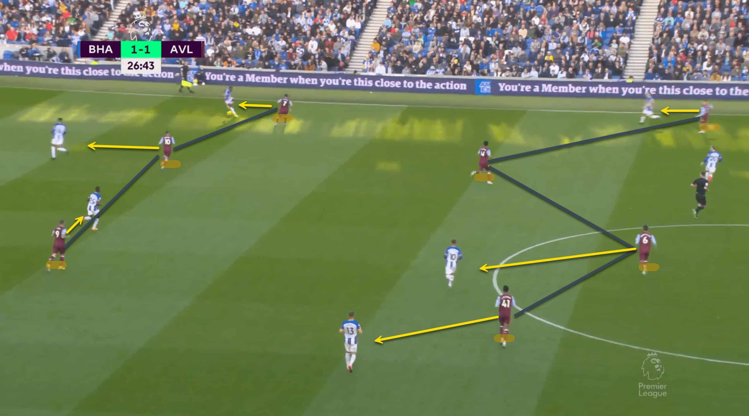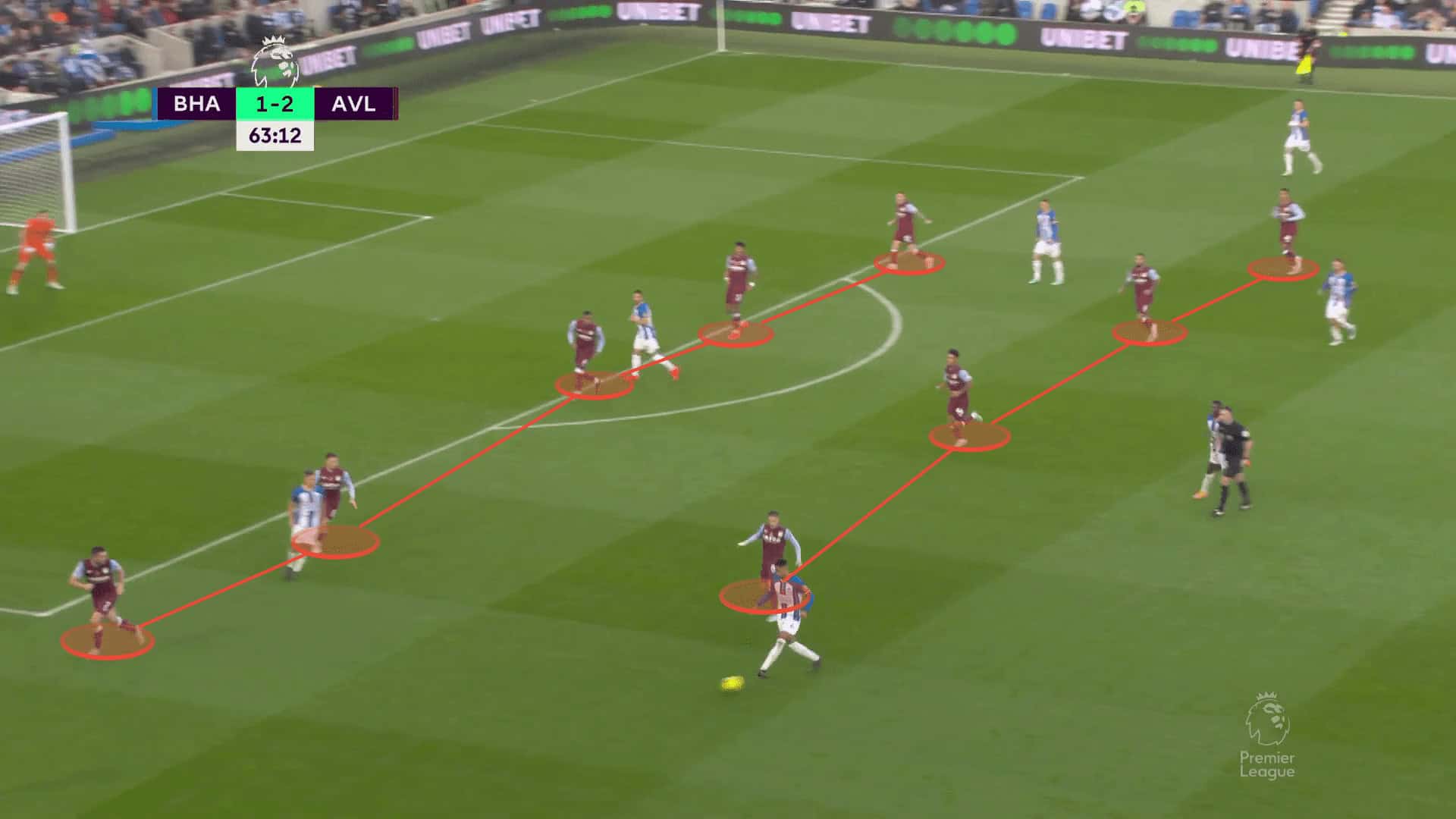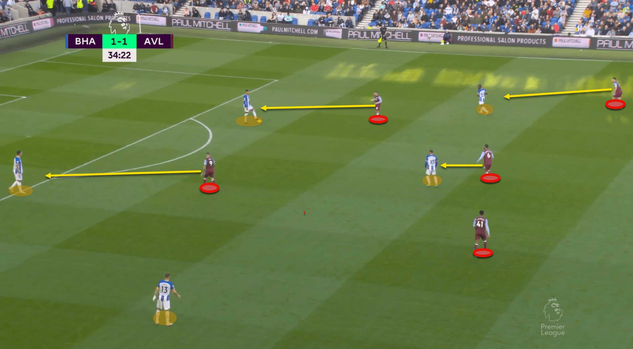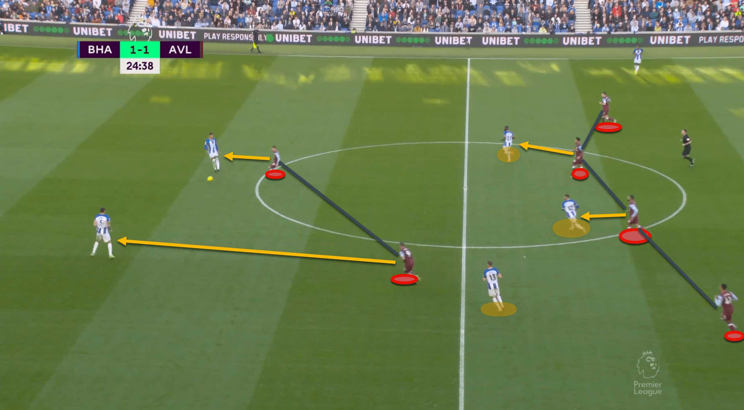 Sometimes Villa would switch to a 3-4-3 formation, with Cash moving up to the midfield line to mark Trossard and McGinn pressing high up.