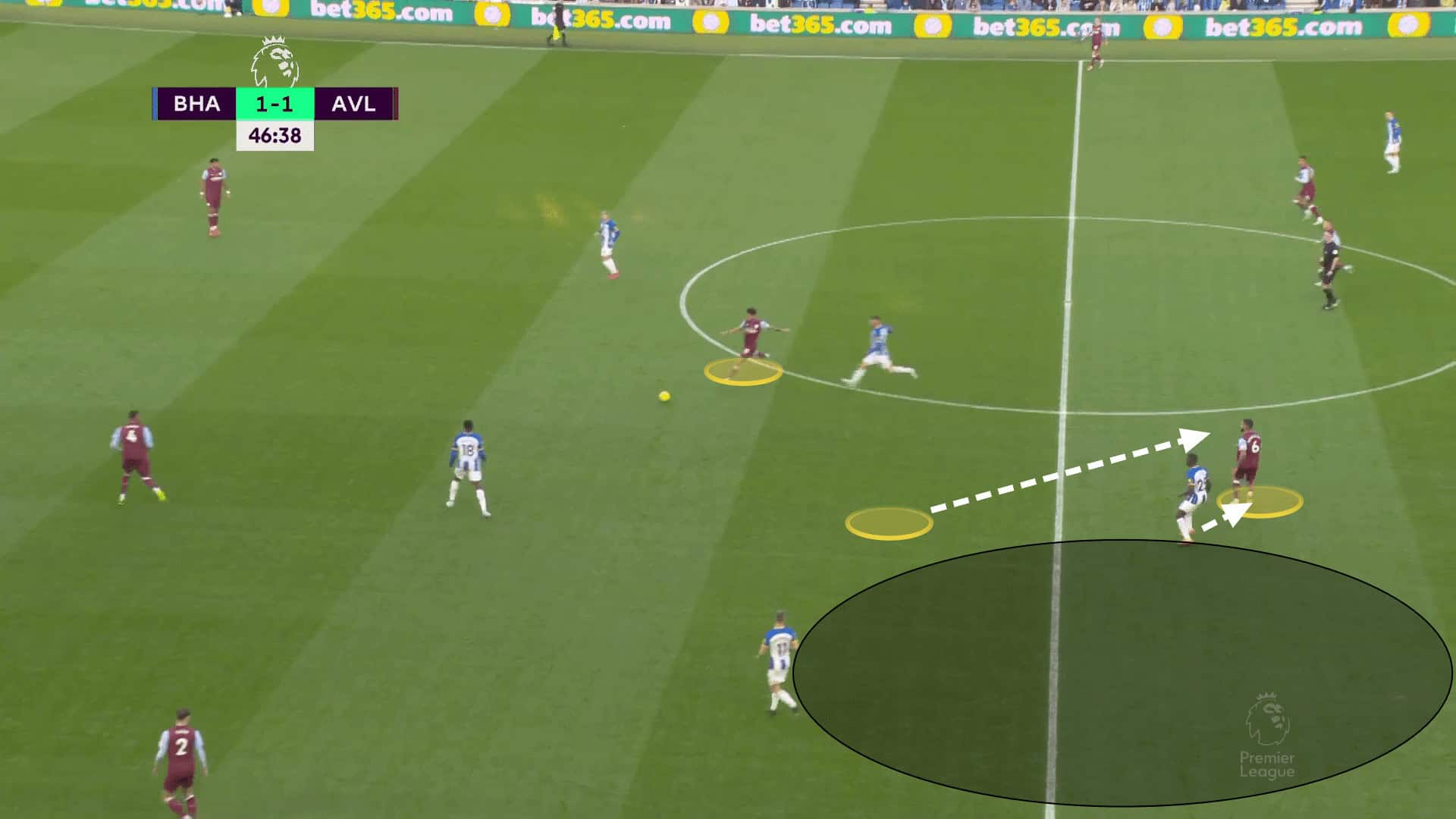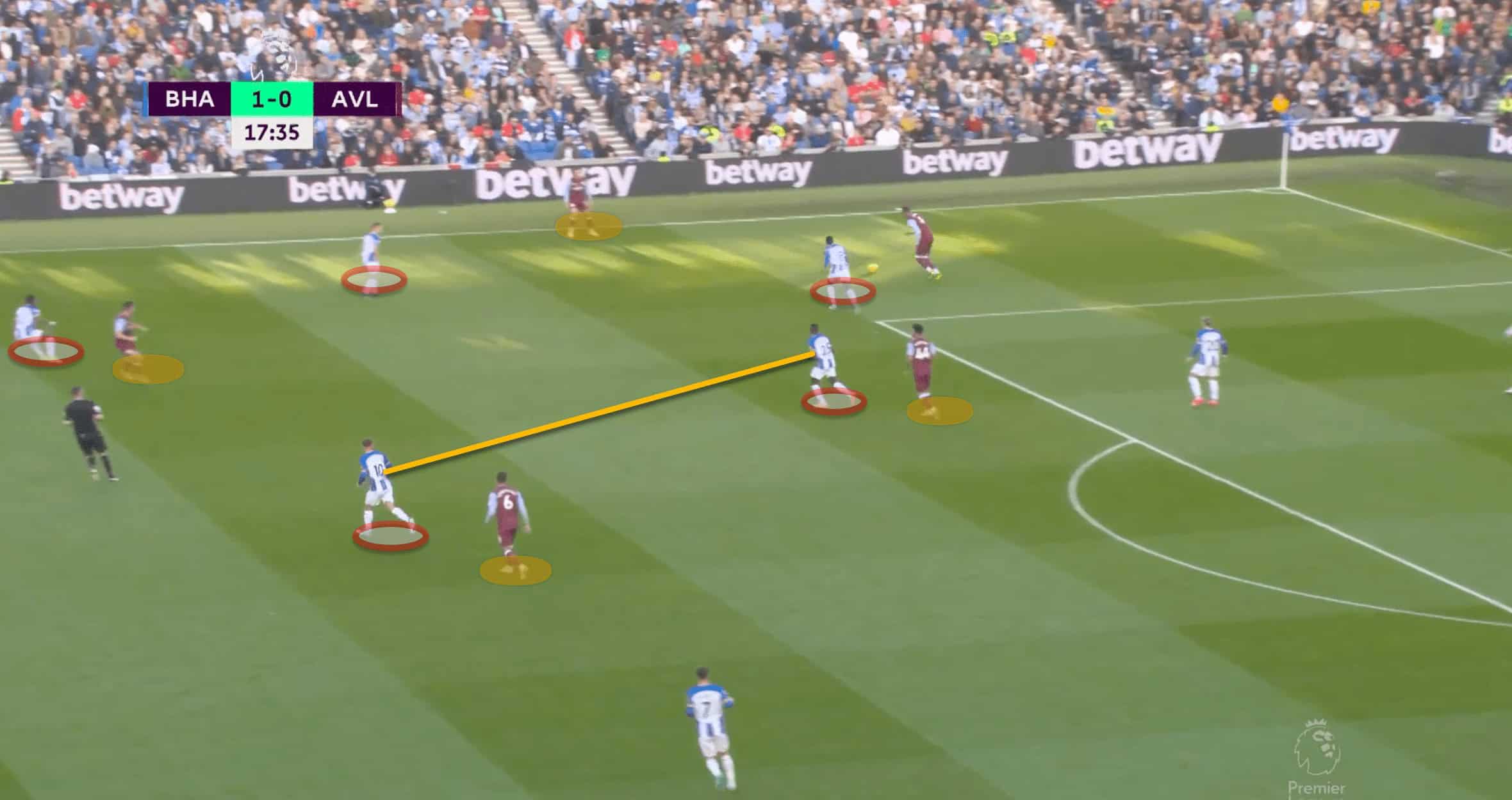 Despite having to play with Kamara, Luiz pushed to the front, displacing Caicedo, and giving McGinn room to play in Brighton’s half.