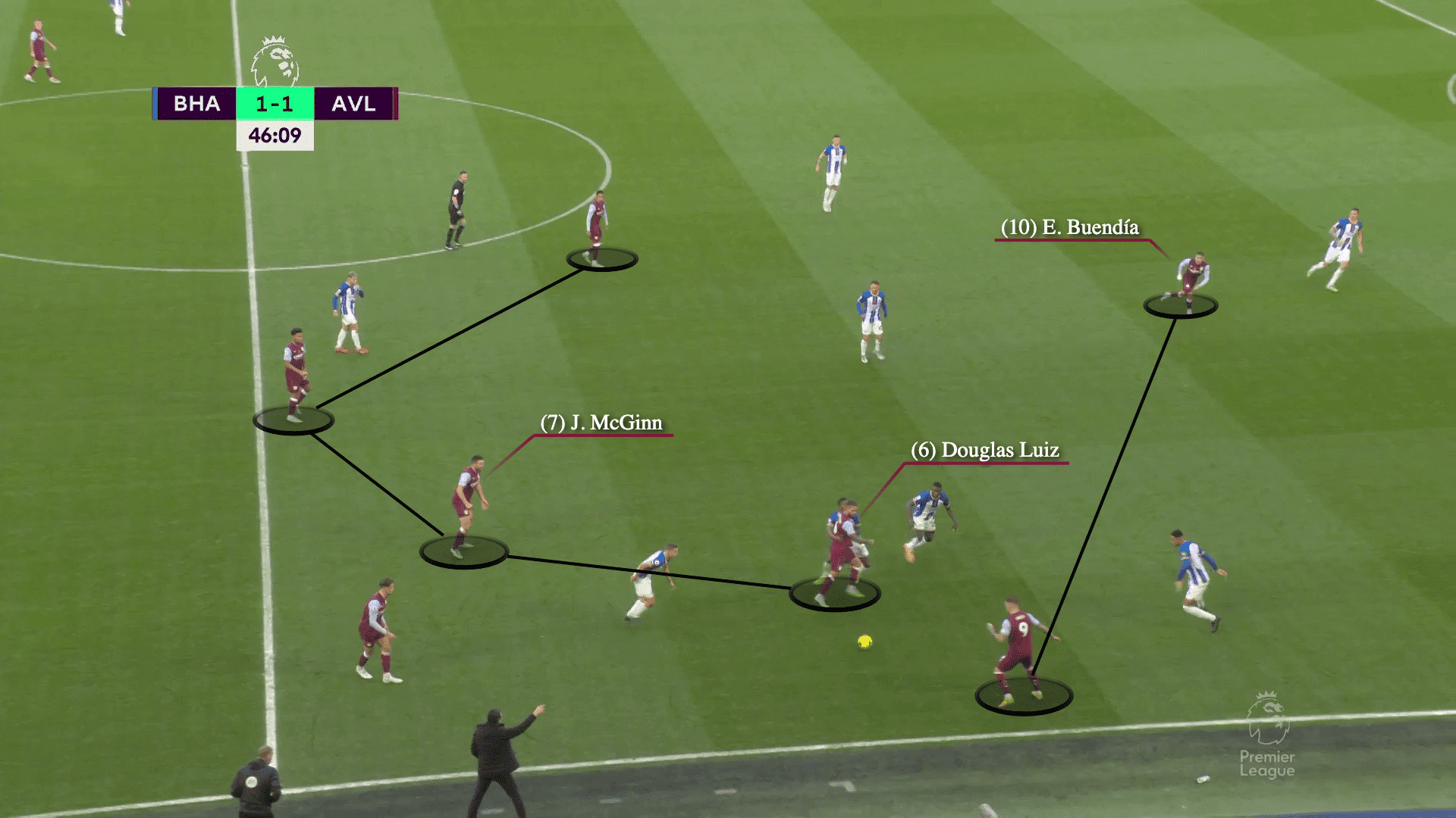 Douglas Luiz and Boubacar Kamara formed the central midfield with the team captain John Mcginn on the left and Jacob Ramsey on the right.