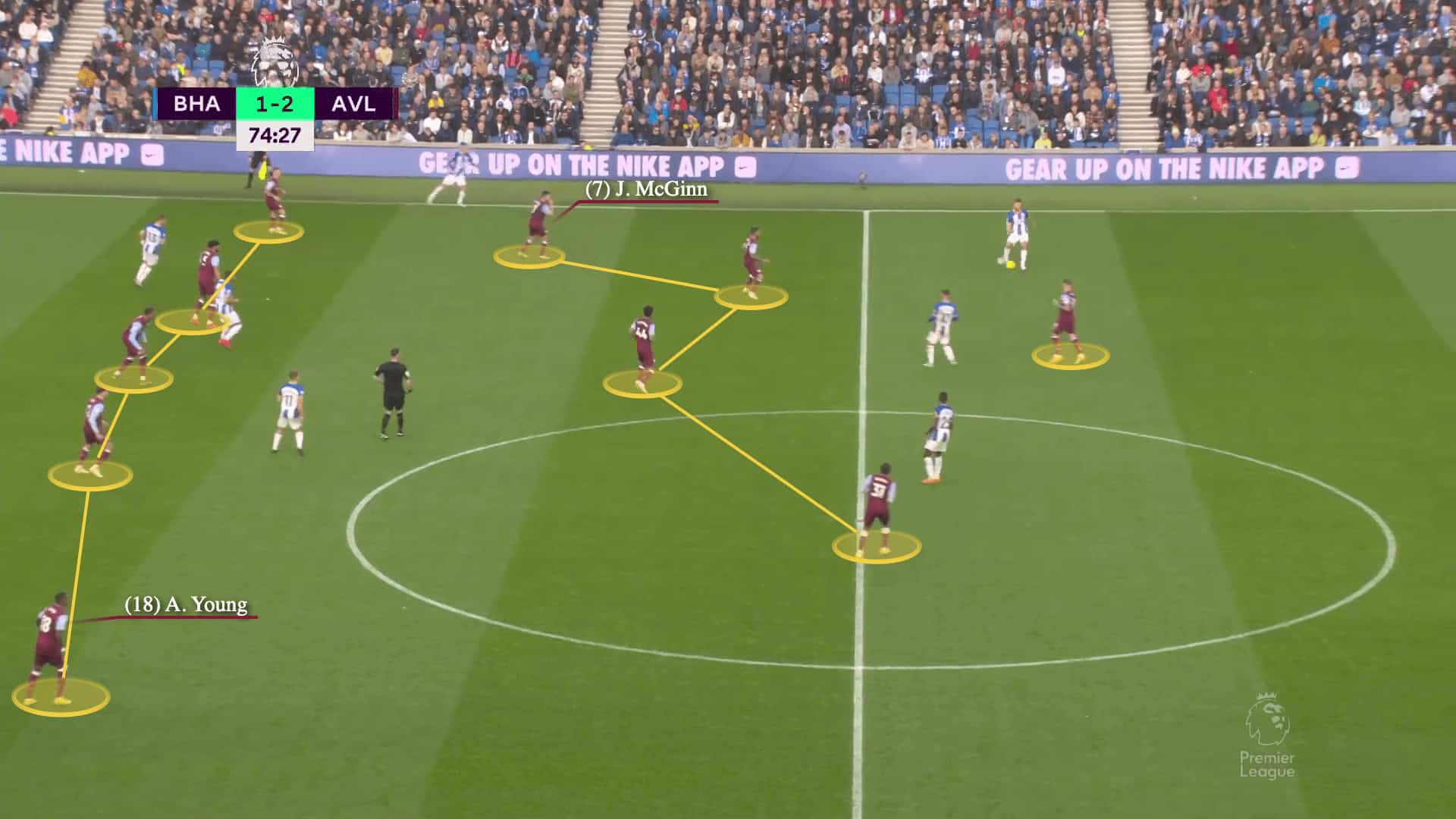 To defend Brighton’s approaching attacks after scoring a goal, McGinn can be seen moving to the right-back position in the picture above.