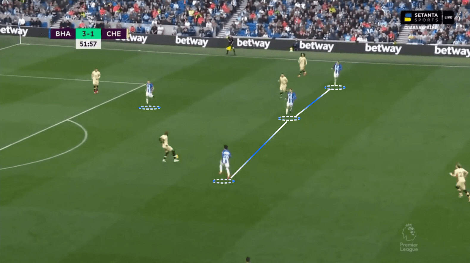 Roberto de Zerbi’s trademark in possession solutions and ideas panned out very profitable for Brighton in Potter’s return to the south of the country. The concept of “lure and exploit” created a lot of trouble for Chelsea’s defensive compactness and opened plenty of space for the home team to take advantage of. Also, the hybrid positioning and changes in Brighton’s formation that happened with Pascal Gross in the main role were an unsolvable obstacle for Potter and lead the home team into very beneficial isolations and space/time superiorities.
