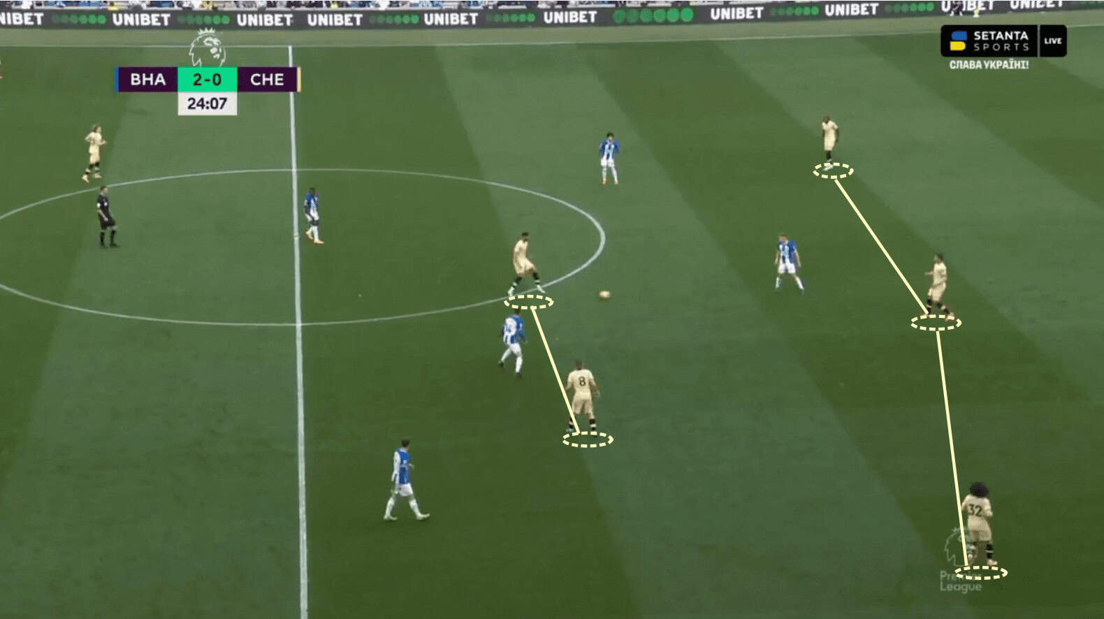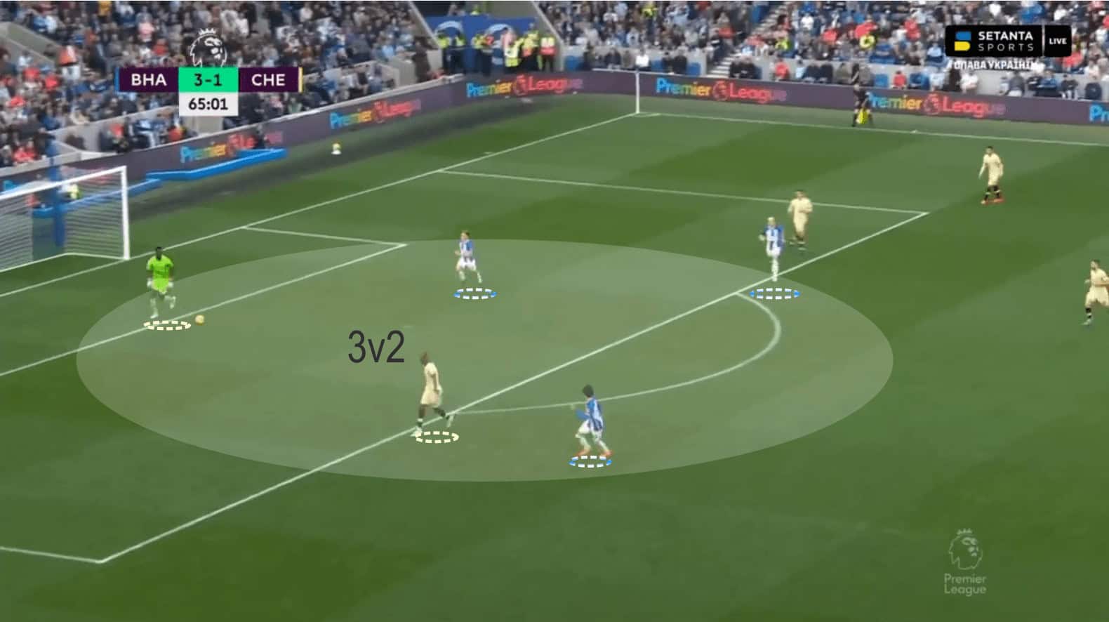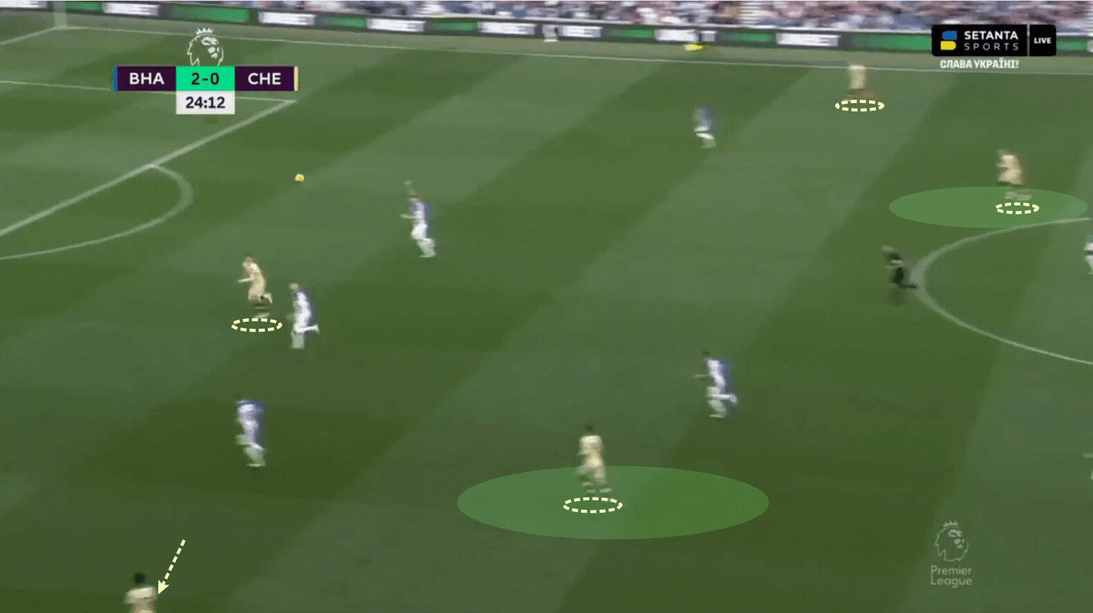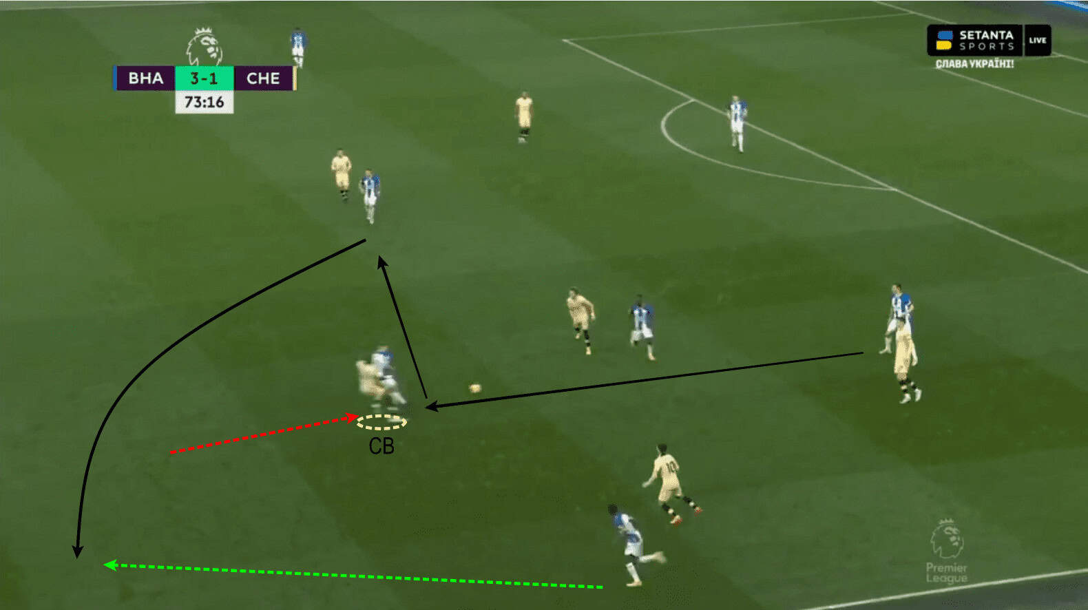 Creating a high-intense deficit setup for the opponent in a very dangerous area, prevented Chelsea from progressing with the plan vertically and going into more organized positional attacks more commonly. The away team had their game under control when the pressure was lower, and when they were allowed to move forward in a more well-thought manner, but De Zerbi’s pressing structure came in the way of doing that more often.