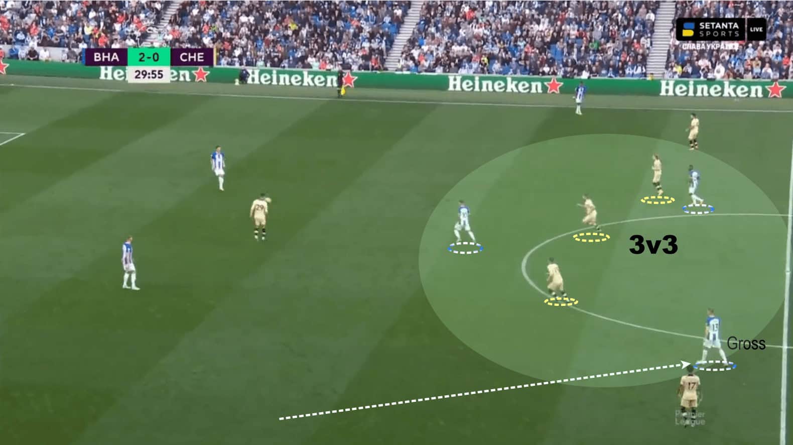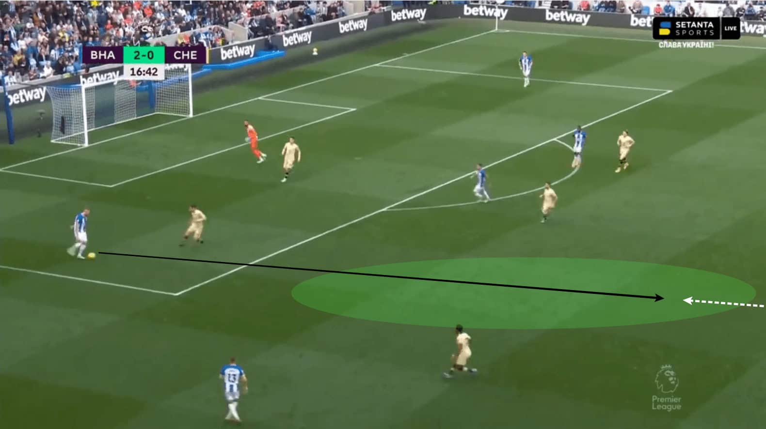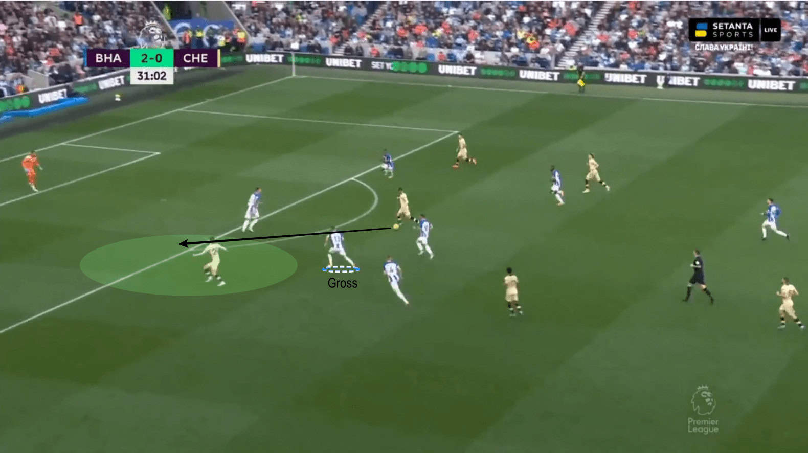 Even though the German’s positioning came out beneficial for Brighton in possession, they had some problems once their passes were intercepted and Gross was still inverted. That opened the space on the right-back position for the Chelsea players to exploit and they managed to do so in both halves of the game but the execution, once they got the ball in these situations, lacked in quality.