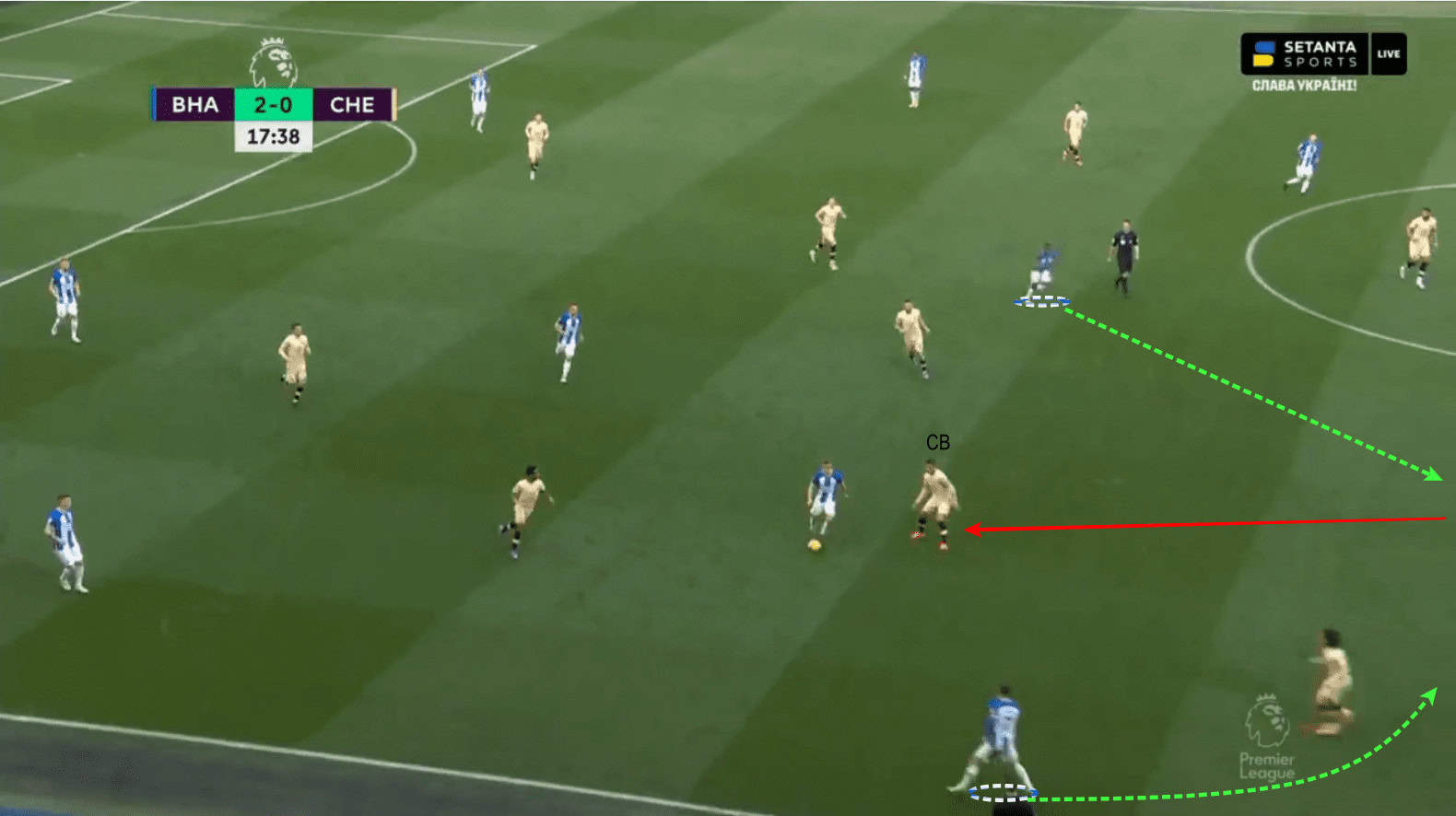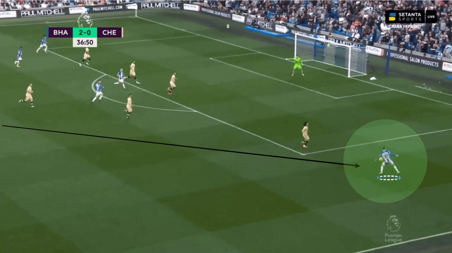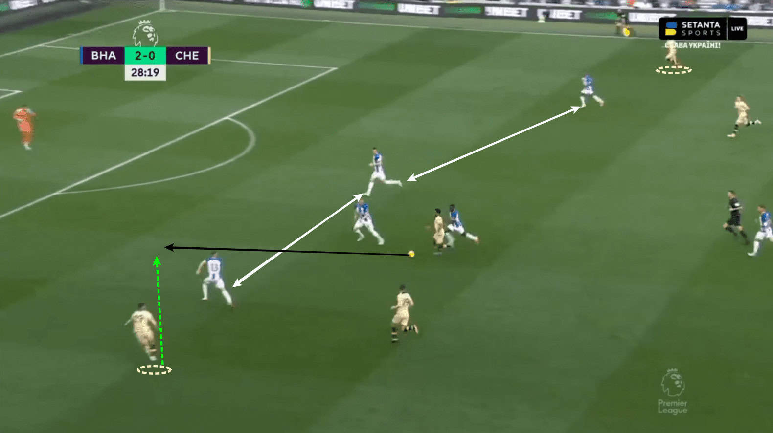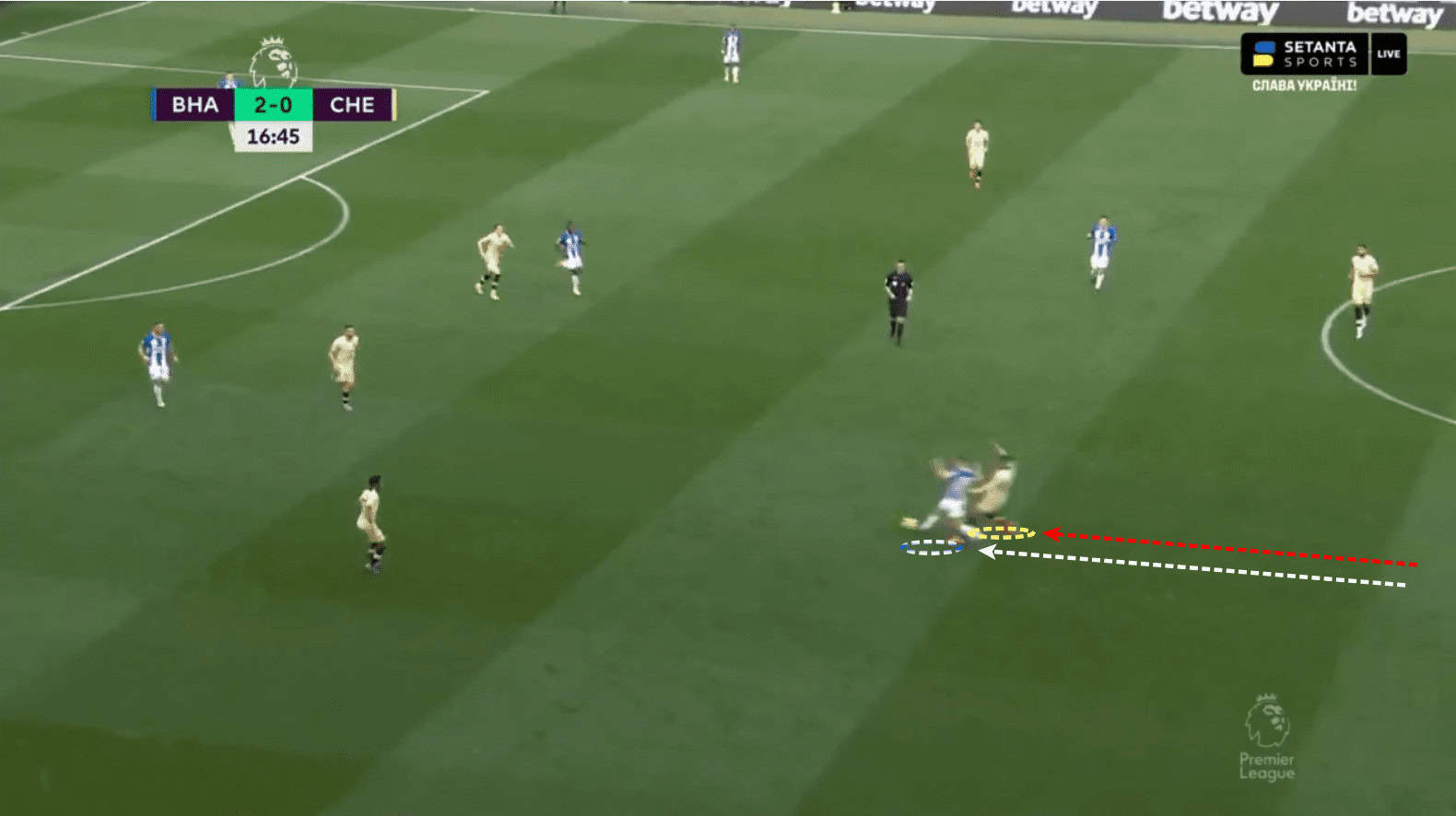 Even though the German’s positioning came out beneficial for Brighton in possession, they had some problems once their passes were intercepted and Gross was still inverted. That opened the space on the right-back position for the Chelsea players to exploit and they managed to do so in both halves of the game but the execution, once they got the ball in these situations, lacked in quality.