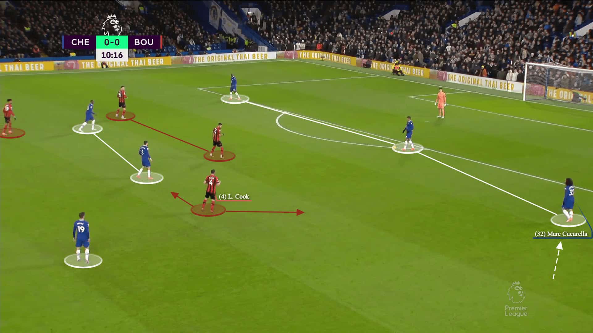 Potter seemed to use an asymmetric 4-3-3 in possession, with former Barcelona defender Marc Cucurella as a deep fullback playing outside the press and overloading the first line with the possibility of provoking one of the opposition’s midfielders to step higher to press him, hence Chelsea created a 3v2 superiority earlier against the duo strikers of Bournemouth who were responsible for pressing the centre-backs and close the passing lane to the midfielders during the Blues’ build-up play. Reece James stepped up and opened a wide pass option on the right channel.