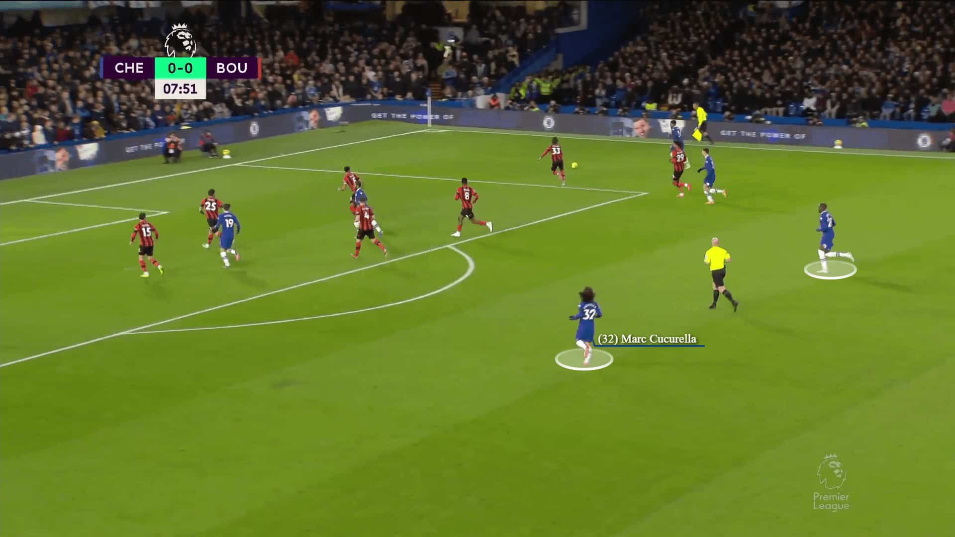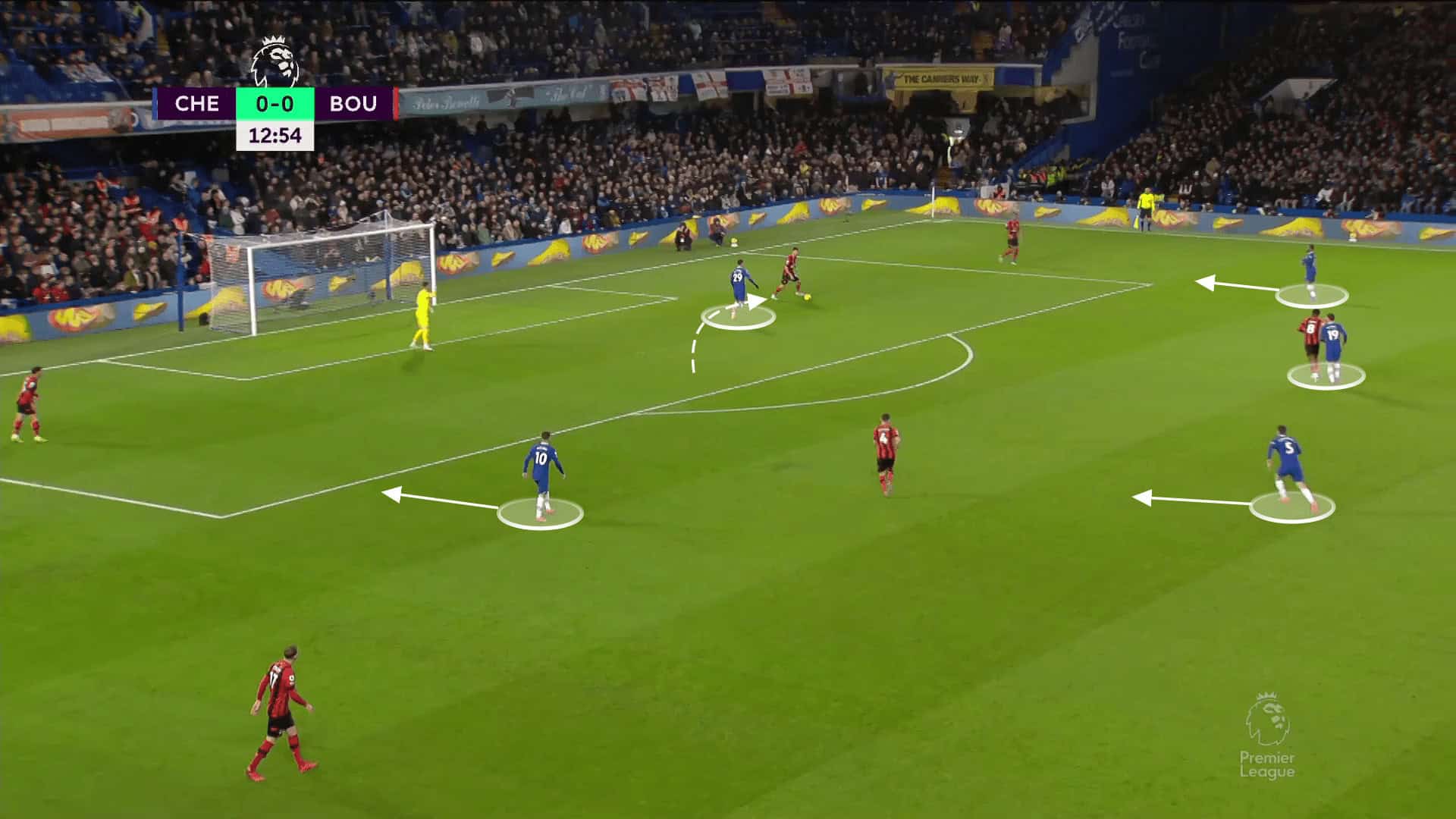 During the game, Bournemouth changed from a back five to a back four, yet the Blues continued their dominance in the Cherries’ half by implementing wide triangles and quick movements toward the backline. They did so by creating wide dynamic triangles and passing combinations to force the defenders to leave their positions and then creating 1v1 wide situations while a large number of players aimed to attack the box waiting for the delivery.