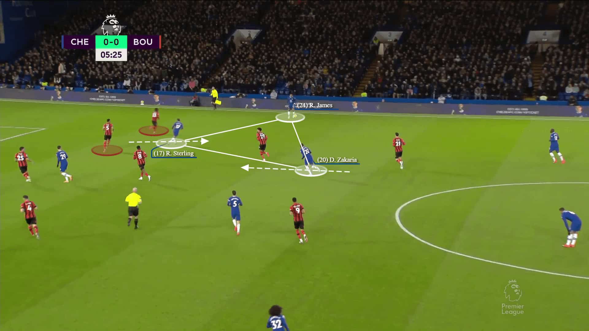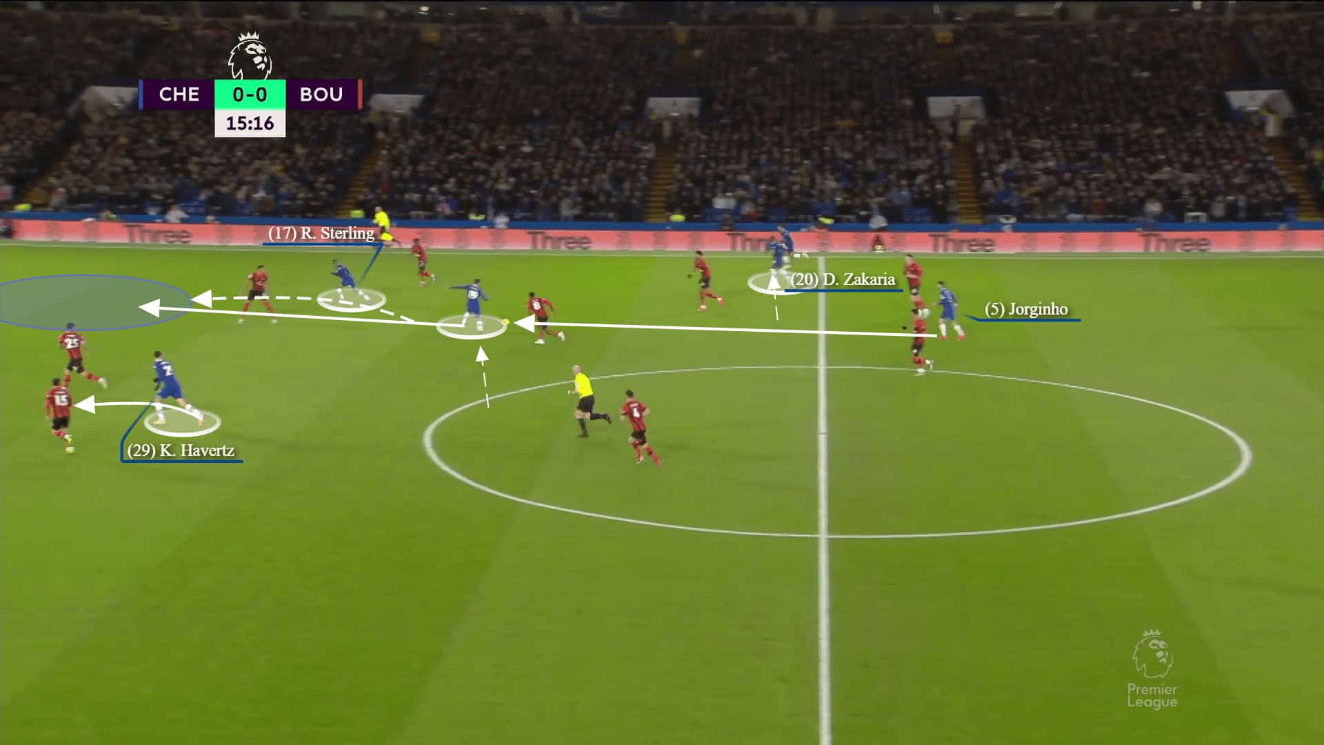 In the above image, while Denis Zakaria had dragged his marker away which opened the right channel, Mason Mount and Raheem Sterling were there overloading the half-space with bad tracking from Bournemouth’s midfield. Mount with a positive body direction received the progressive pass from Jorginho whilst Sterling had run toward the space behind the backline having the dynamical advantage over the defender. Havertz, who positioned himself between the centre-backs made them busy, did a good vertical movement and then scored after a pretty cross.