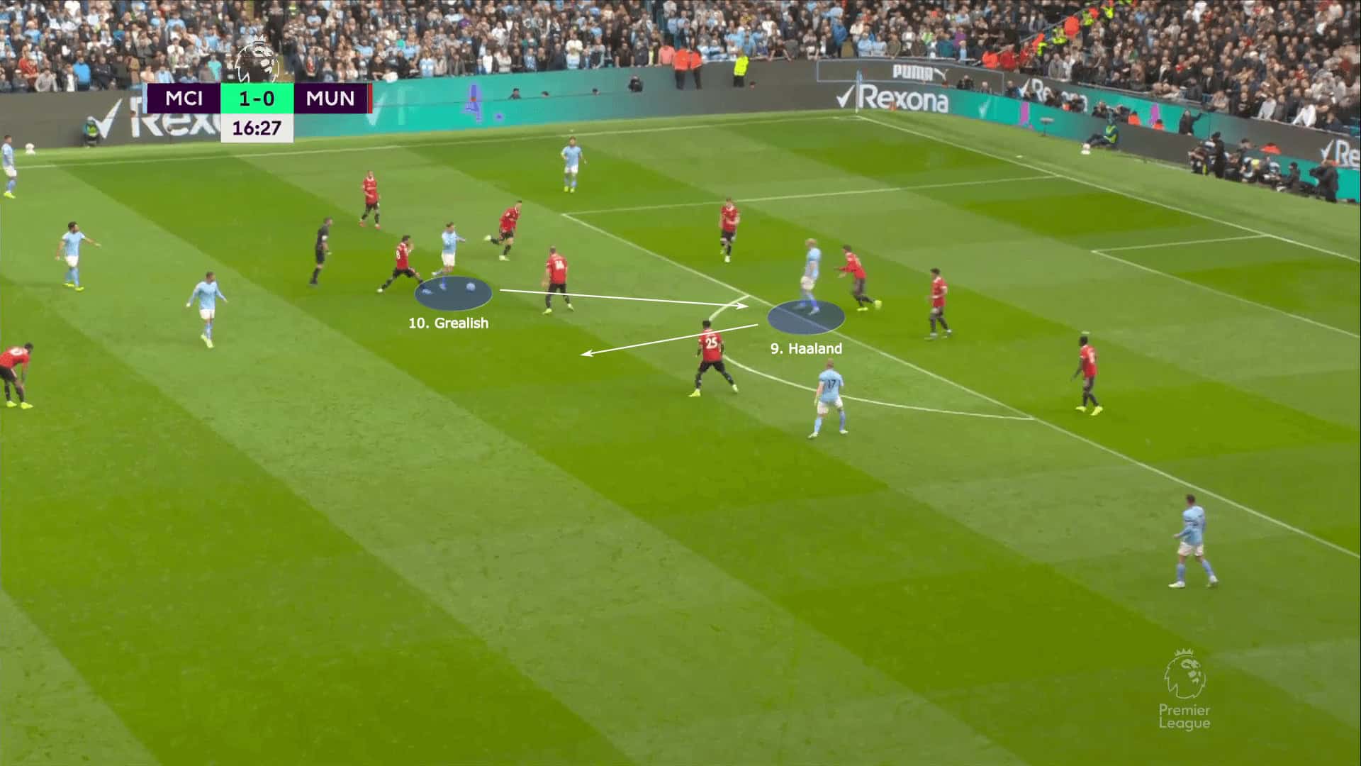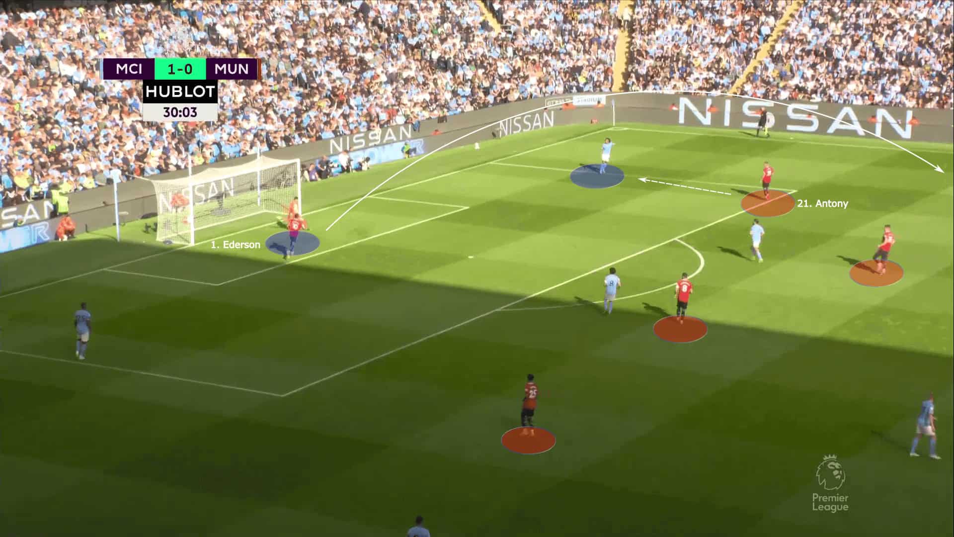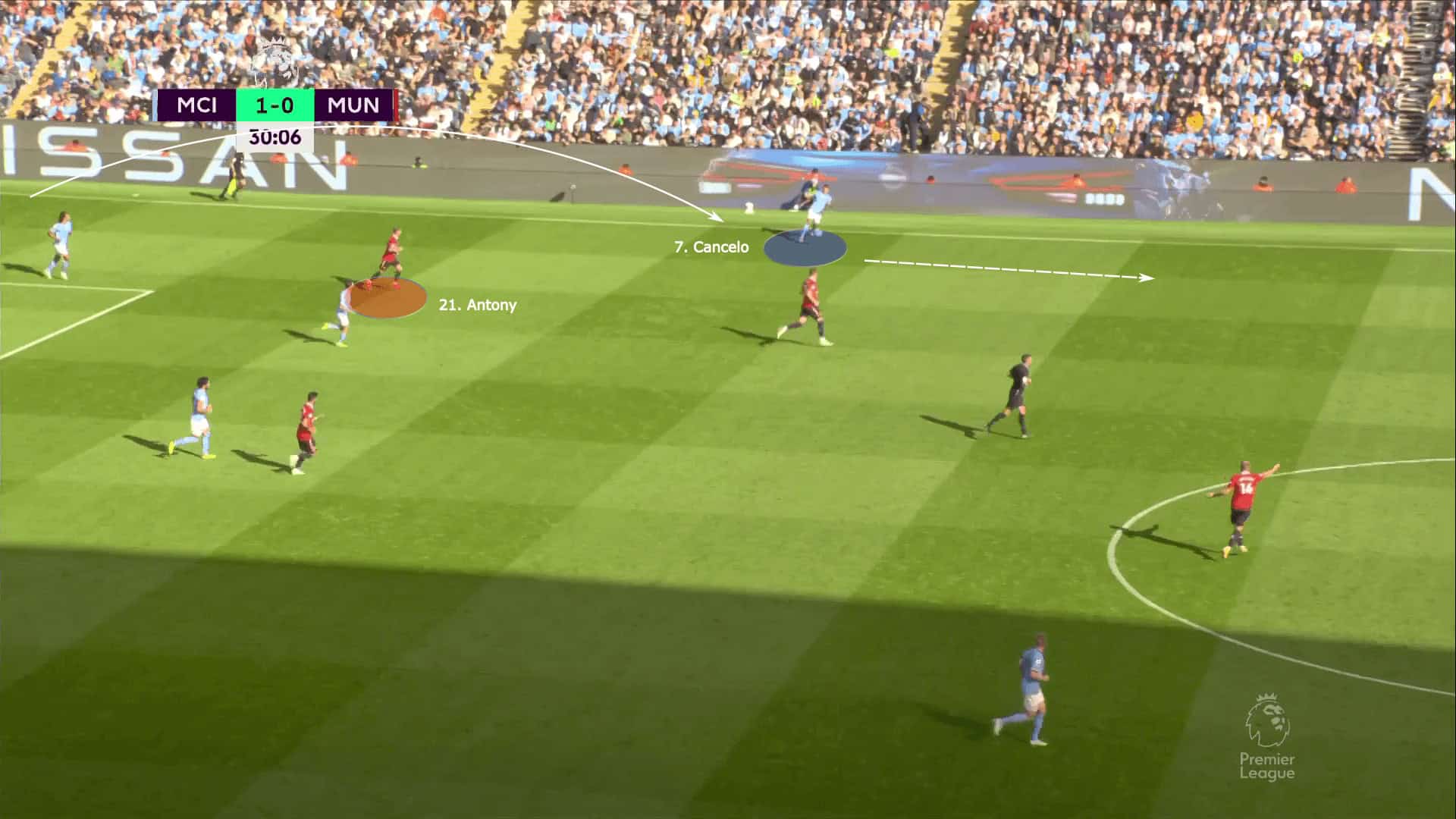 If Antony and Sancho tucked inside and did not cover their full-backs, City could play it wide to their feet – as Diogo Dalot and Tyrell Malacia were pinned back by Foden and Grealish.
