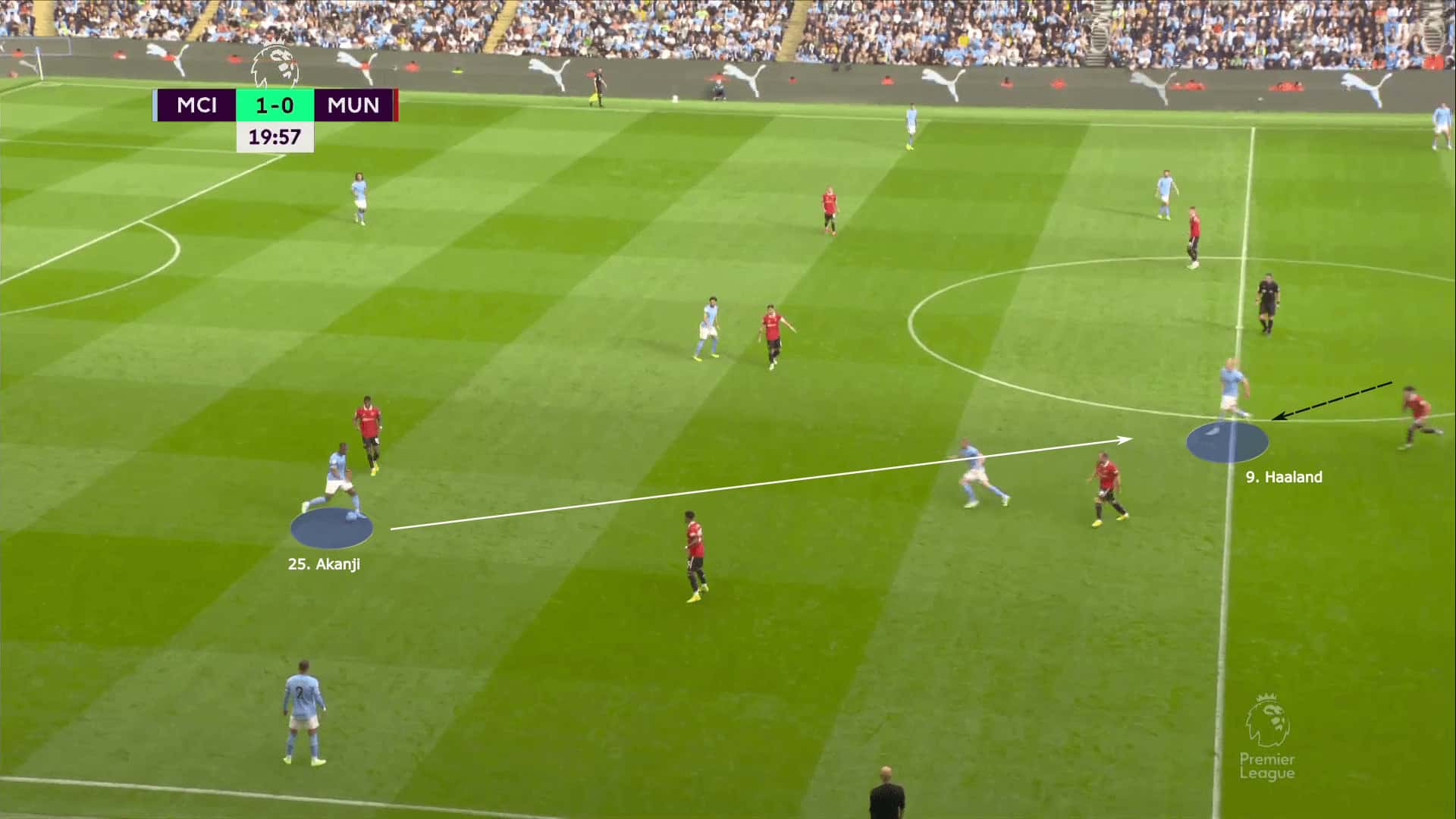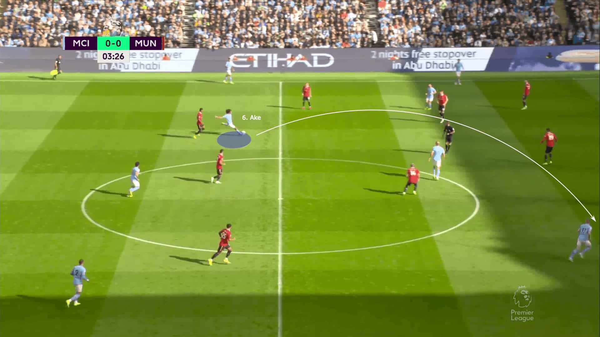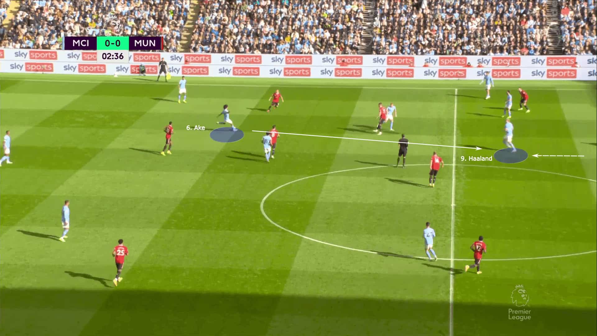 Haaland collects the football from his former Dortmund teammate and plays a back pass to Aké. From there, Rashford has been taken out of the game and cannot close down the Dutch international in time. He dribbles forward, attracting pressure and forcing another United player, Fernandes, to step up.