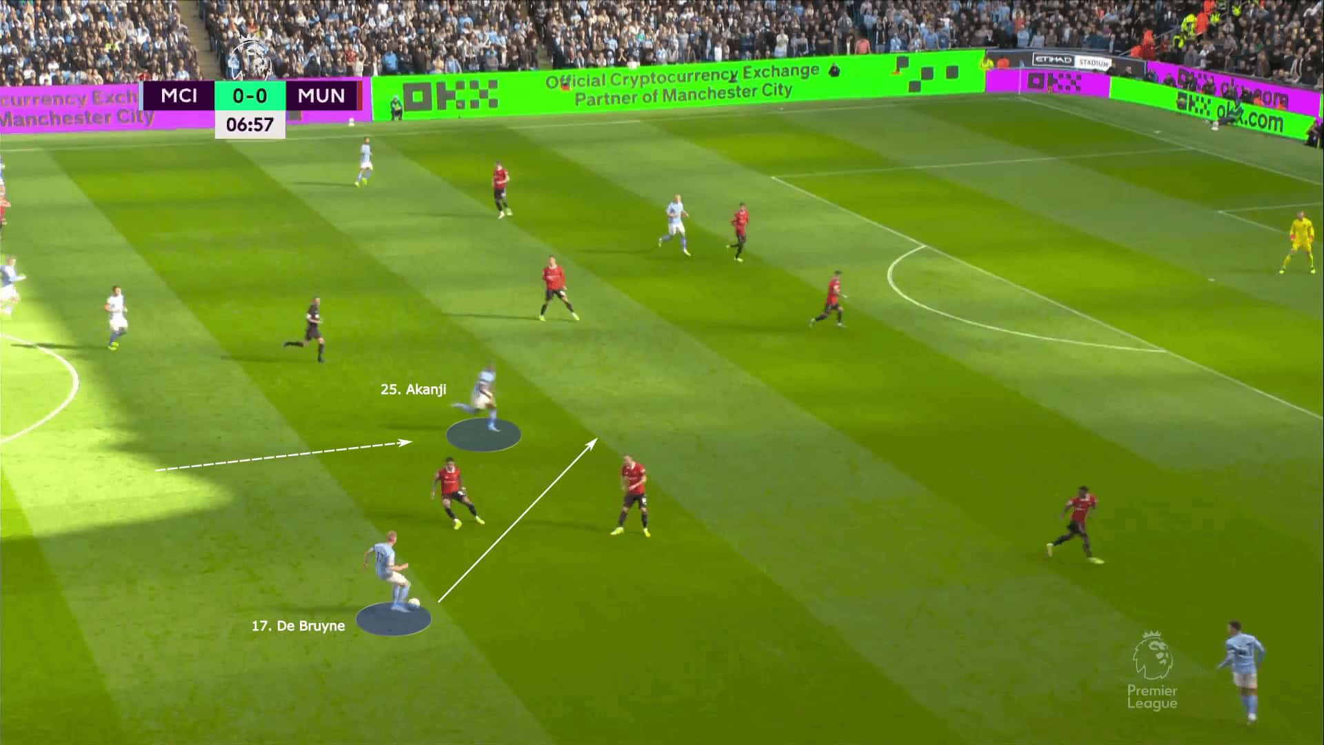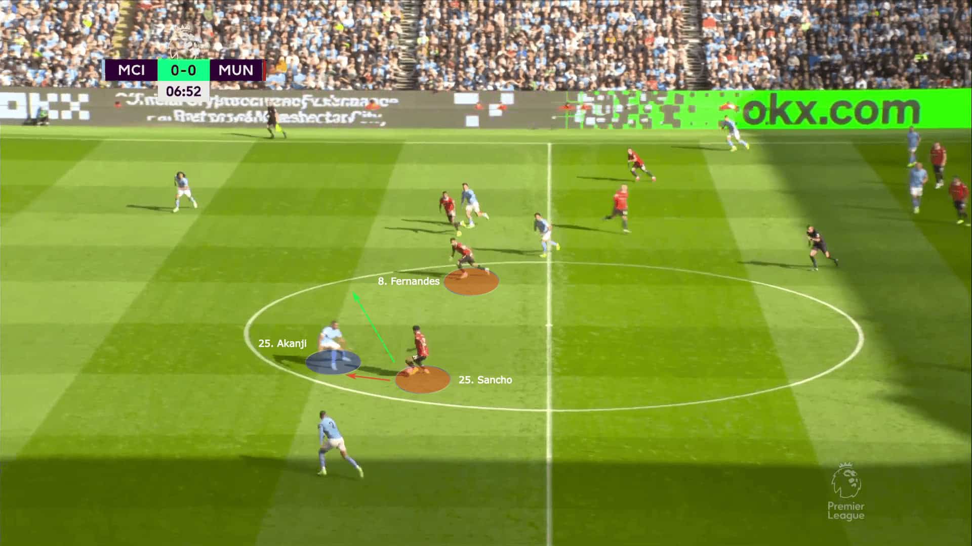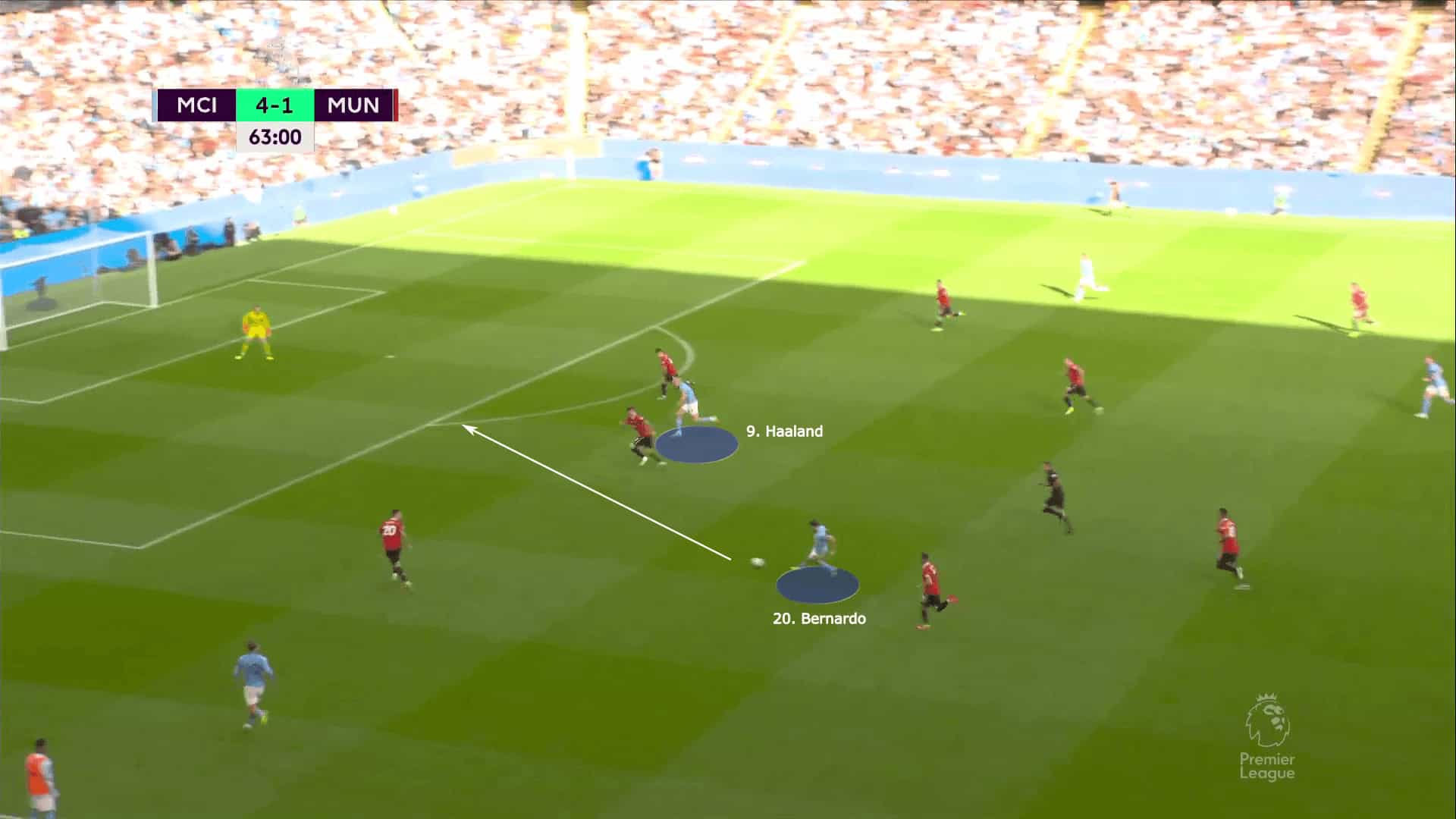 Haaland collects the football from his former Dortmund teammate and plays a back pass to Aké. From there, Rashford has been taken out of the game and cannot close down the Dutch international in time. He dribbles forward, attracting pressure and forcing another United player, Fernandes, to step up.