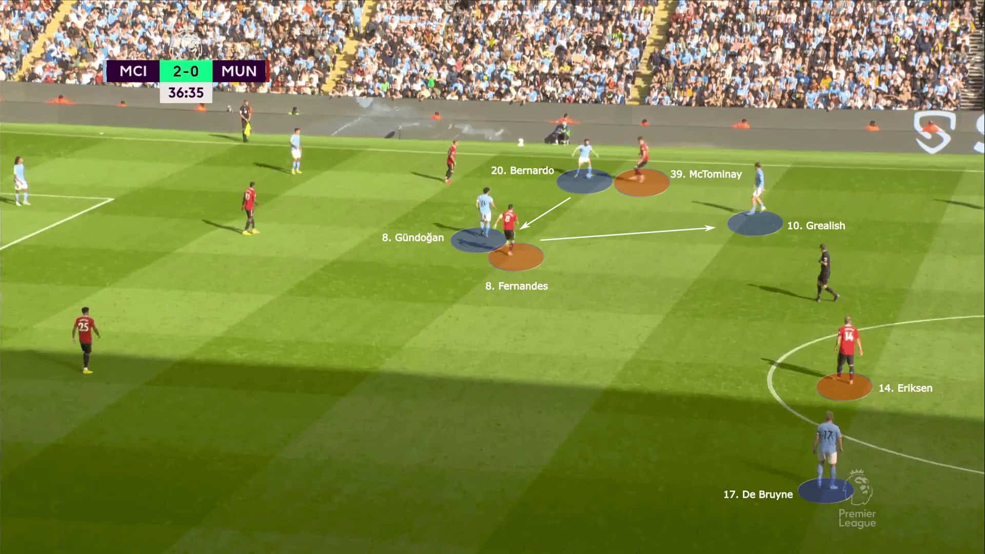 United’s front three are all positioned behind Gündoğan. McTominay and Eriksen were tasked to with staying tight to Silva and De Bruyne throughout the game but ended up chasing shadows. This left Grealish with acres of grass to run into when receiving the ball after this sequence, leading to goal No.3.