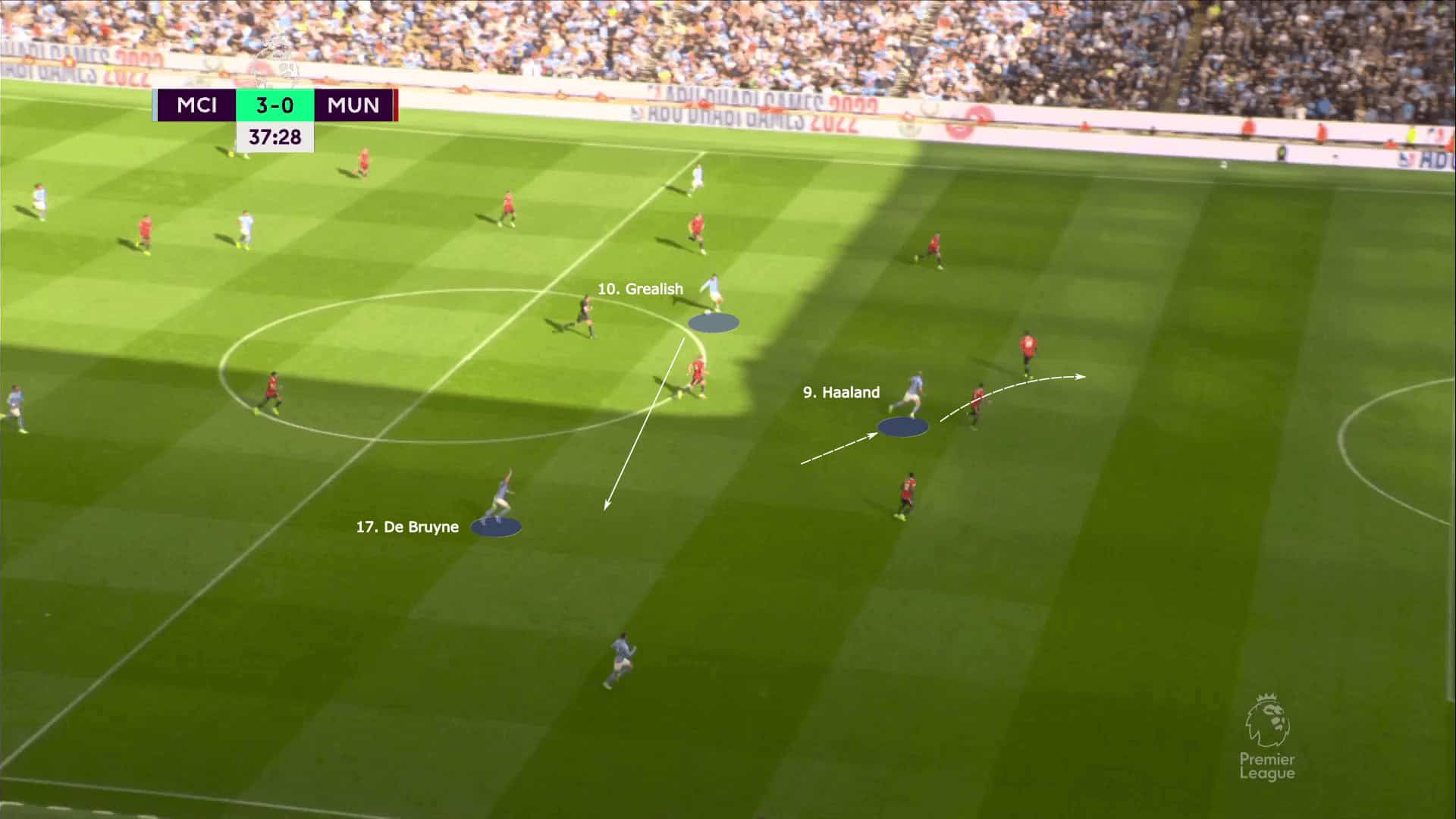 City’s £100m man drives forward with the ball uncontested and finds De Bruyne in the right channel. Haaland’s movement pins back Varane and Martinez – United’s front six are back-pedalling.