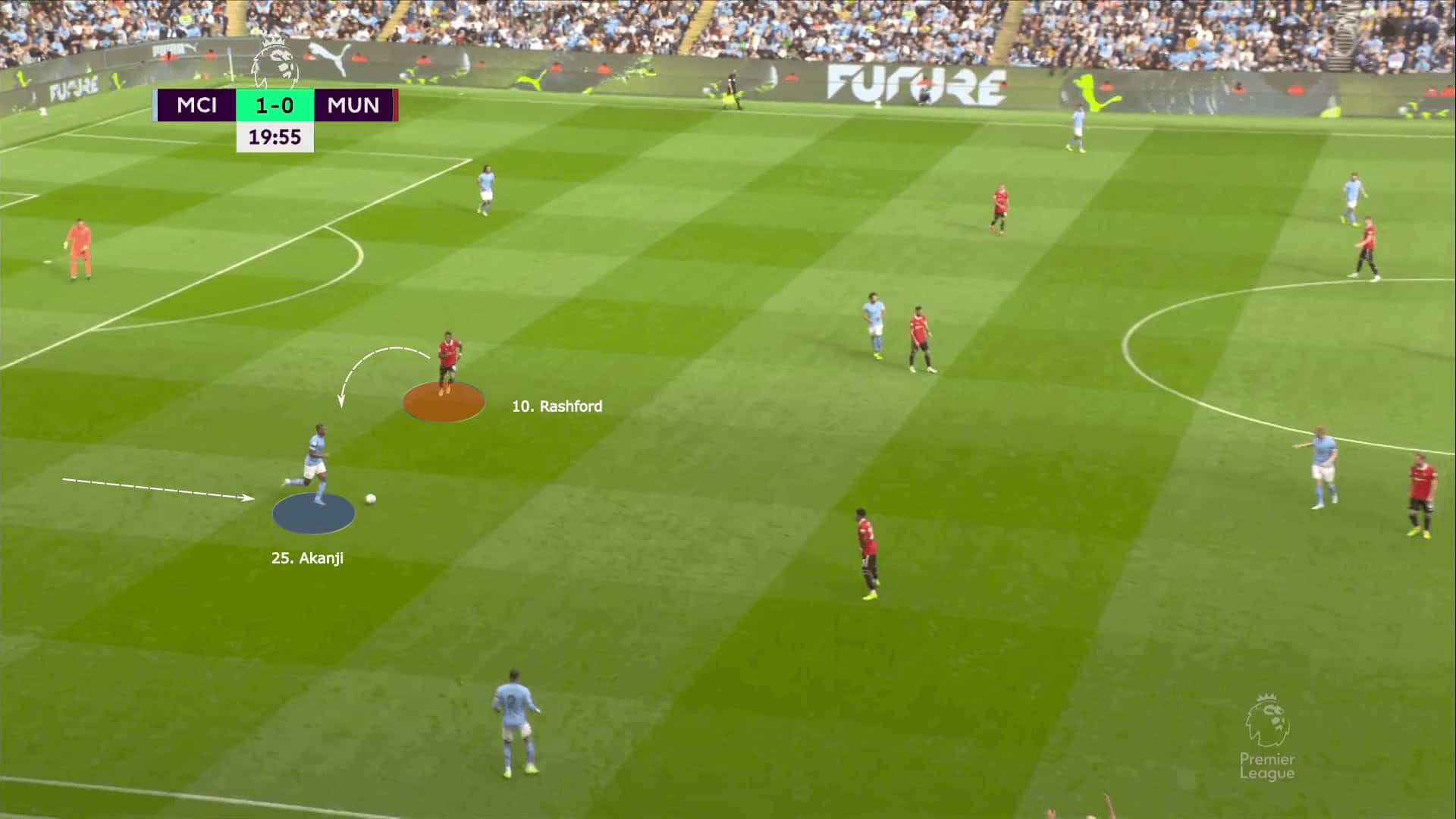 The early signs were that Manchester City had a 2v1 overload against Rashford at the back. They exploited this with Akanji and Aké aggressively dribbling forward to gain space and create gaps.