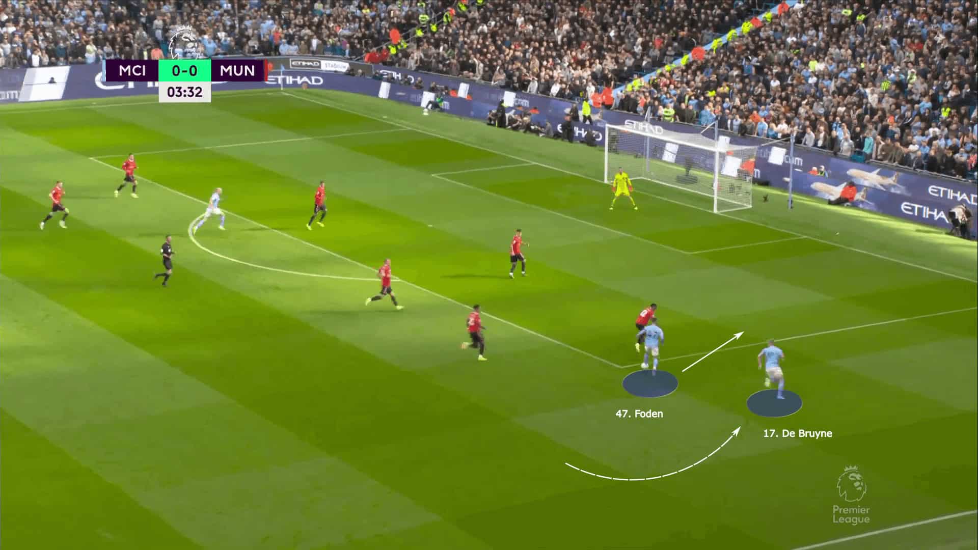 De Bruyne receives the ball in a 2v1 overload with Foden, which prevents Malacia from closing down the Belgian and allows De Bruyne to dribble into the space created.