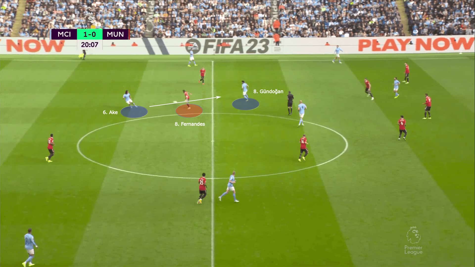Bruno, who is initially focusing on the positioning of Gündoğan, decides that he needs to start helping out higher up and blocks Aké’s progress. The City captain, though, makes a run behind him, and Aké can slip the ball easily into his path. Now, City are on the attack.