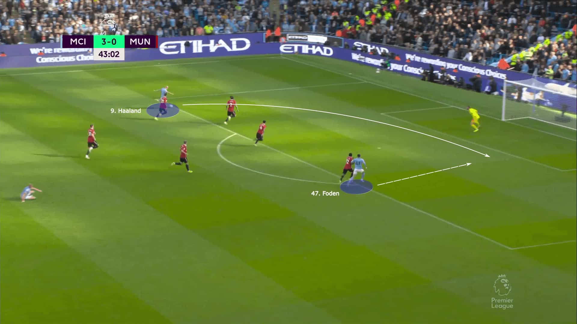 Foden controls the ball and Kevin De Bruyne charges on the overlap, creating a 2v1 overload with Malacia. The Belgian drilled in the game’s first dangerous cross into the box towards Haaland, which was cleared by the defenders after multiple blocks.
