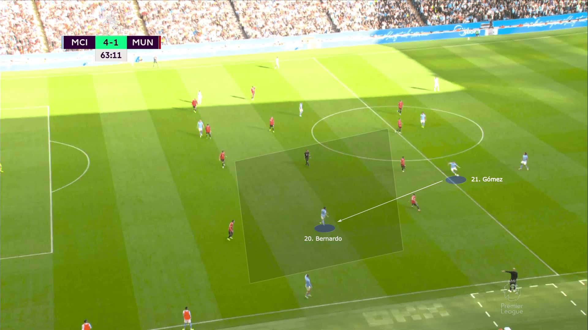 Bernardo would either pin Dalot inside, creating space wide for Grealish or continue his run into the box. Dalot would often be torn between following Silva’s run or staying with Grealish, the ball carrier. Antony and Sancho rarely tracked back to help out their full-backs, which left Dalot and Malacia exposed.