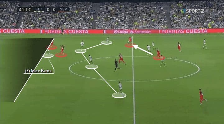 But while playing around the Betis high press was one thing, playing through their backline would prove to be trickier. The Betis back 3 was marshalled by La Masia graduate Marc Bartra, still relatively new to Betis after a January move. Bartra acted as a sweeper, playing centrally and sitting deeper than his fellow centre-backs. As soon as Betis made it through the Betis midfield, Bartra would step forward and initiate an offside trap. This caught Sevilla forwards offside often as they looked to make quick forward runs in transition.